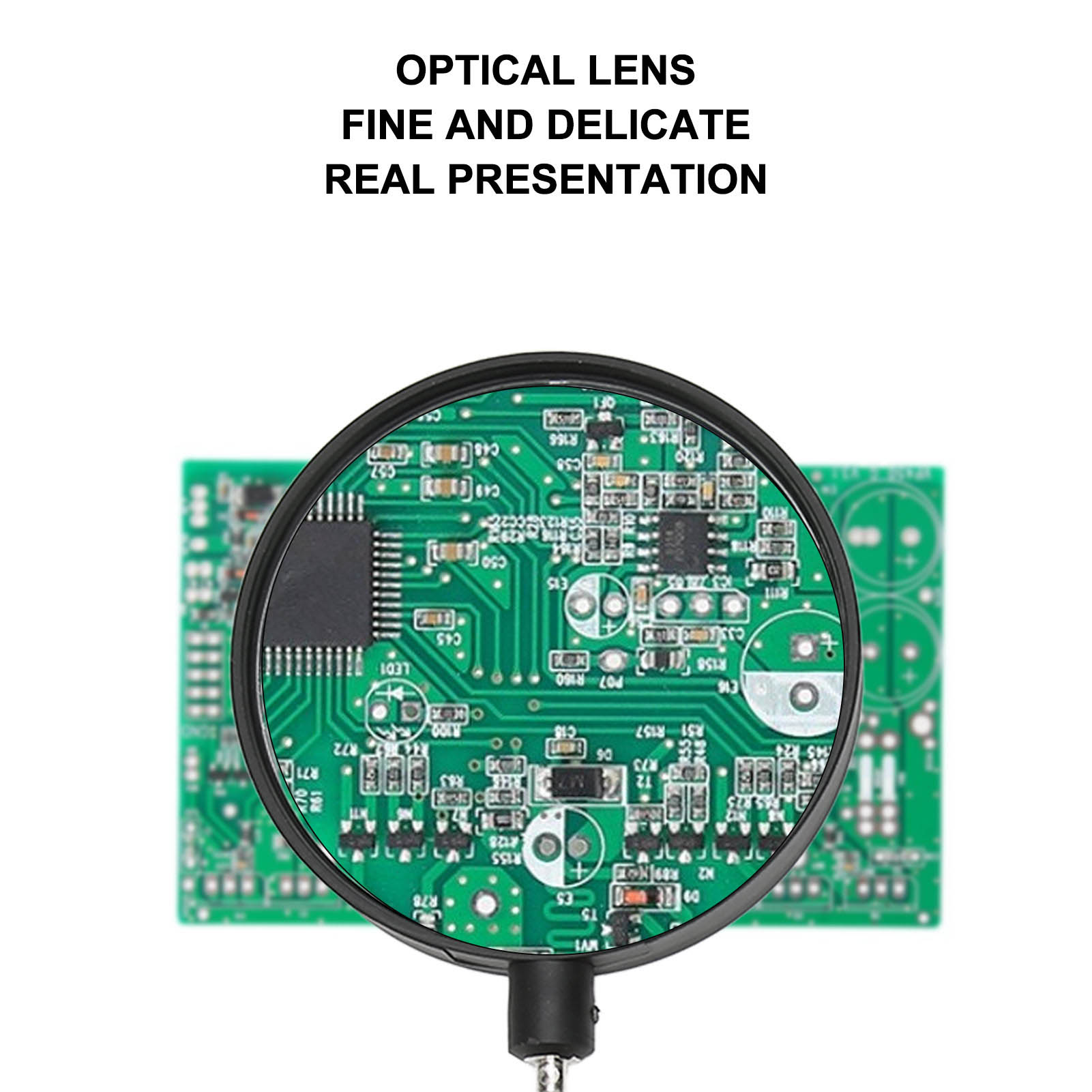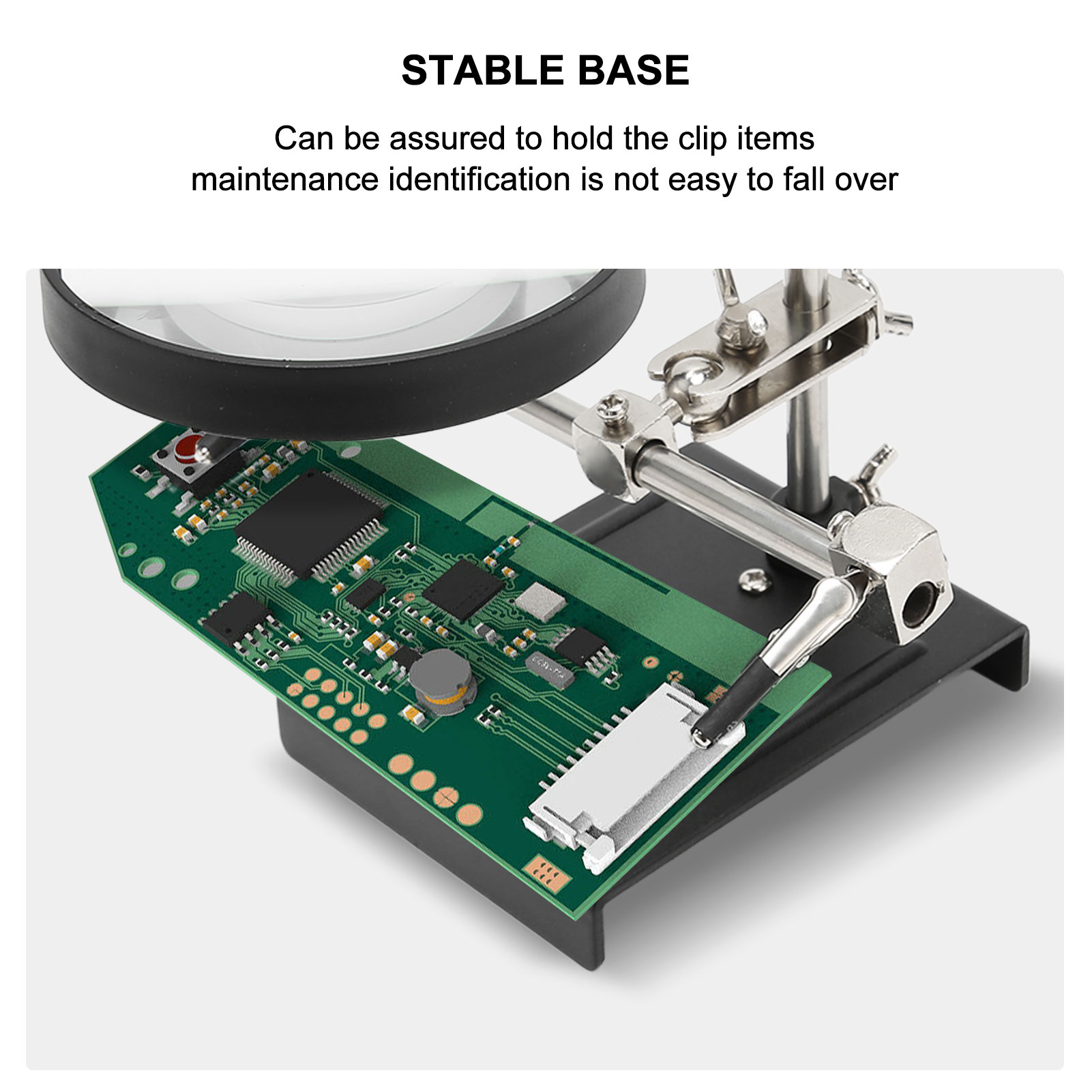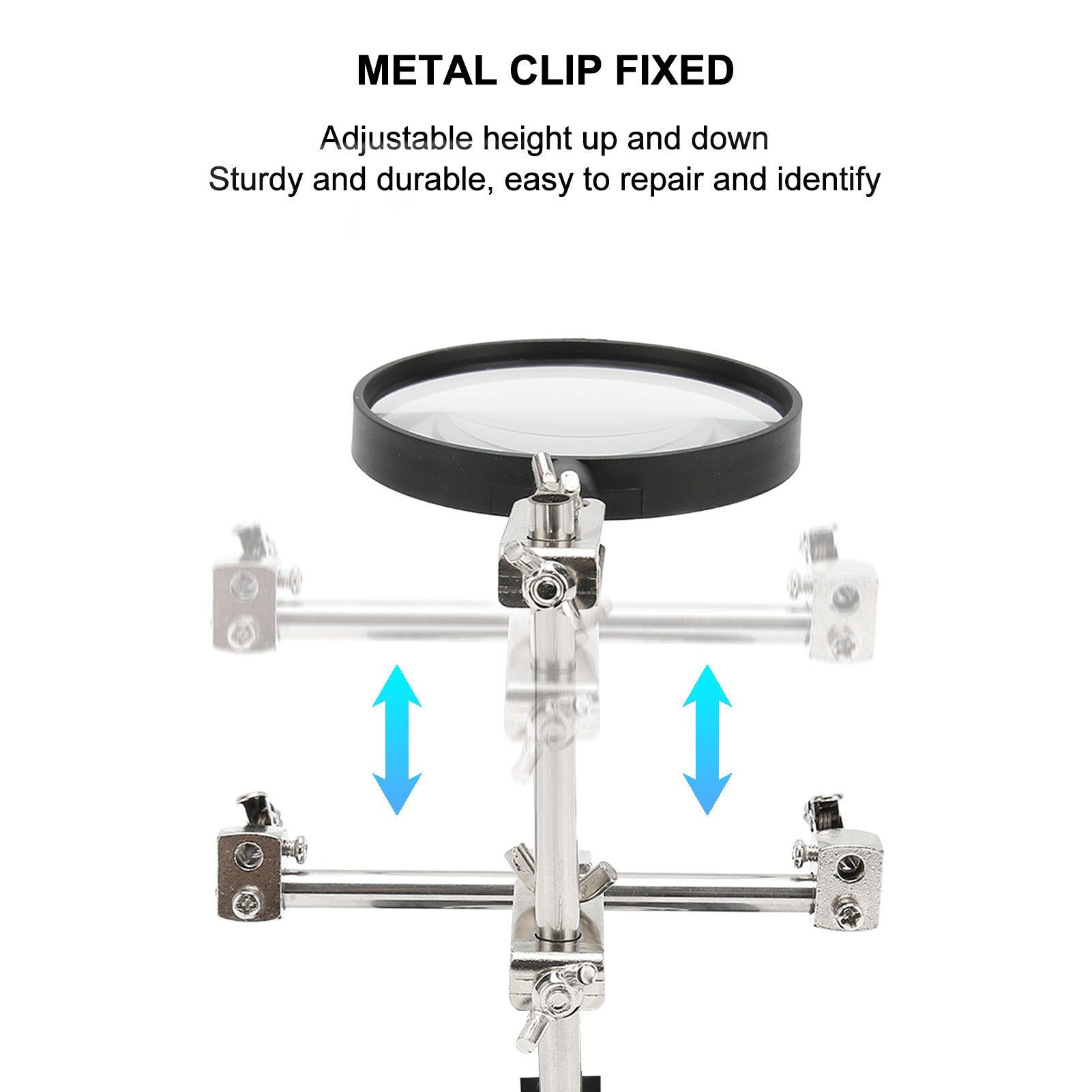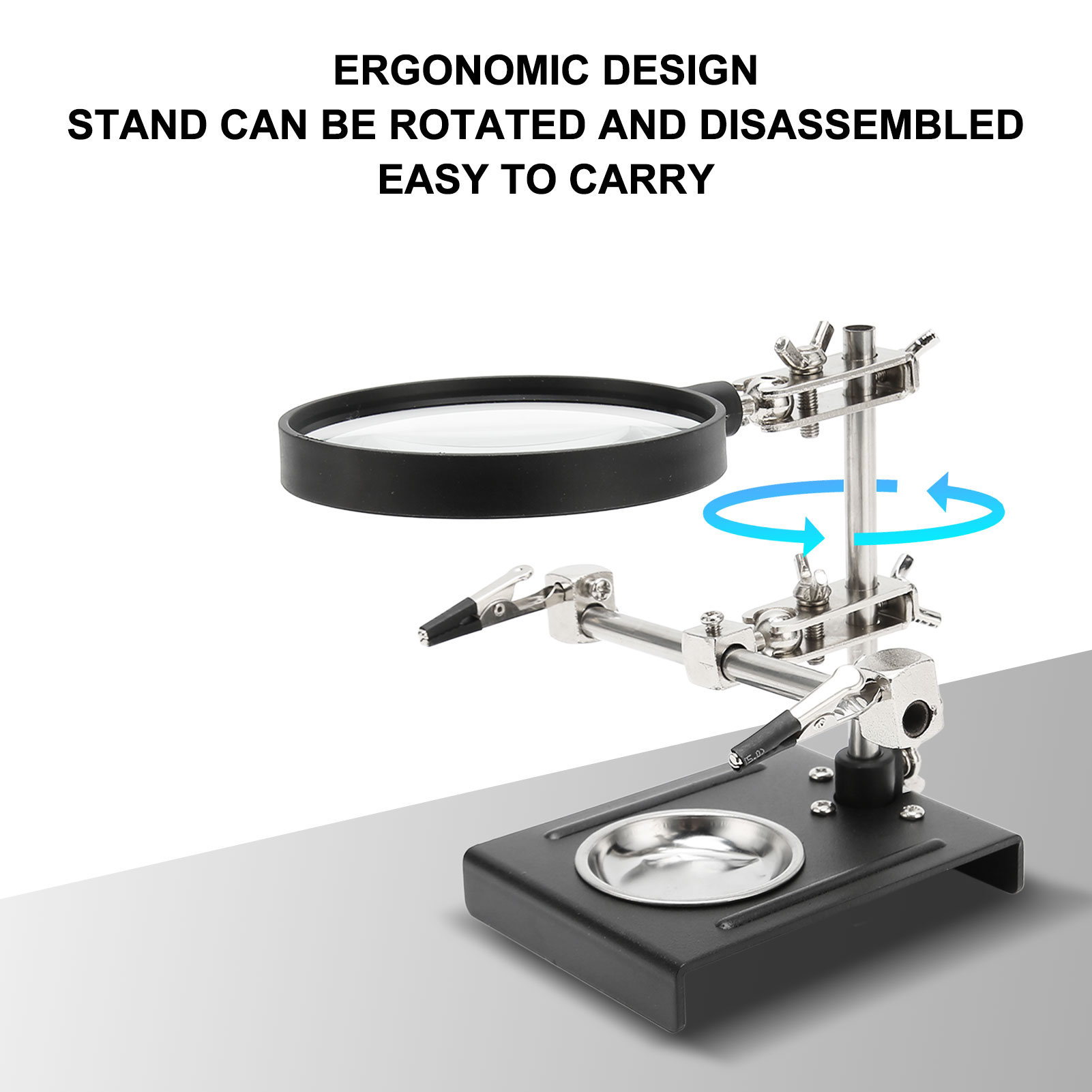 1、Optical Lens: Magnifying glass adopts optical lens, long time to see not dizzy, exquisite and delicate, true to present. 2、Foldable: Magnifier soldering station is adjustable, foldable, quick and easy to store, more convenient to use. 3、Ergonomic Design: Magnifier soldering station with ergonomic design, the bracket can be rotated and disassembled, easy to carry. 4、Adjustable Height: Metal clip fixed, adjustable height up and down, strong and durable, easy to repair and identify. 5、Stable Base: Magnifying glass station adopts a stable base, can be assured that the clip items, maintenance identification is not easy to fall over.