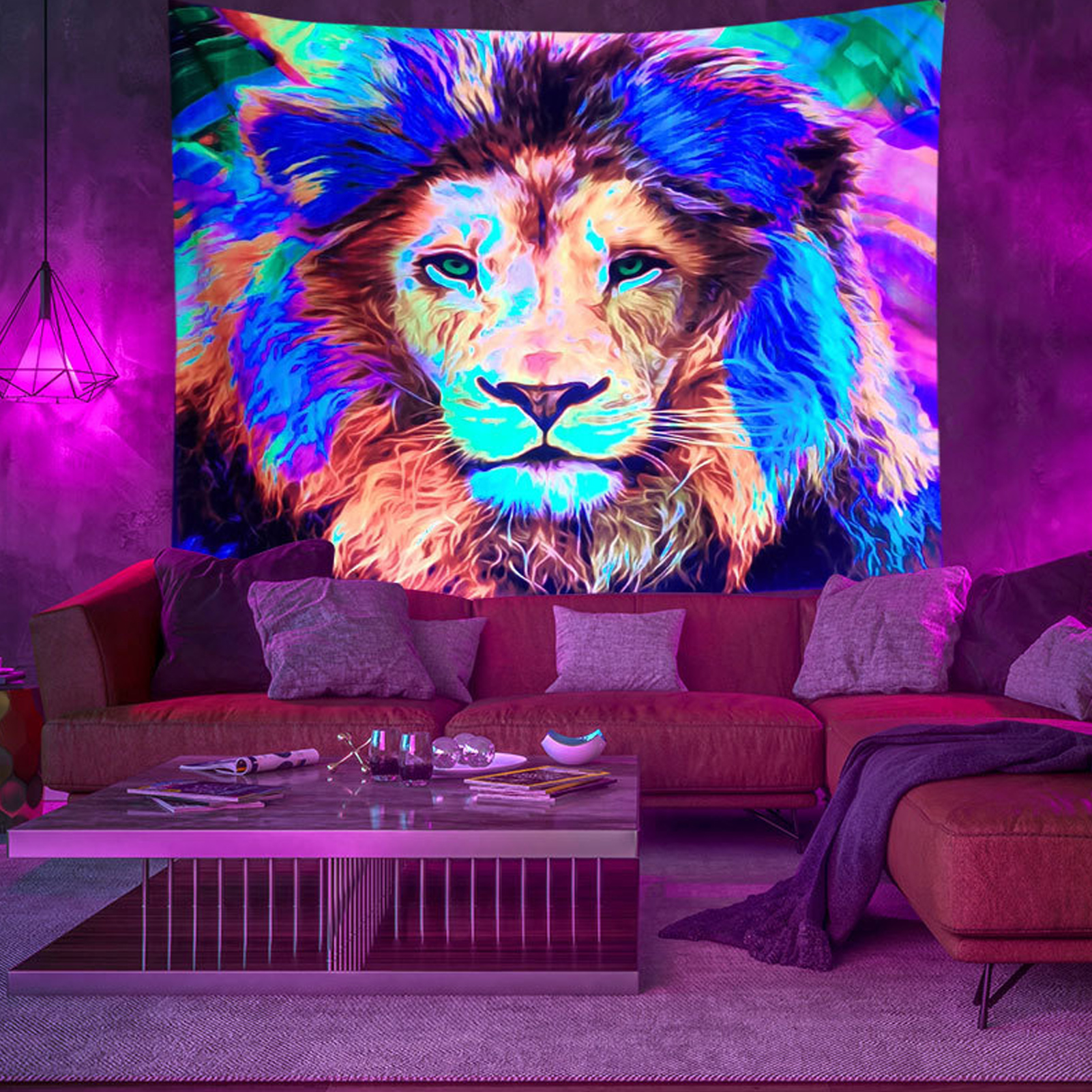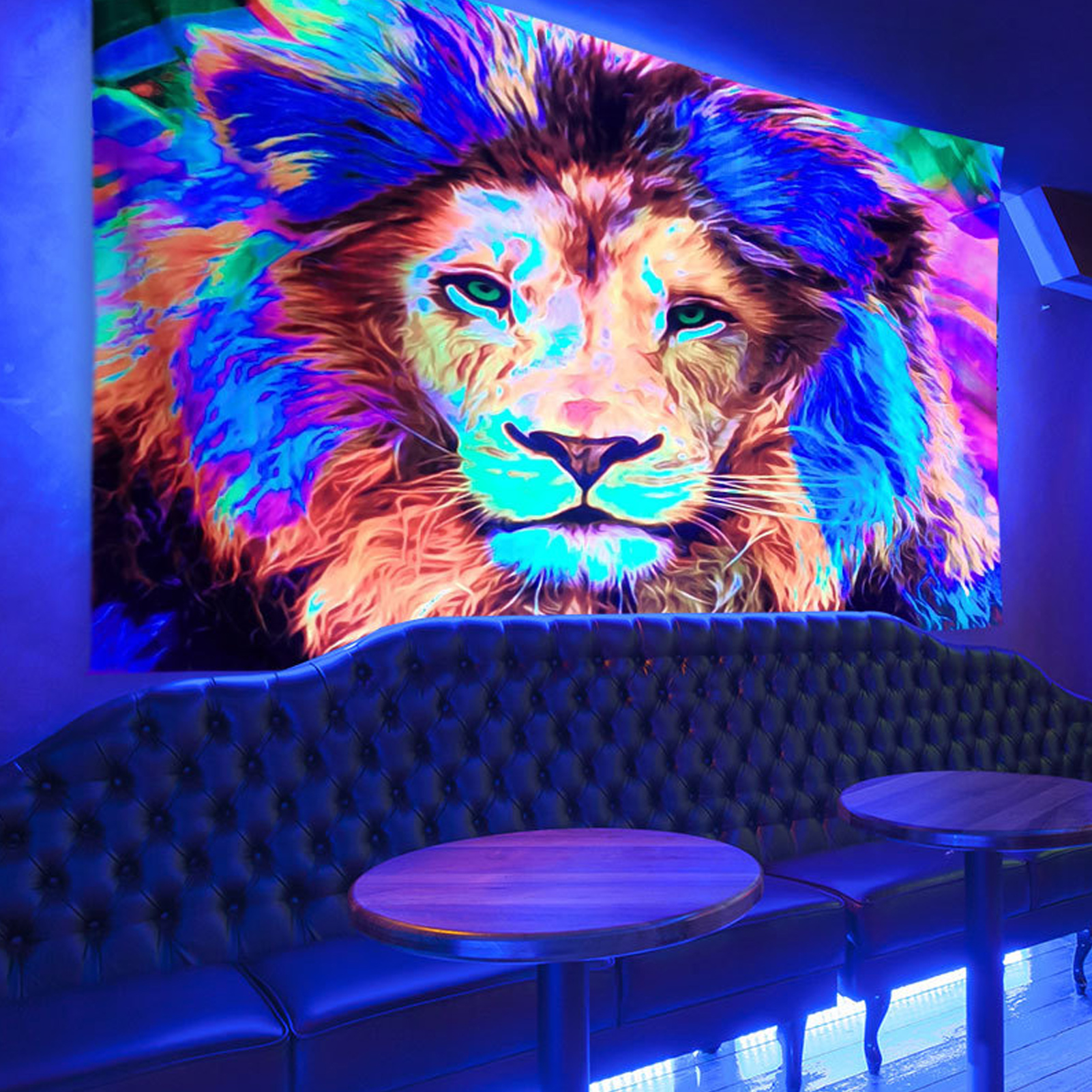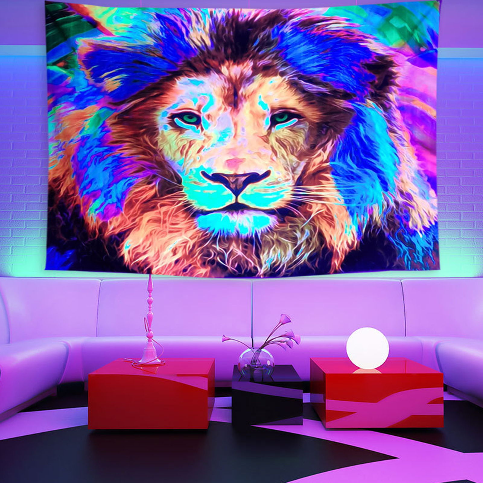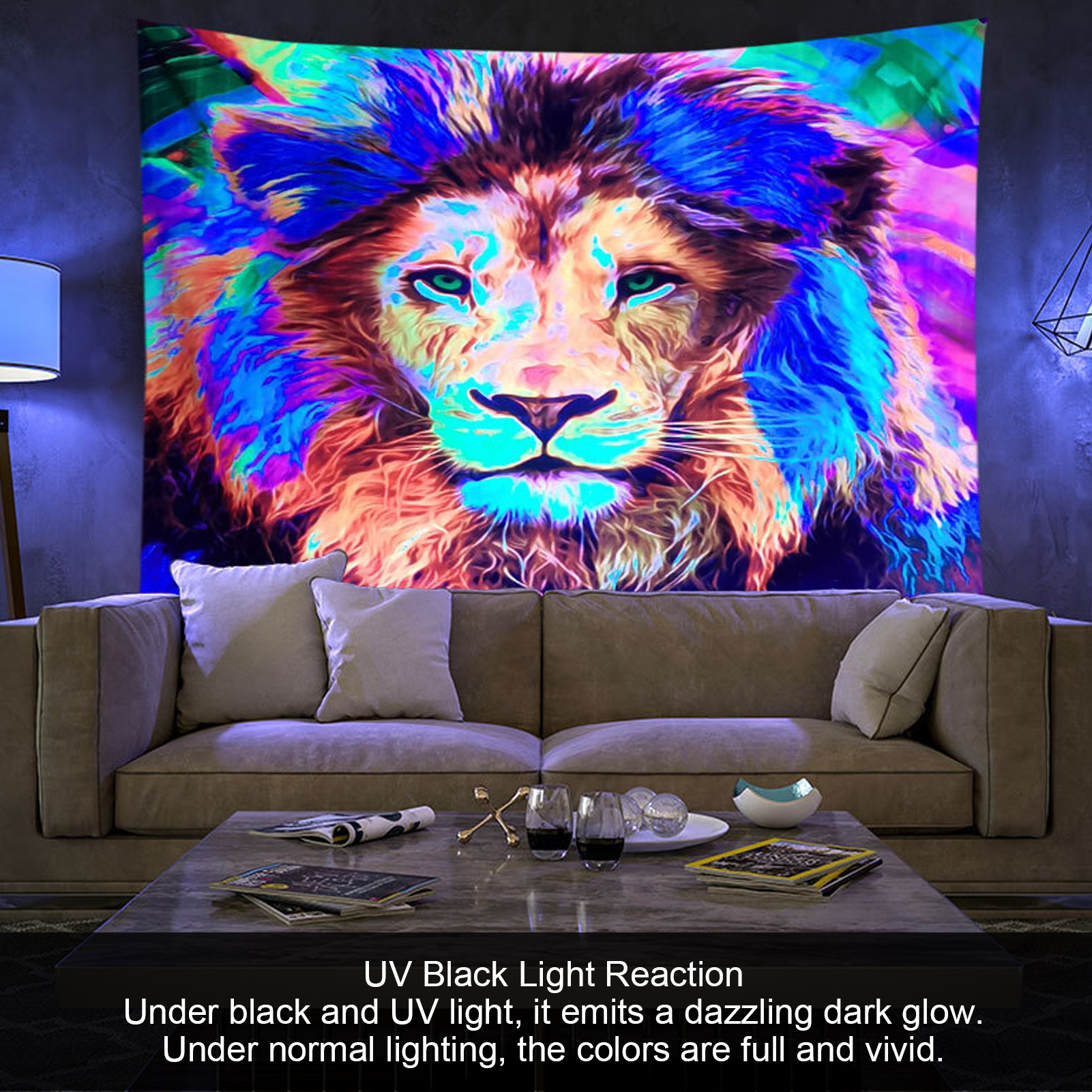 1、UV BLACK LIGHT REACTIVE: Under black and UV lamp, it will emit a dazzling dark glowing, under normal lighting, the colors are full and vivid. 2、LION PATTERN: UV tapestry features a lion pattern design with multiple elements, showcasing a amazing image that fills your room with mysterious and psychedelic colors. 3、SOFT COMFORTABLE: Fluorescent tapestry is made of polyester fiber, soft, comfortable, skin friendly, durable and easy to hanging. 4、WIDE USE:UV reactive tapestry is suitable for any scene and season, it can be used as wall hanging, picnic blanket, bedspread, beach towel and so on. 5、EASY INSTALLATION: Lion tapestry is easy to install, no need to spend much time, lightweight and portable, easy to use.