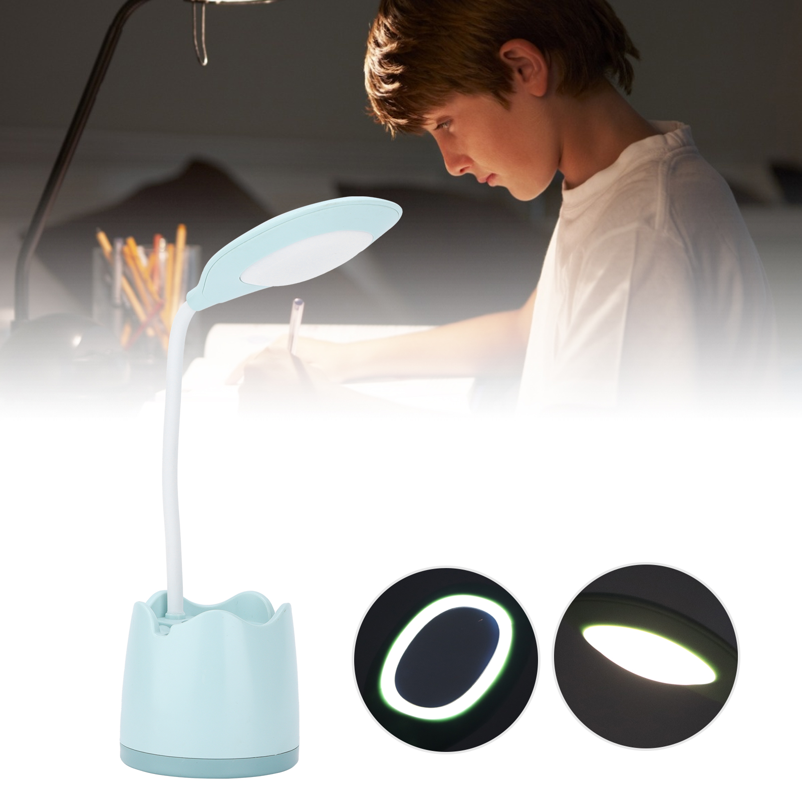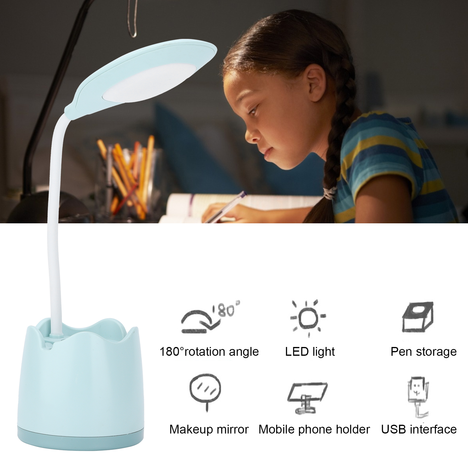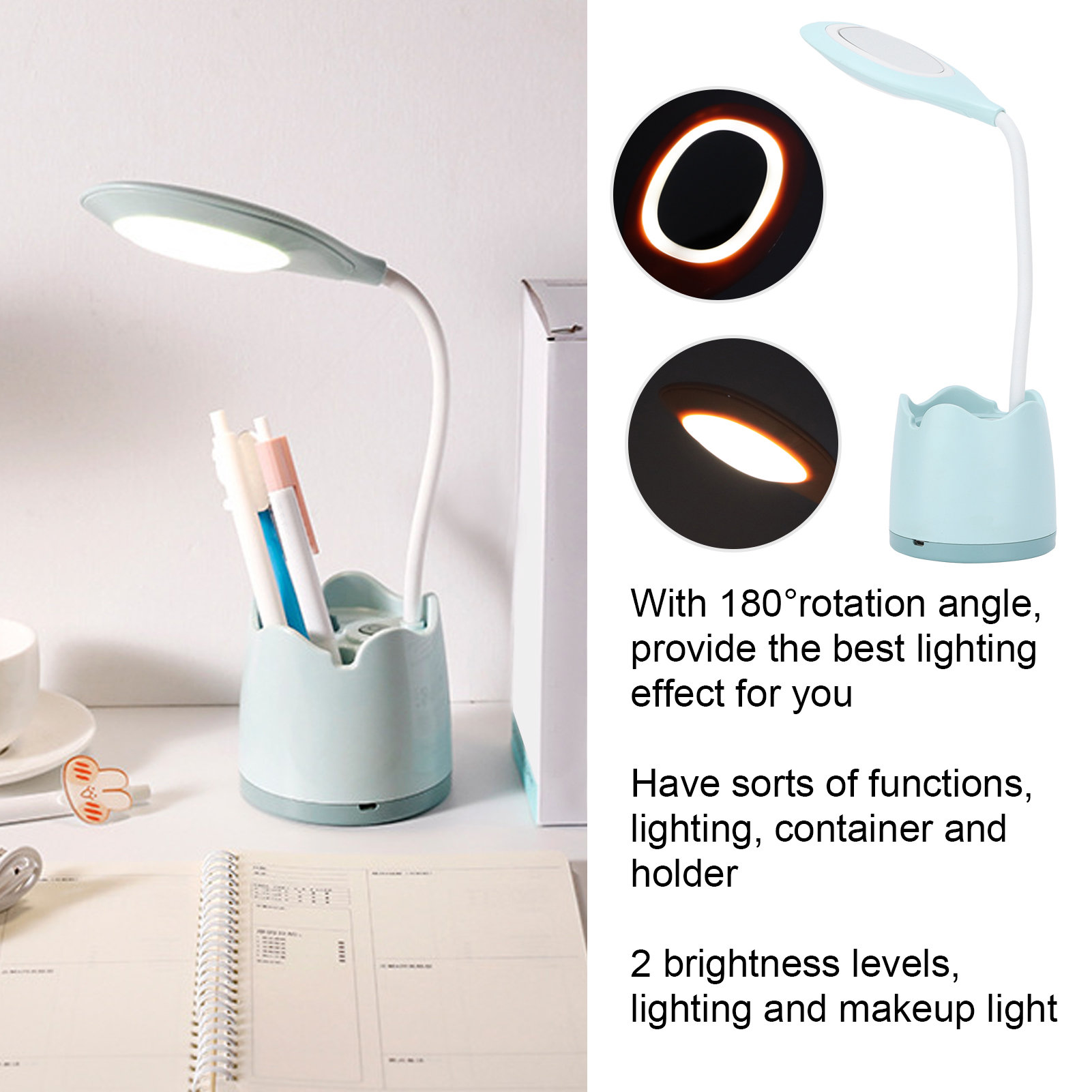 1、Kids desk lamp with 180°rotation angle, can easy to move your desired the position and angle, provide the best lighting effect for you. 2、Not only emit bright and cozy light in your house or office, but function as pen container and phone holder. 3、With USB charging port and comes with USB cable, can be easily powered by a power bank. 4、Simple and portable design, can be folded easily and carry when you are traveling or camping. 5、Compared to other study lamp, eye‑caring and unique design will add the fun of kids, 6、Have 2 brightness levels, including lighting and makeup light, satisfy your multiple needs.