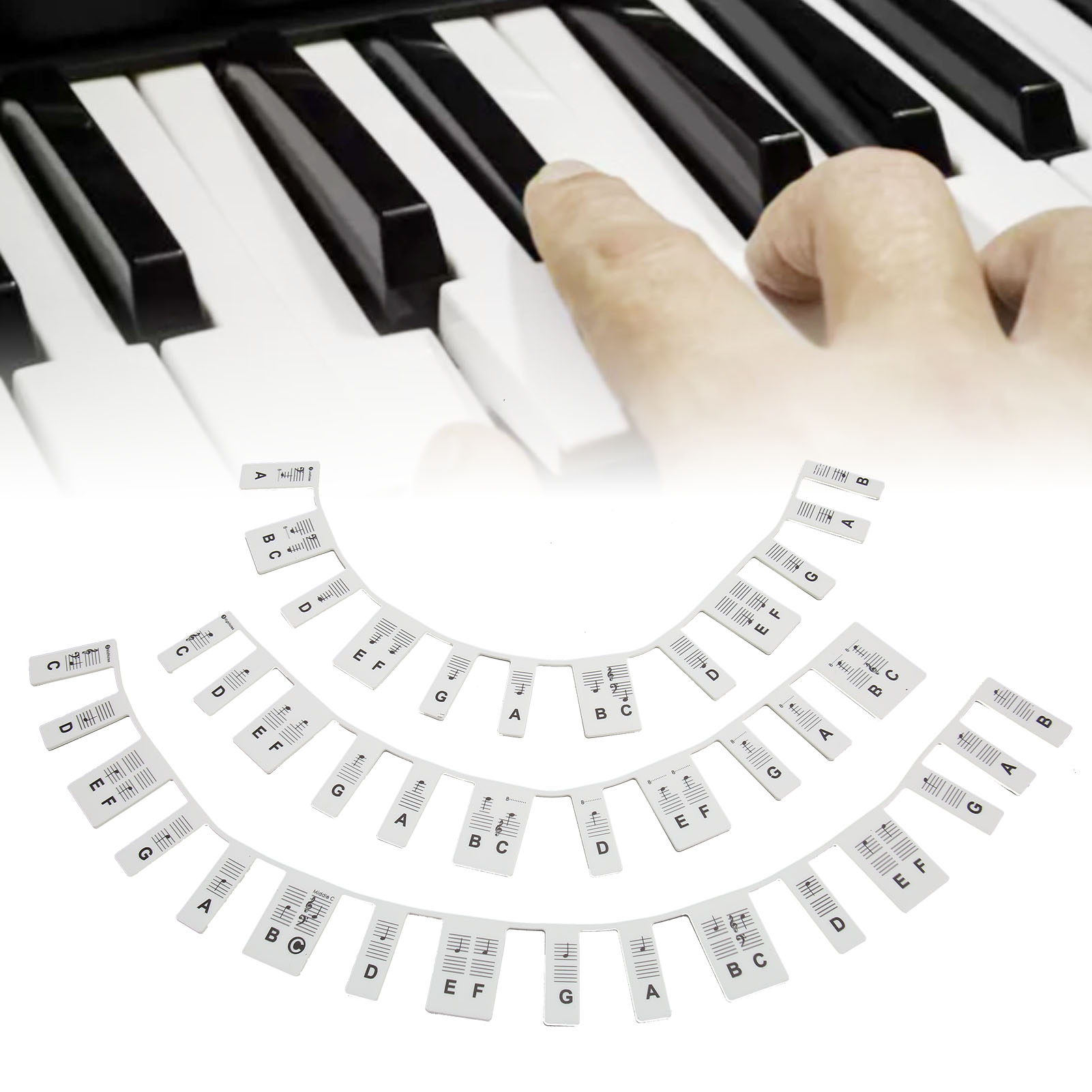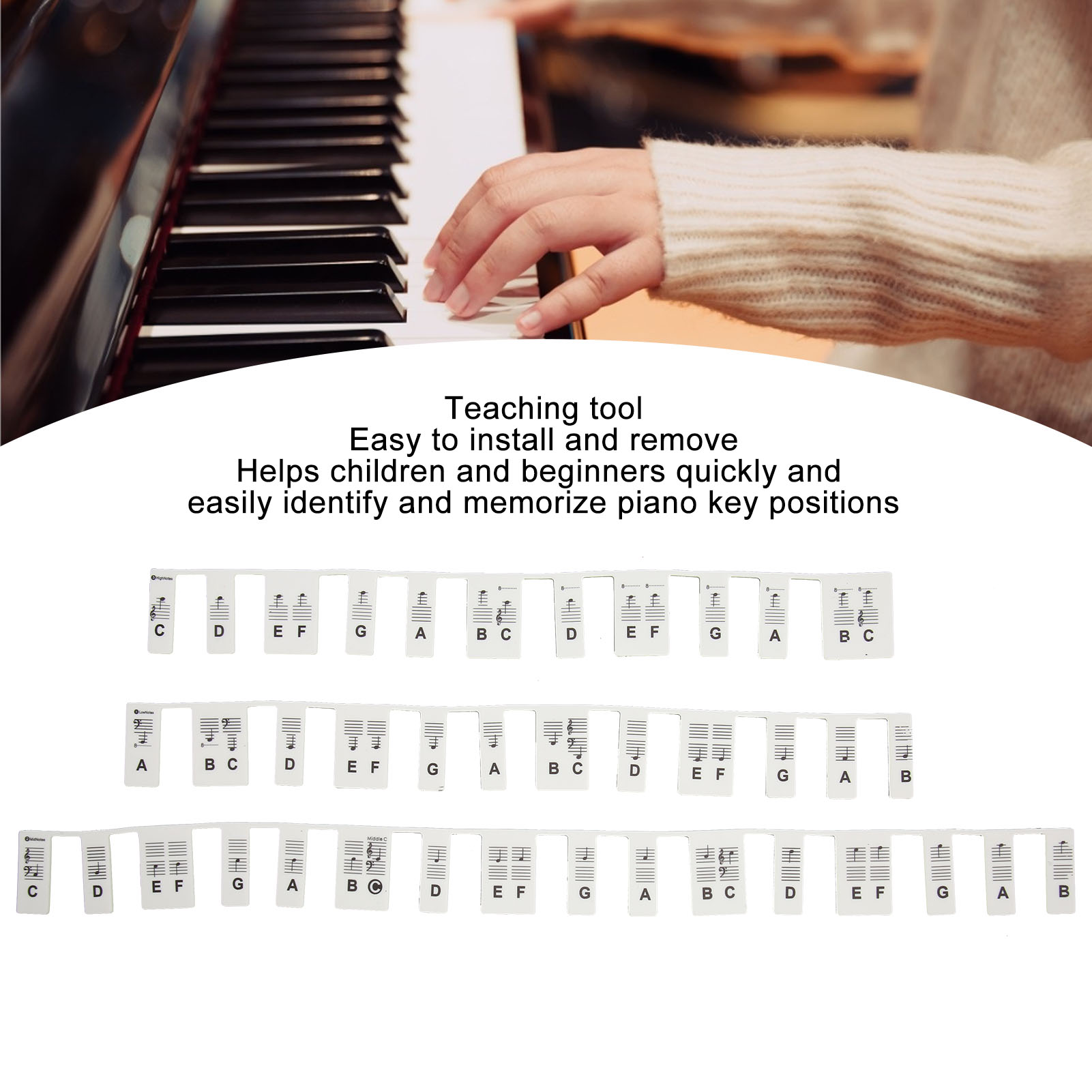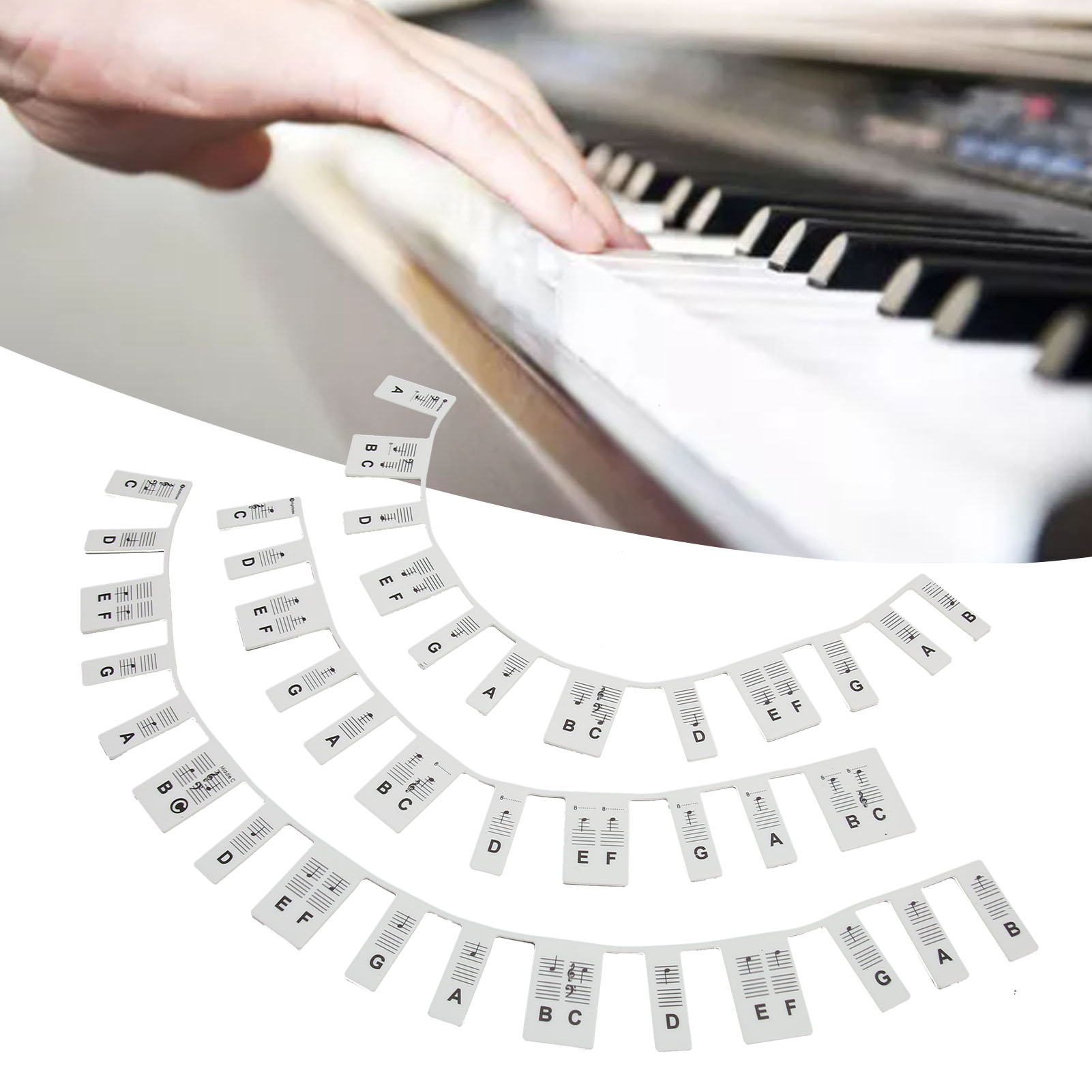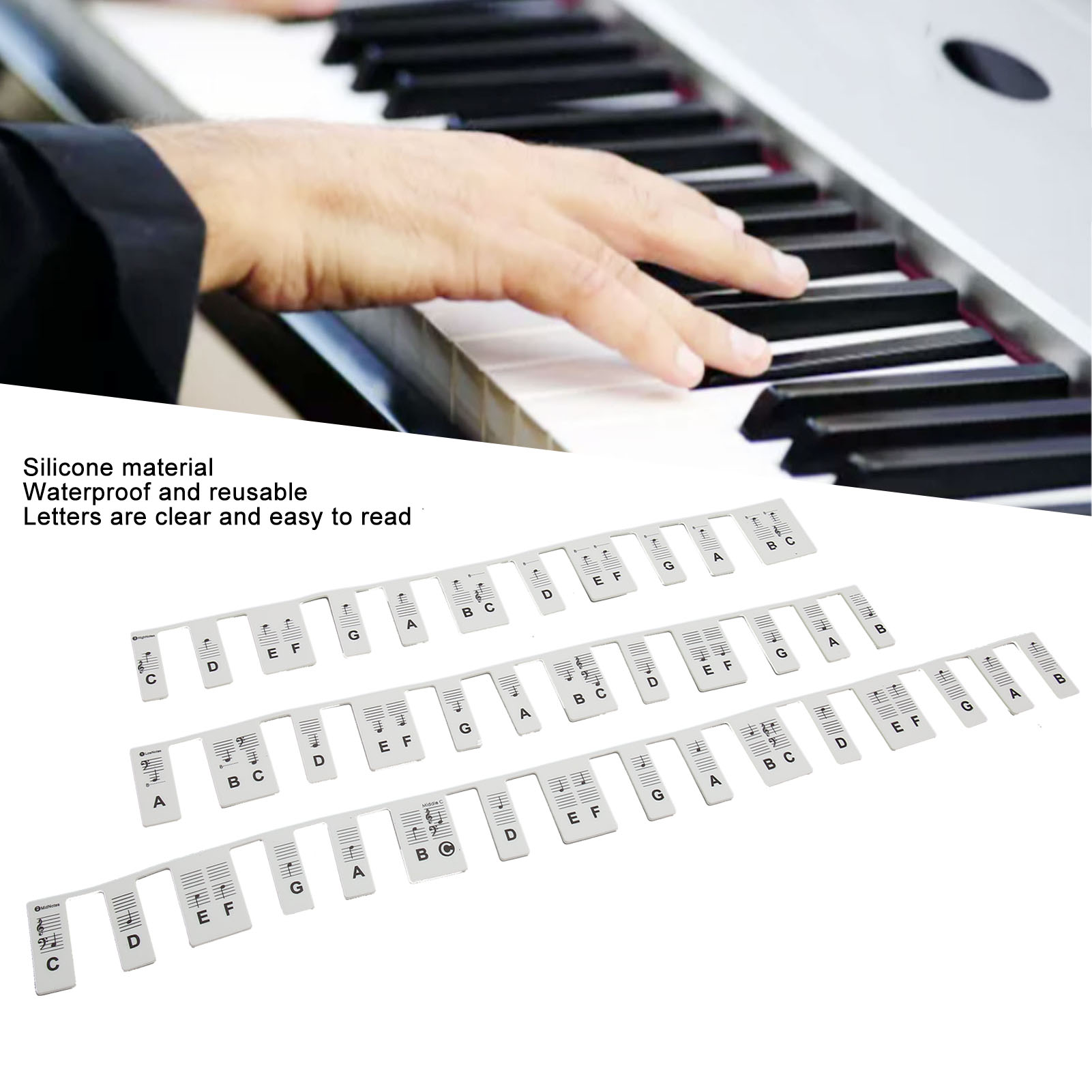 1、Easy to Read: The keyboard stickers visualize the key characters and the letters are clear and easy to read to help you play and practice in unfamiliar key positions 2、88 Keys Black: This silicone piano notes guide is 88 keys black, helping children find notes quickly when learning piano 3、Removable Design: Piano notes guide labels are easy to install and remove to prevent piano sticker residue and keep the keyboard clean and tidy 4、Scope of Application: This piano stickers will be helpful for kids piano lessons and for those who want to learn on their own and is a great training tool 5、Durable Material: Piano keyboard stickers are made of silicone, waterproof, eco friendly, durable and reusable