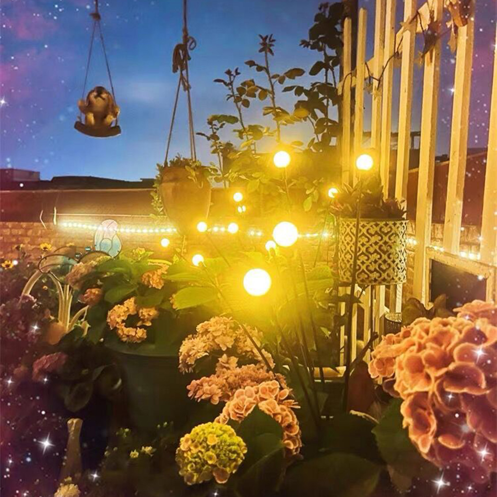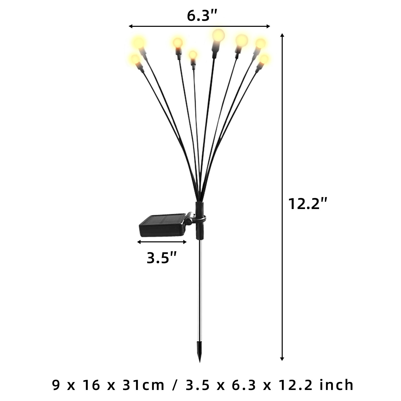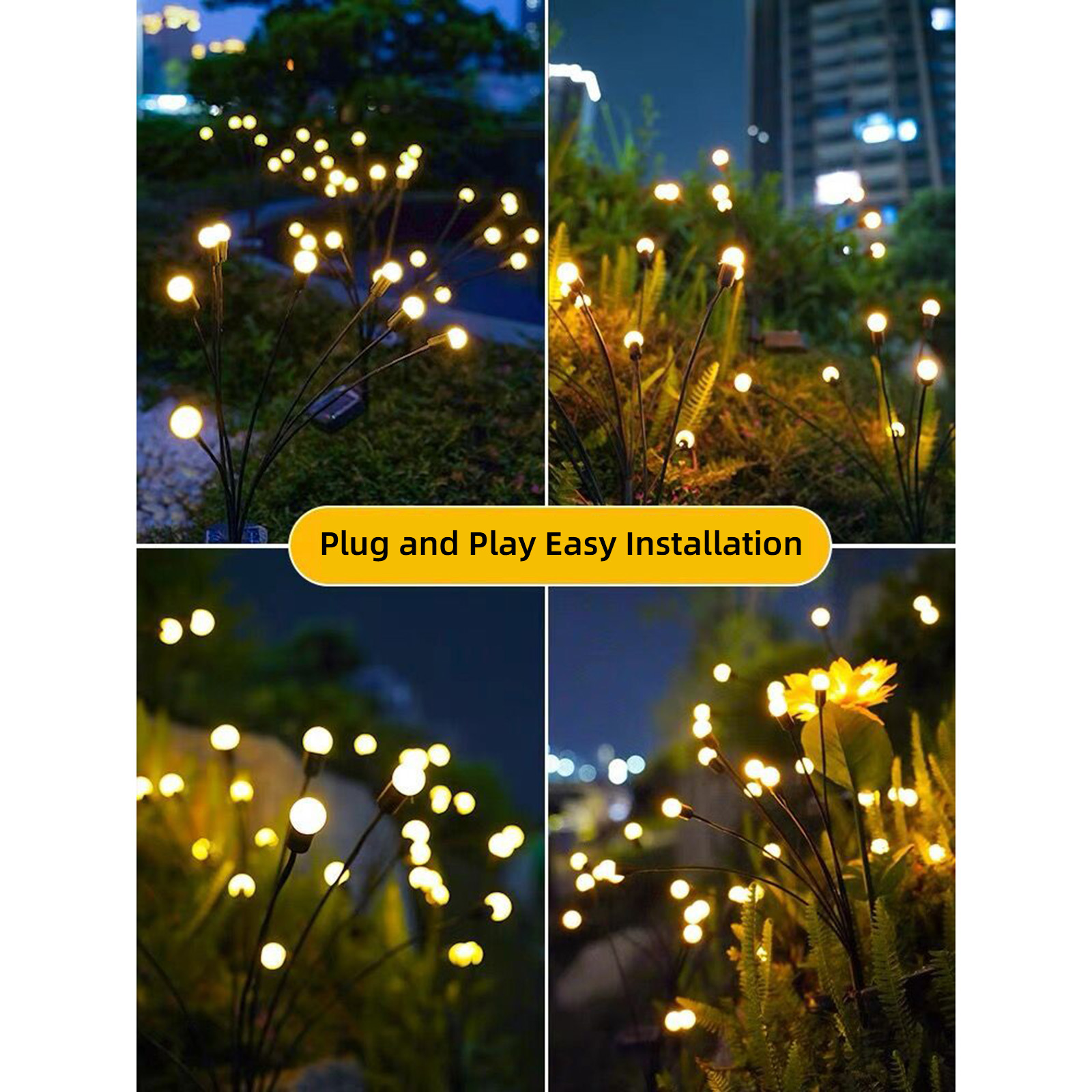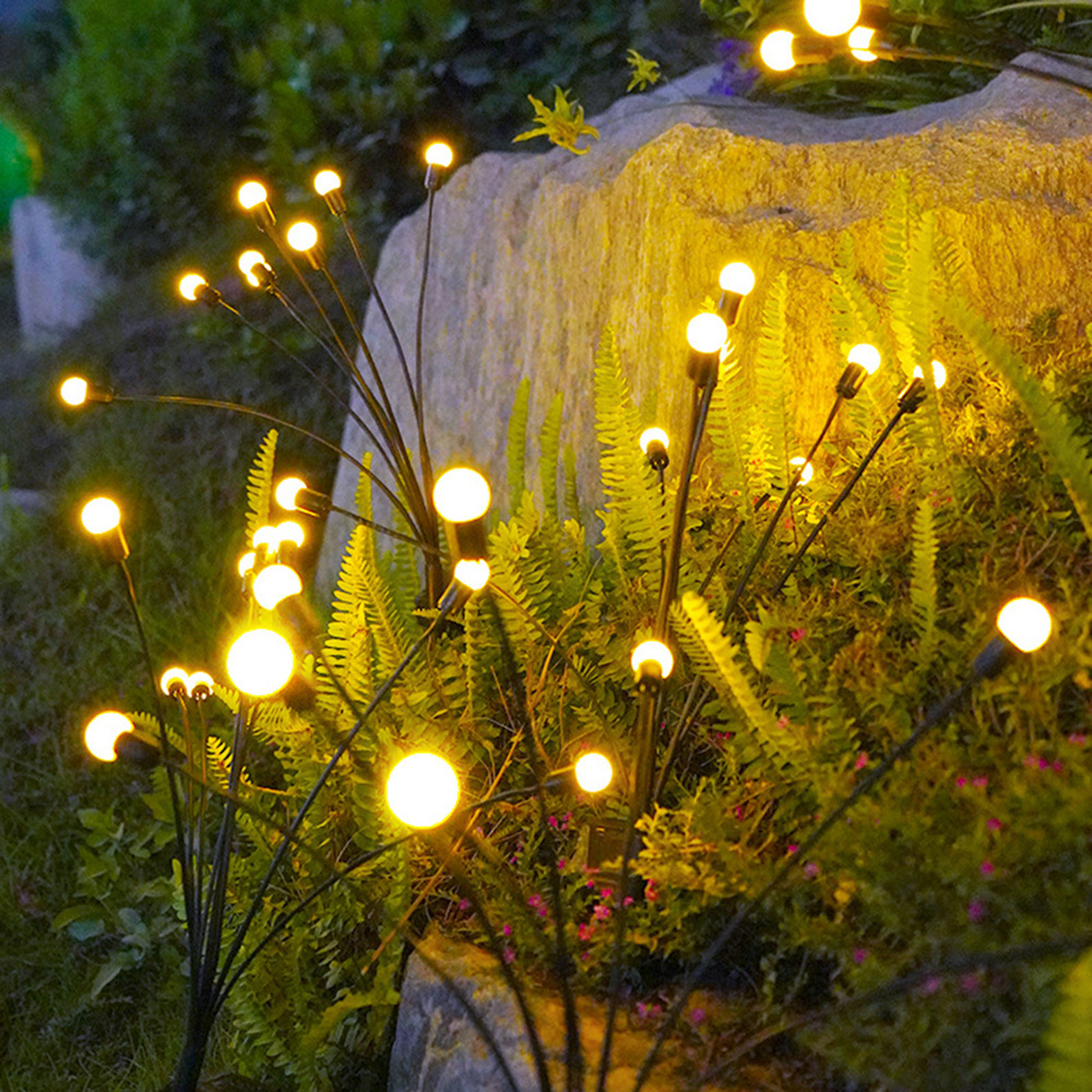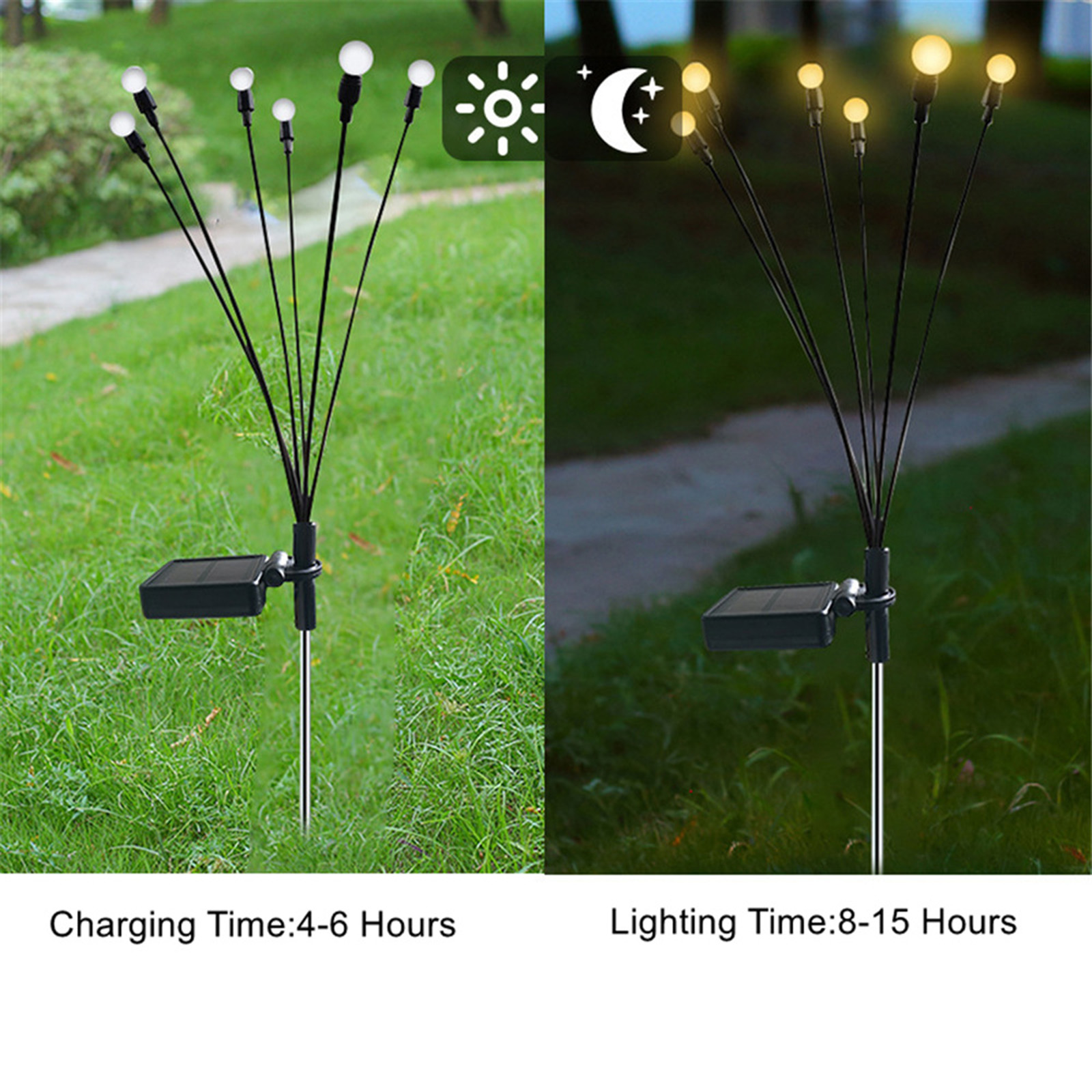 1、Shape: This is a special iron colorful firefly lamp, with 6 lamp heads fluttering with the wind, just like fireflies flying in the garden, soft and flexible, adding a feeling of romance to the garden at night. 2、Material: Simple lamp ball shape, stainless steel ground pole, and hardwearing electronic wires, allow the angle and shape to be adjusted at will. It also has IP65 waterproof, perfect for outdoor environments. 3、Solar energy: The floor lamp is powered by a 6*6.5CM enlarged monocrystalline silicon solar panel and a 600mAh Ni-MH battery. It does not need a wire connection, is energy-saving and convenient, and does not need to be replaced frequently. It can be used outdoors for a long time.