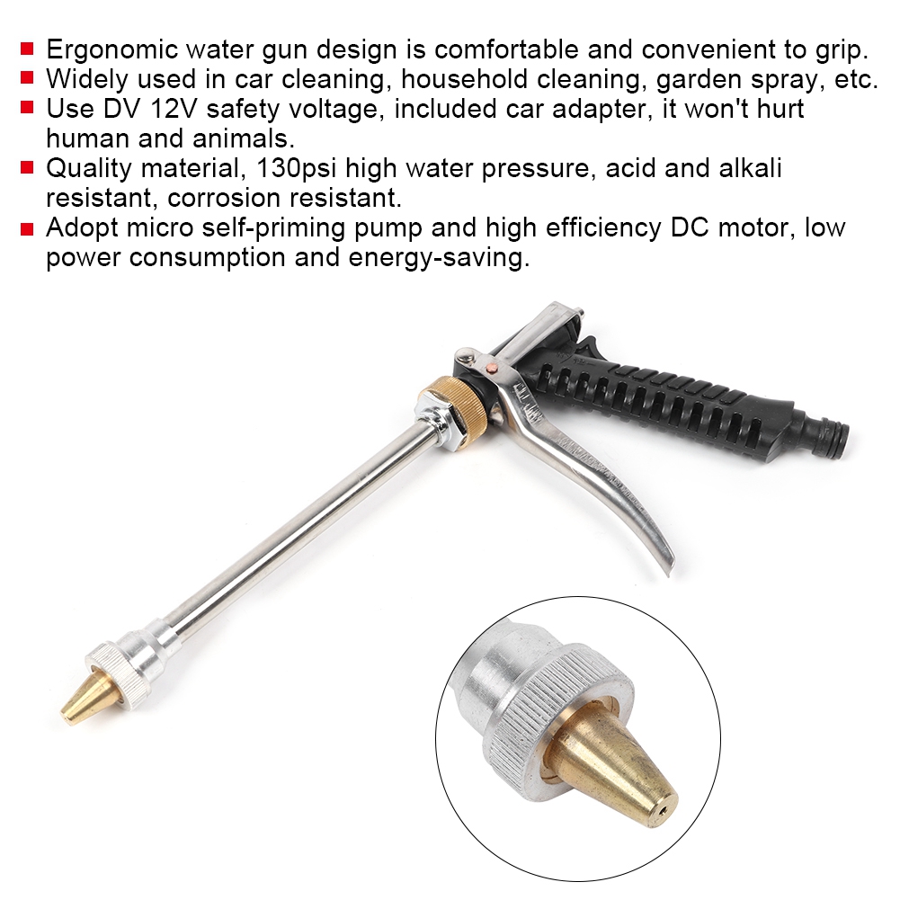 1、Made of high quality material, 130psi high water pressure, acid and alkali resistant, corrosion resistant and pesticides resistant, long lifespan and low noise. 2、Adopt high quality micro self-priming pump and high efficiency DC motor, low power consumption and energy-saving. 3、The water hose can be easily connected with the water gun and the pump, ergonomic water gun design is comfortable and convenient to grip. 4、Use DV 12V safety voltage, included car adapter, it won't hurt human and animals. 5、Widely used in car cleaning, household cleaning, air-conditioning cleaning, garden spray, etc.
