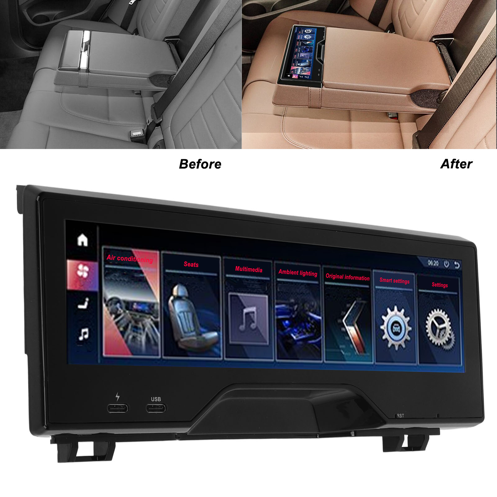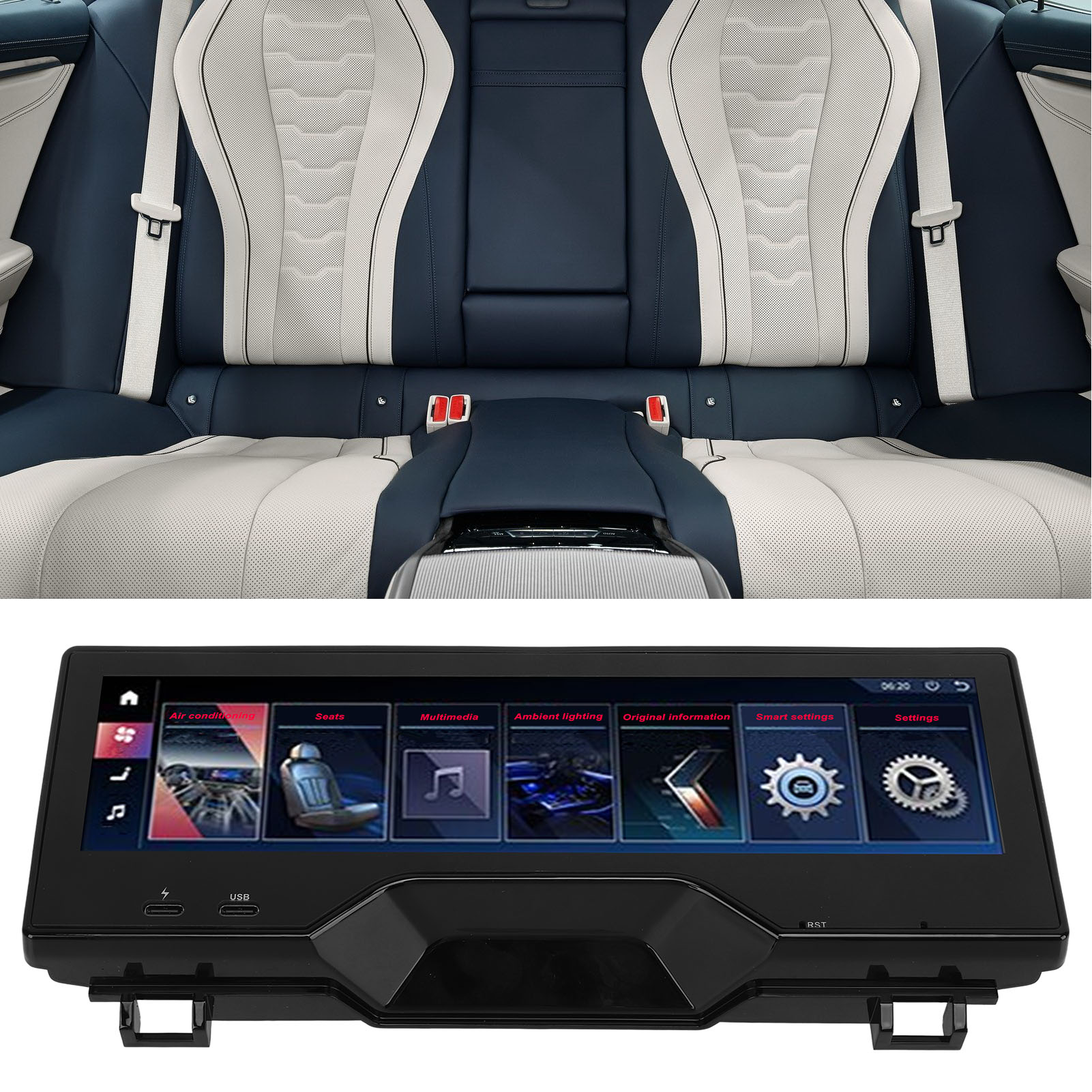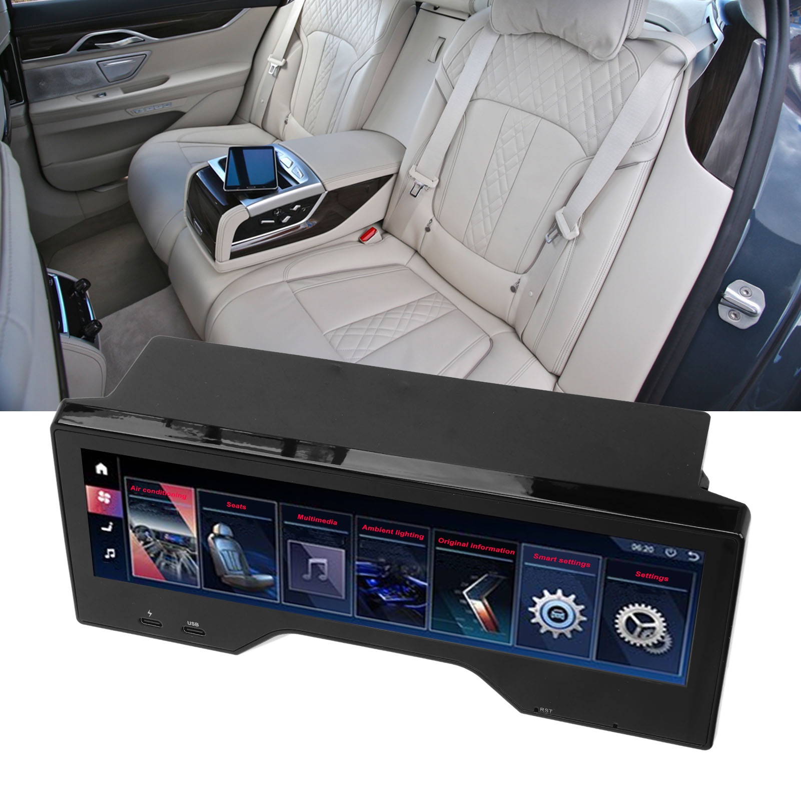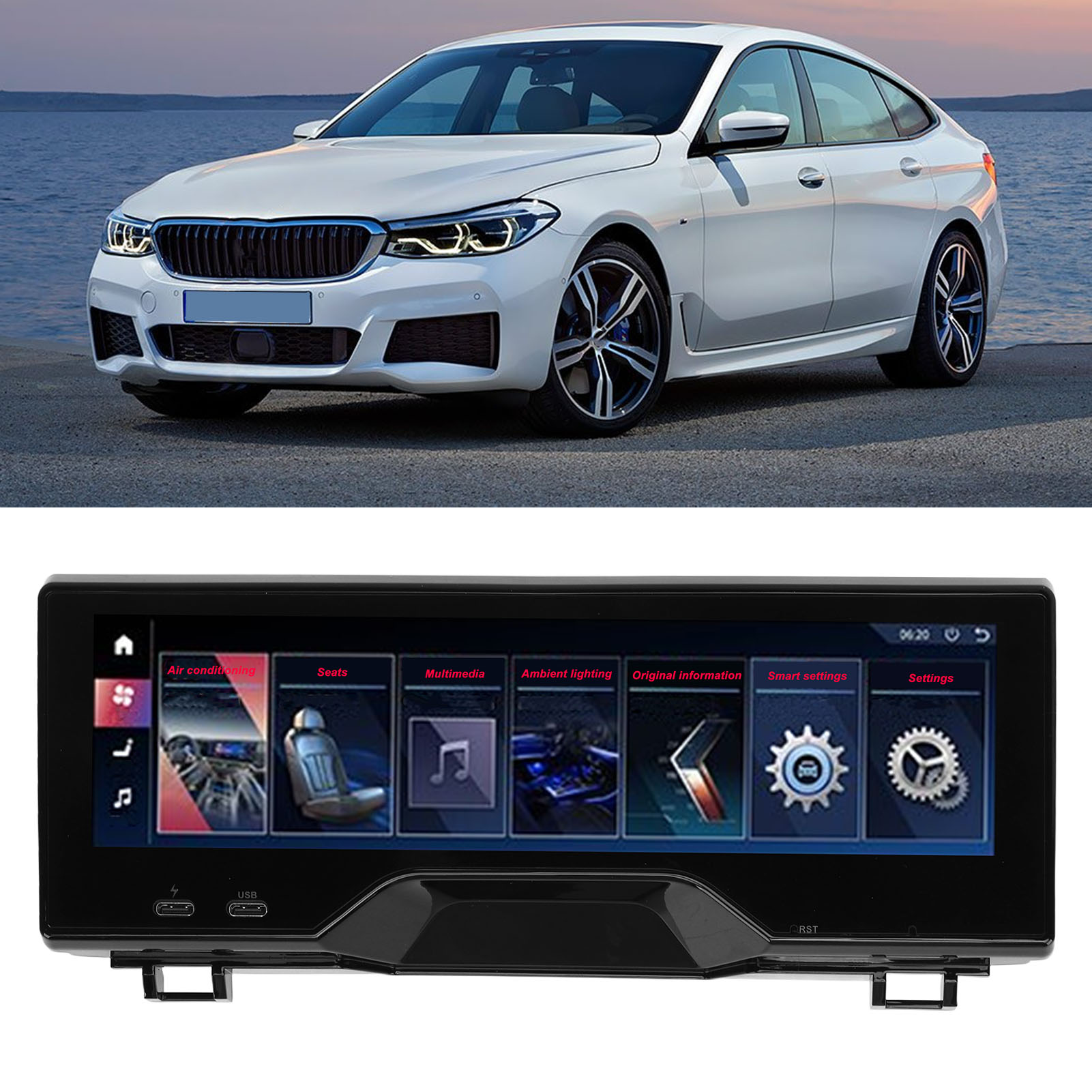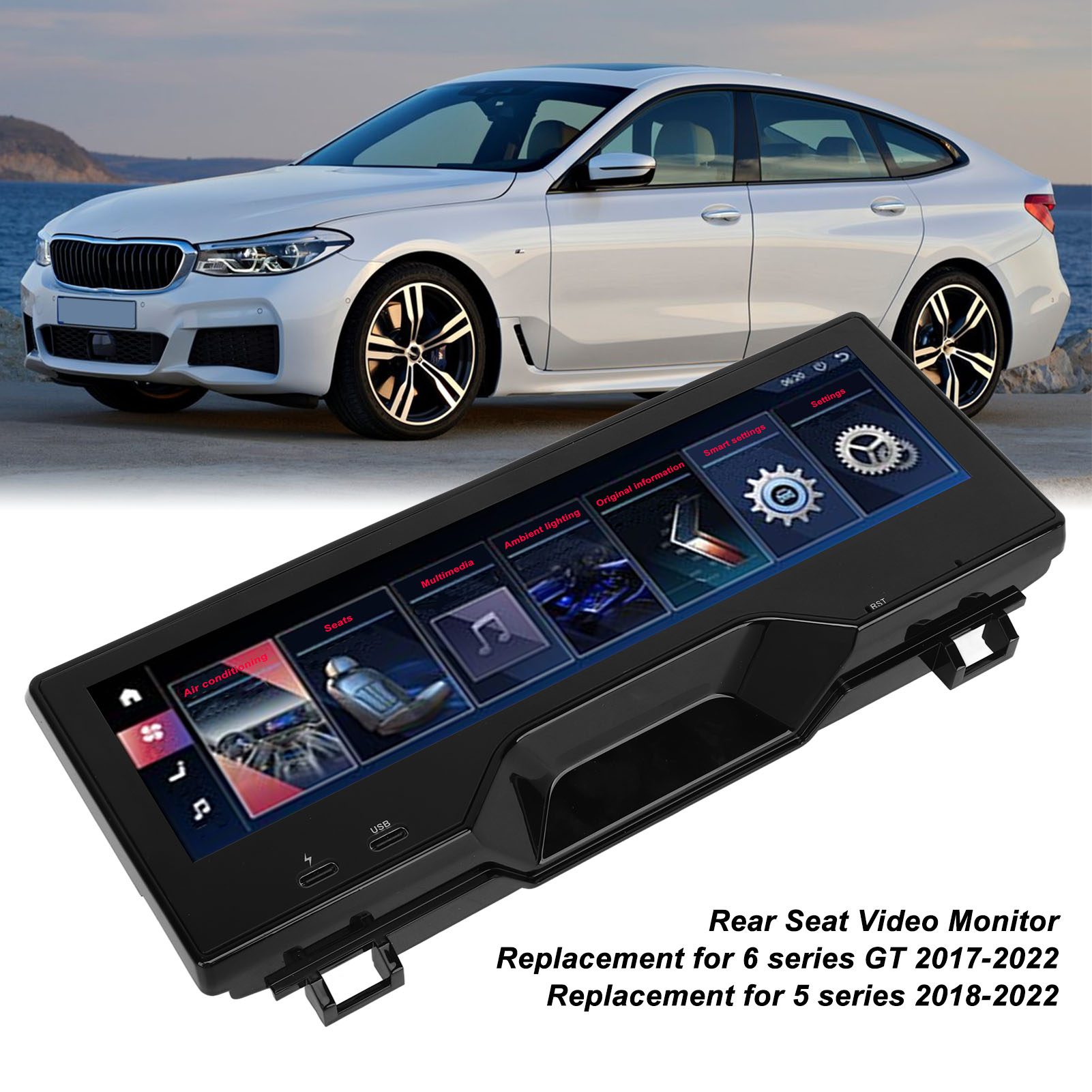 1、Fitment: Rear seat entertainment system is perfect replacement for 6 series GT 2017‑2022; Replacement for 5 series 2018‑2022, please check carefully to make sure it is compatible with your vehicle. 2、Outstanding Features: With 1920 x 480 high resolution and LCD touch screen display, fast quad core processor with 8GB memory. 3、Practical Function: Support the central control multimedia volume and up and down song control, air conditioning wind speed temperature control. 4、Smart Design: Touch screen can control the color and brightness of the ambient light, with automatic cycle switching. 5、Safety Improvement: The panel can display original car information, and people in the back can see door and speed alerts and safety assistance.