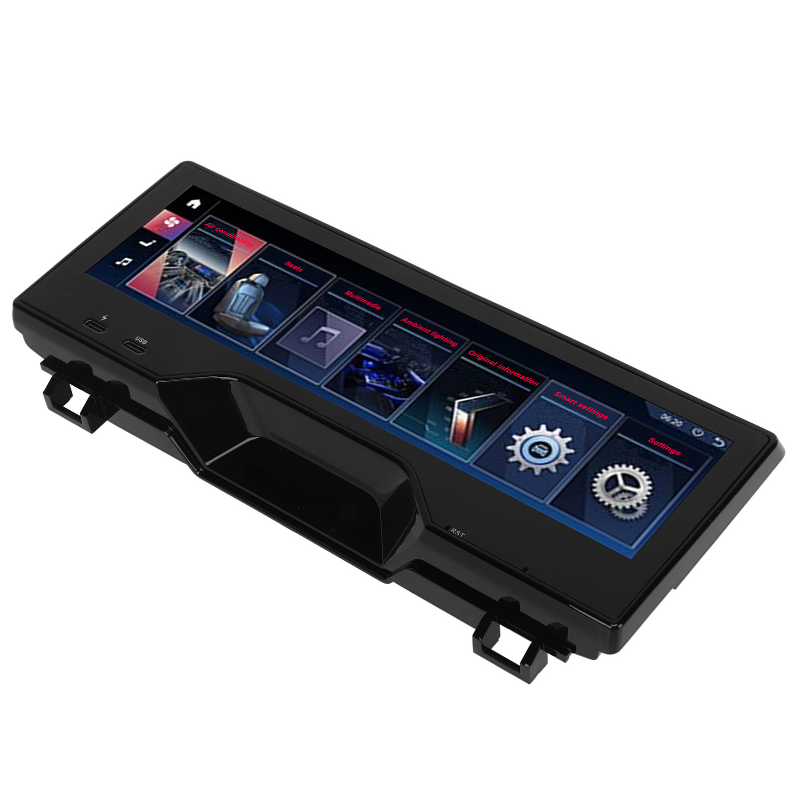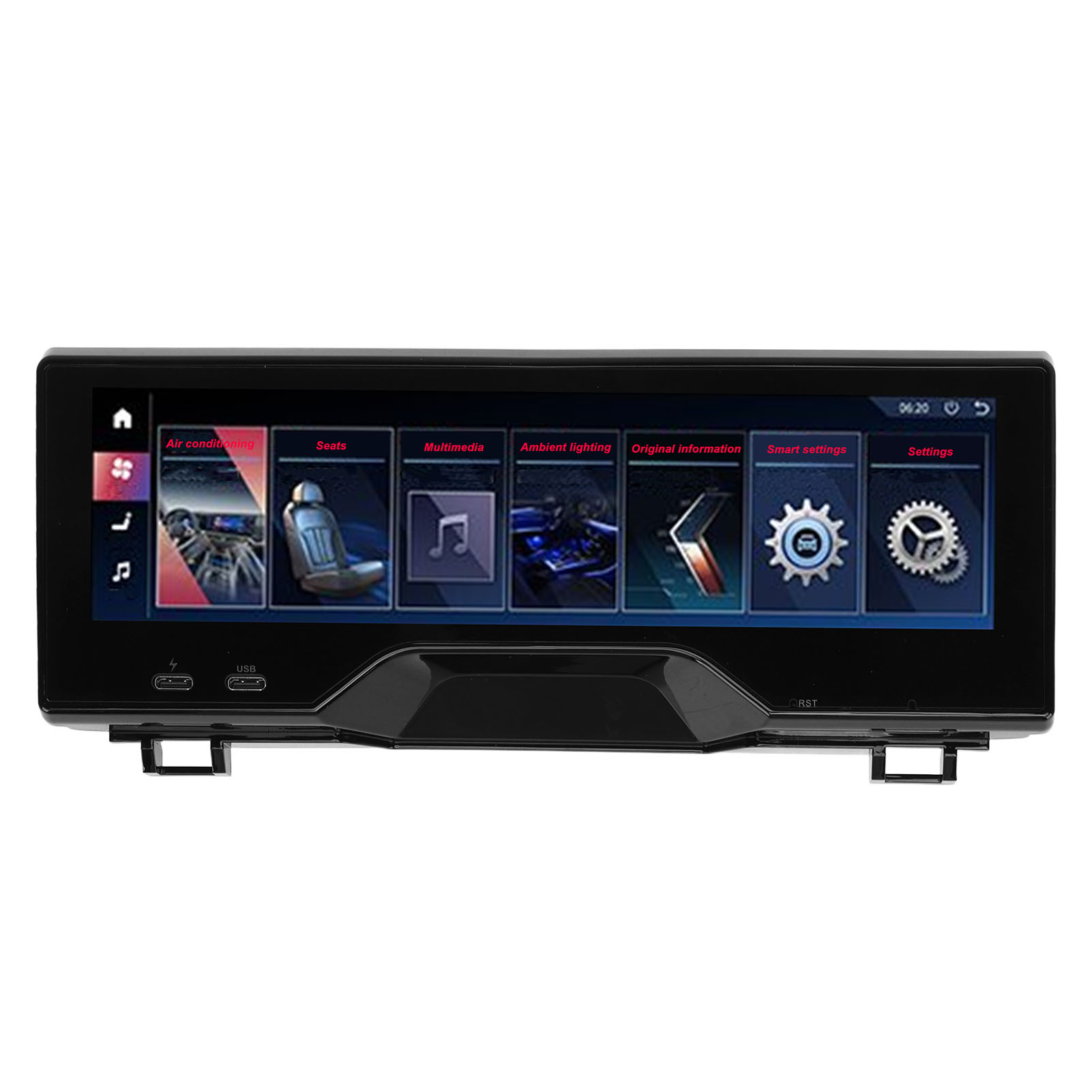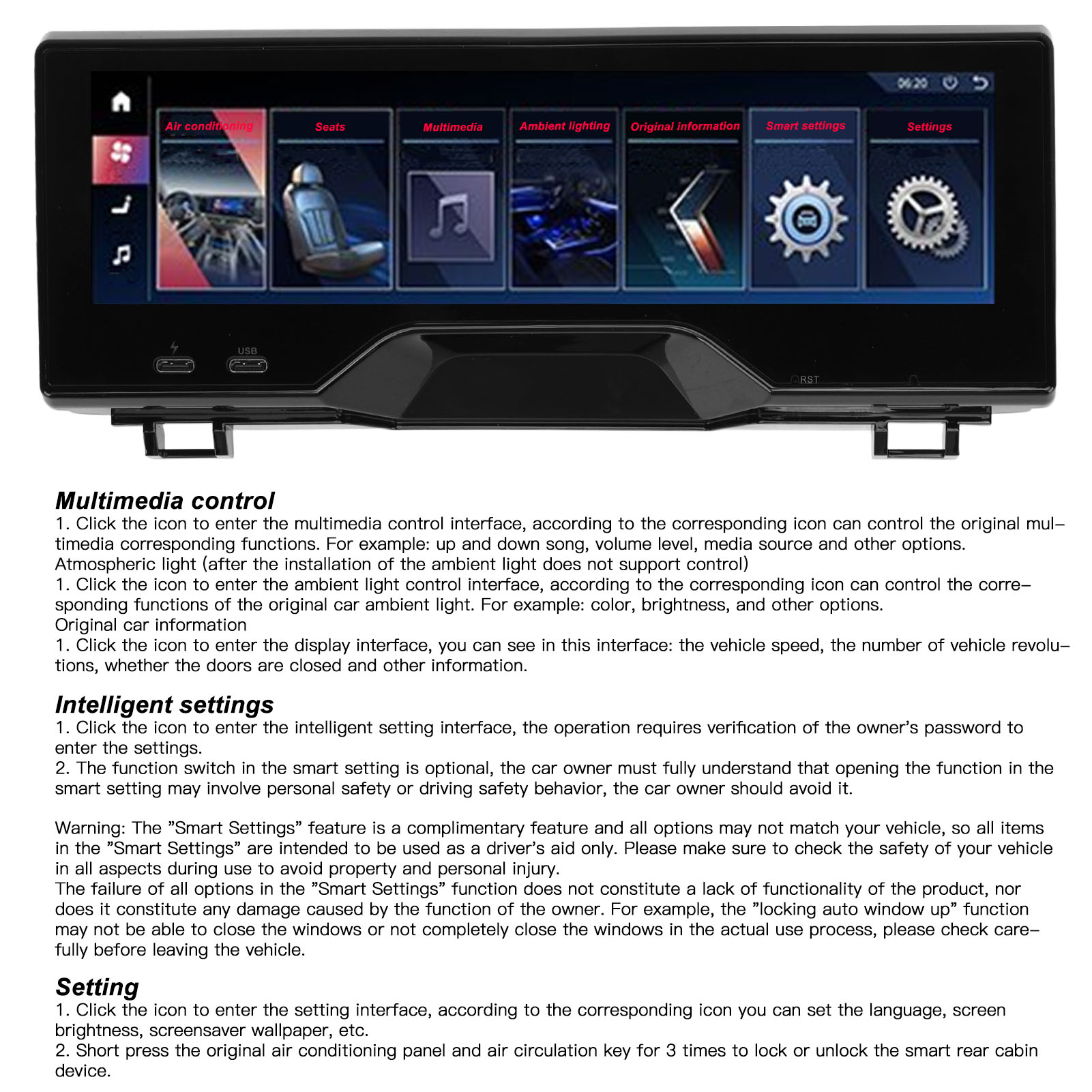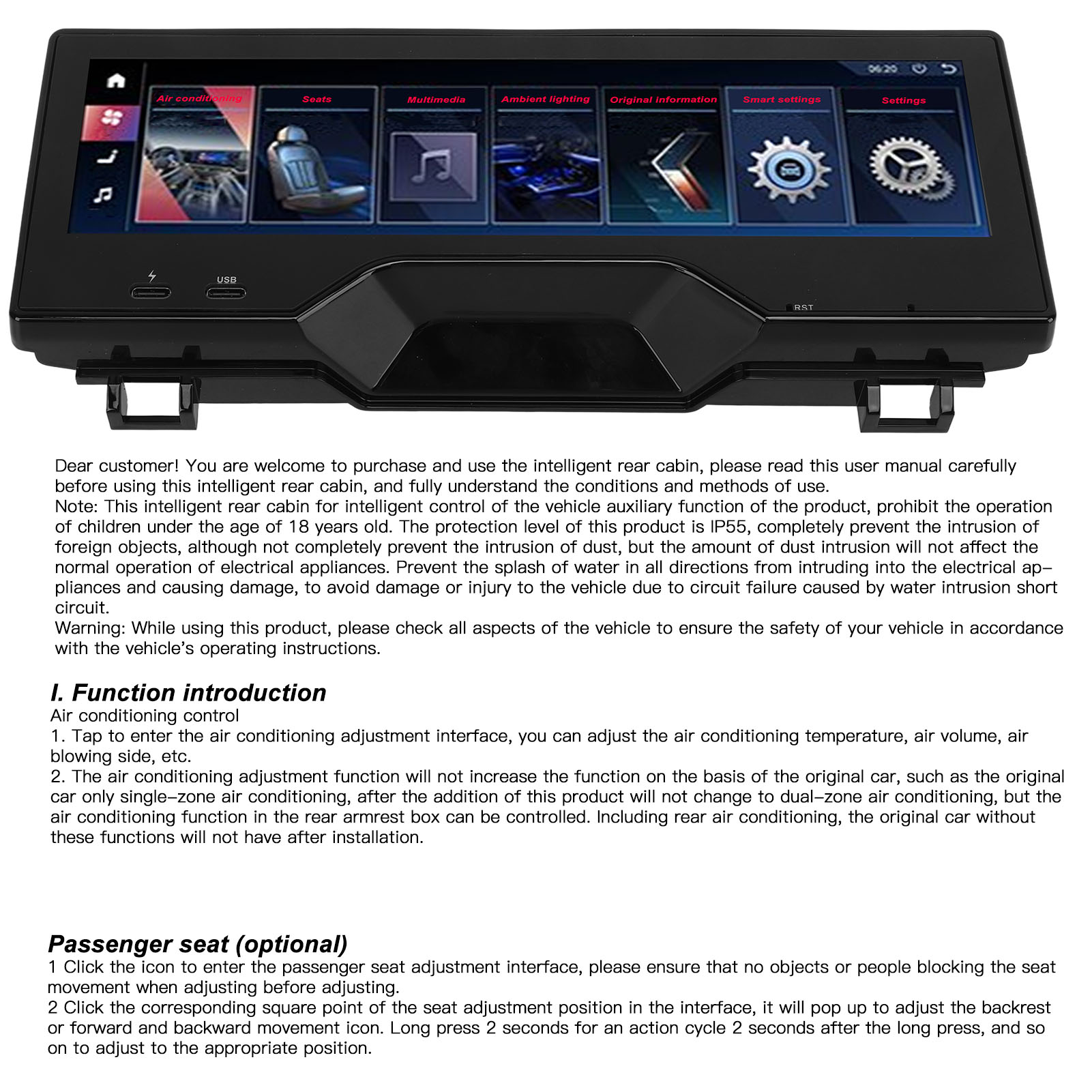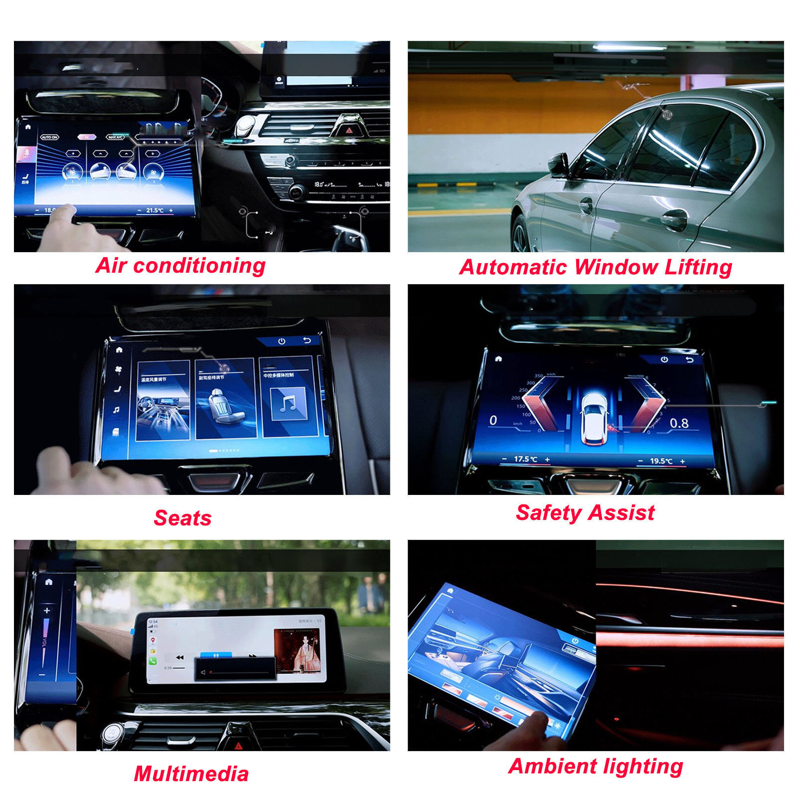 1、Fitment: Rear seat entertainment system is perfect replacement for 6 series GT 2017‑2022; Replacement for 5 series 2018‑2022, please check carefully to make sure it is compatible with your vehicle. 2、Outstanding Features: With 1920 x 480 high resolution and LCD touch screen display, fast quad core processor with 8GB memory. 3、Practical Function: Support the central control multimedia volume and up and down song control, air conditioning wind speed temperature control. 4、Smart Design: Touch screen can control the color and brightness of the ambient light, with automatic cycle switching. 5、Safety Improvement: The panel can display original car information, and people in the back can see door and speed alerts and safety assistance.