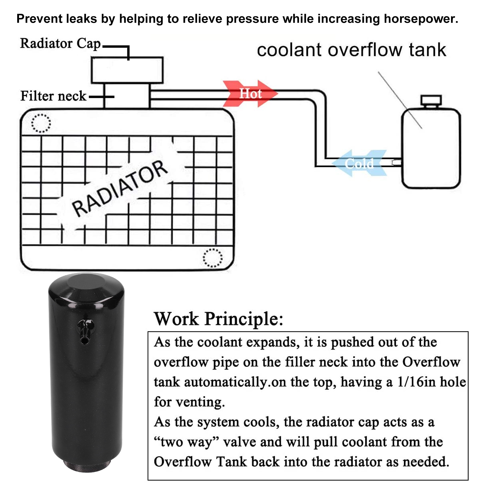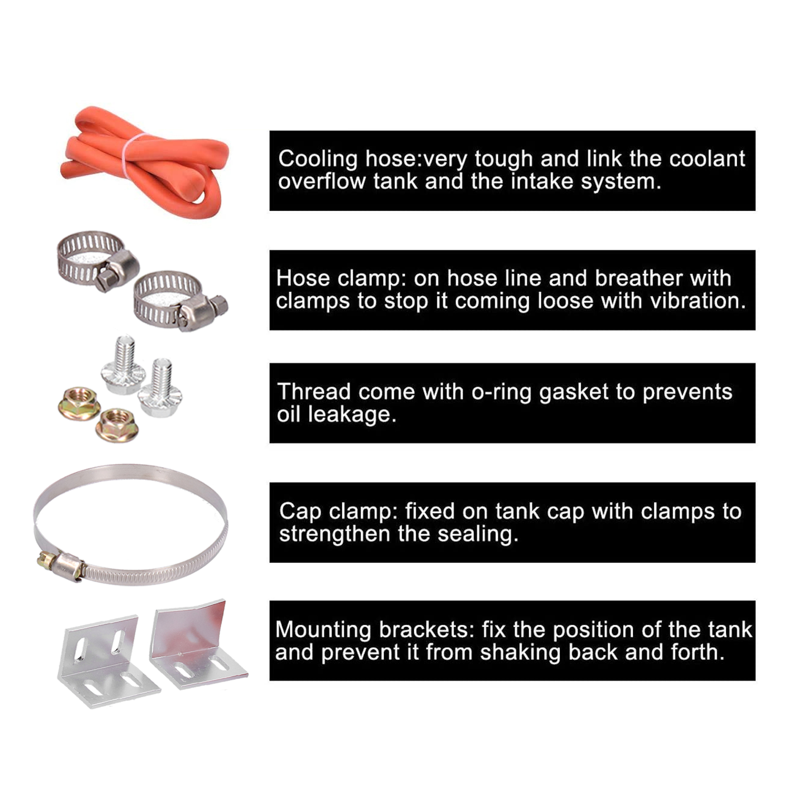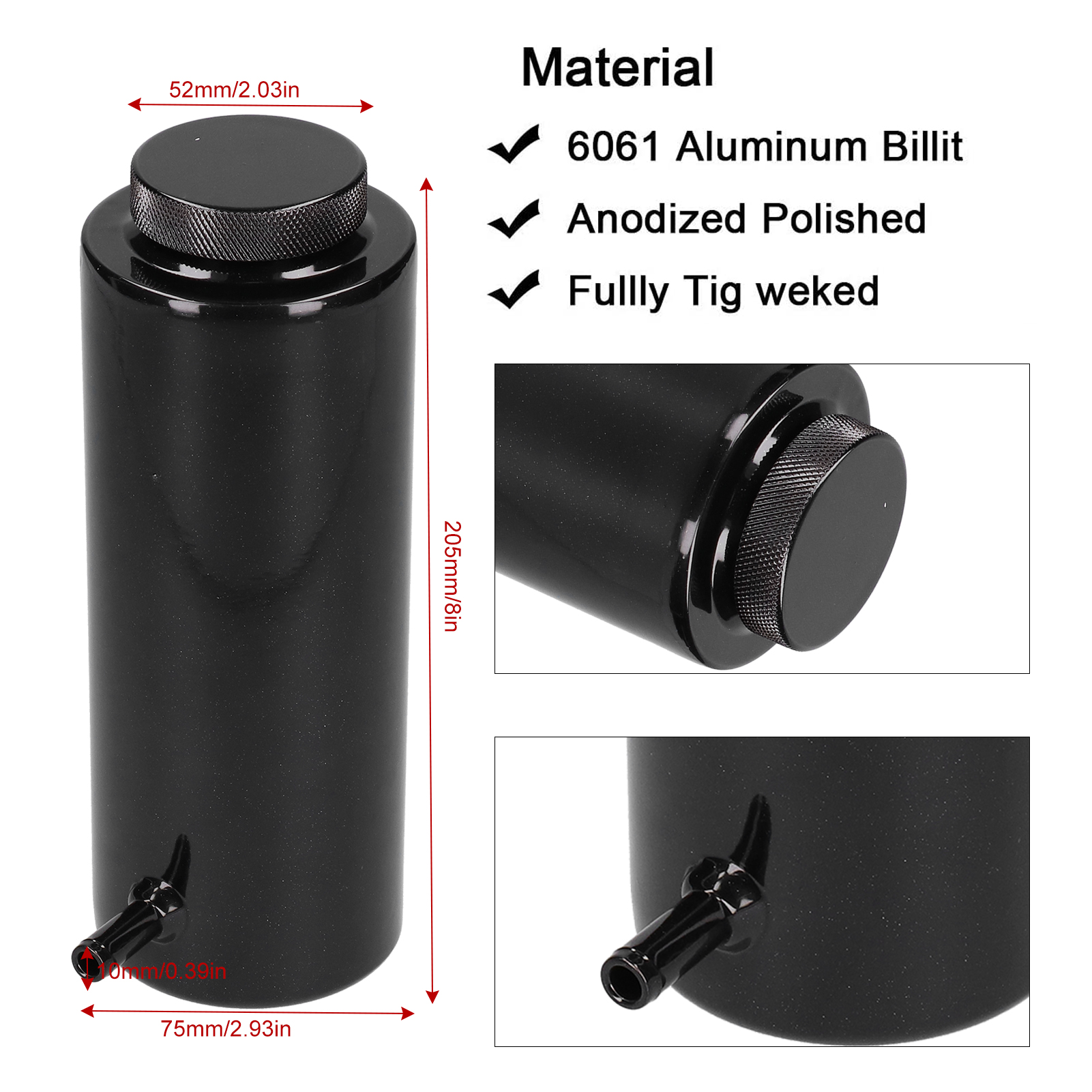 Function:1、Universal radiator coolant catch tank, with 800ML large capacity, fully meets daily needs. 2、Prevent leaks by helping to relieve pressure while increasing horsepower. 3、It can save you a lot of money by preventing the formation of rust in the car's cooling system. 4、Made of high quality aluminum material, anti‑corrosion, rugged and durable for long‑term use. 5、Suitable for most vehicles, may need to do some custom modifications and require other hardware to meet your needs.