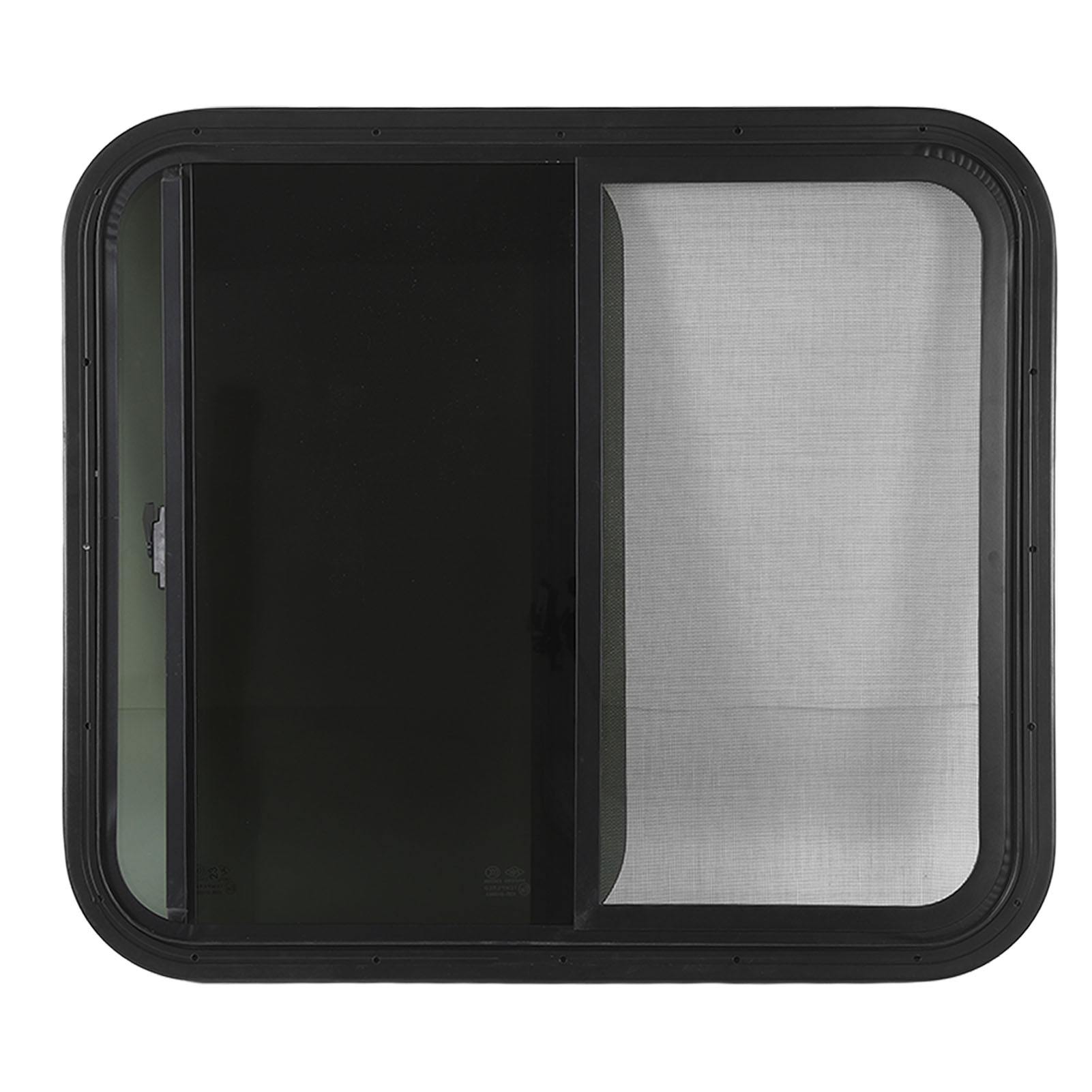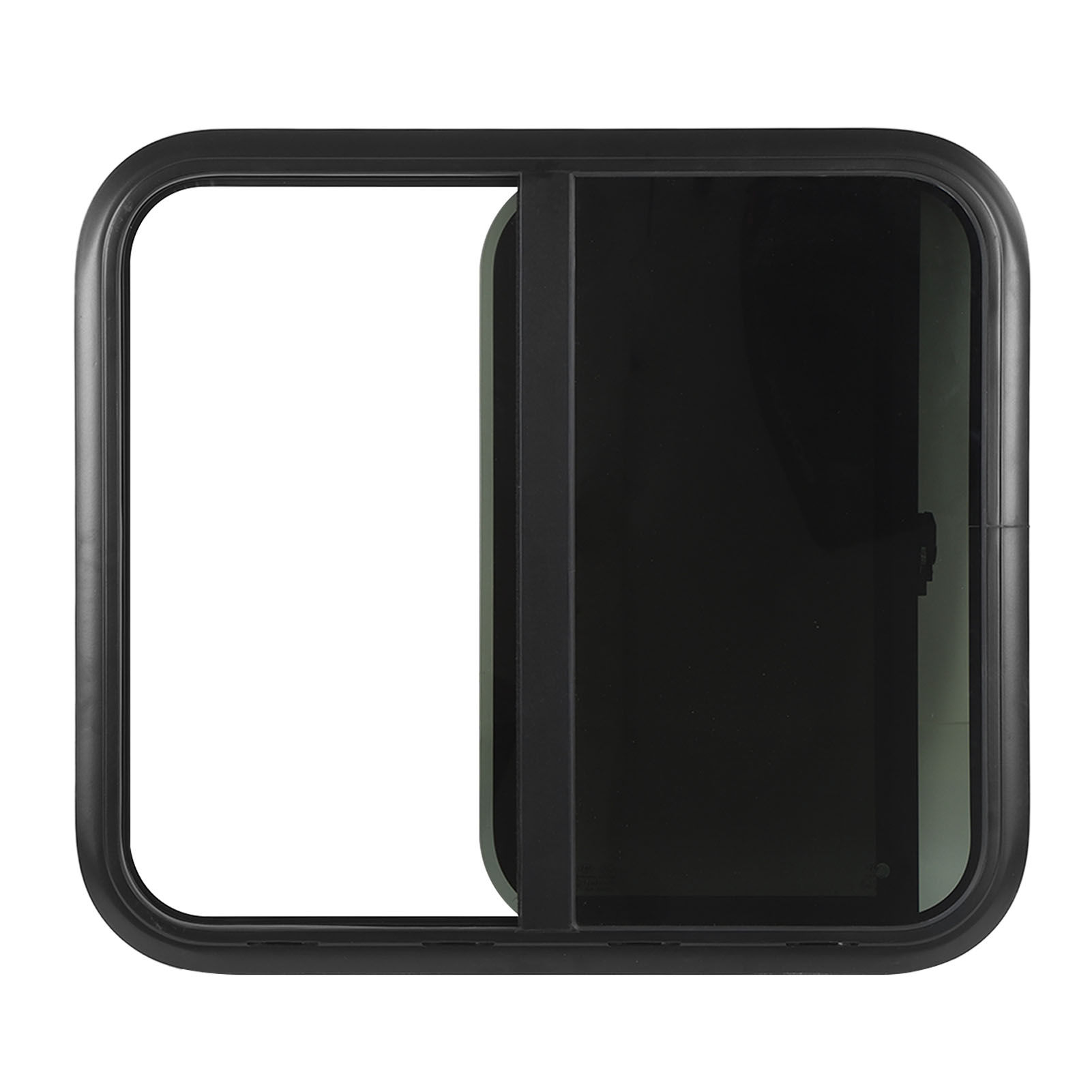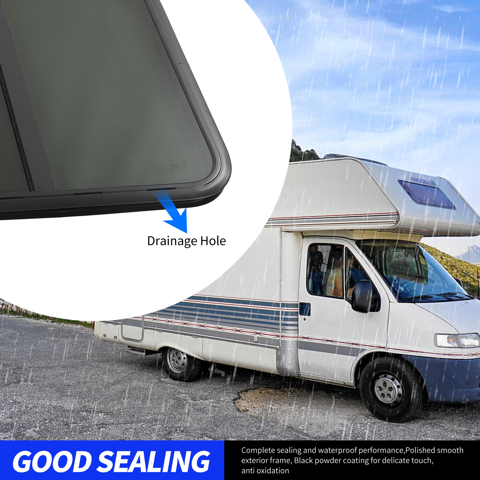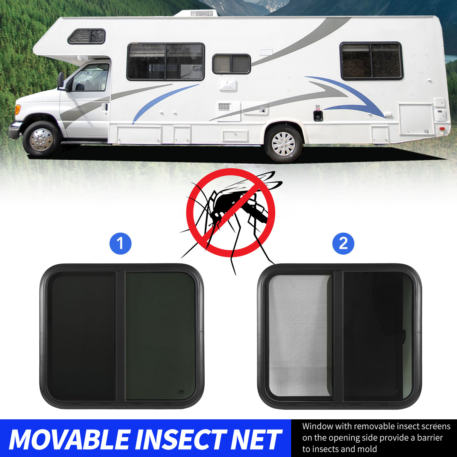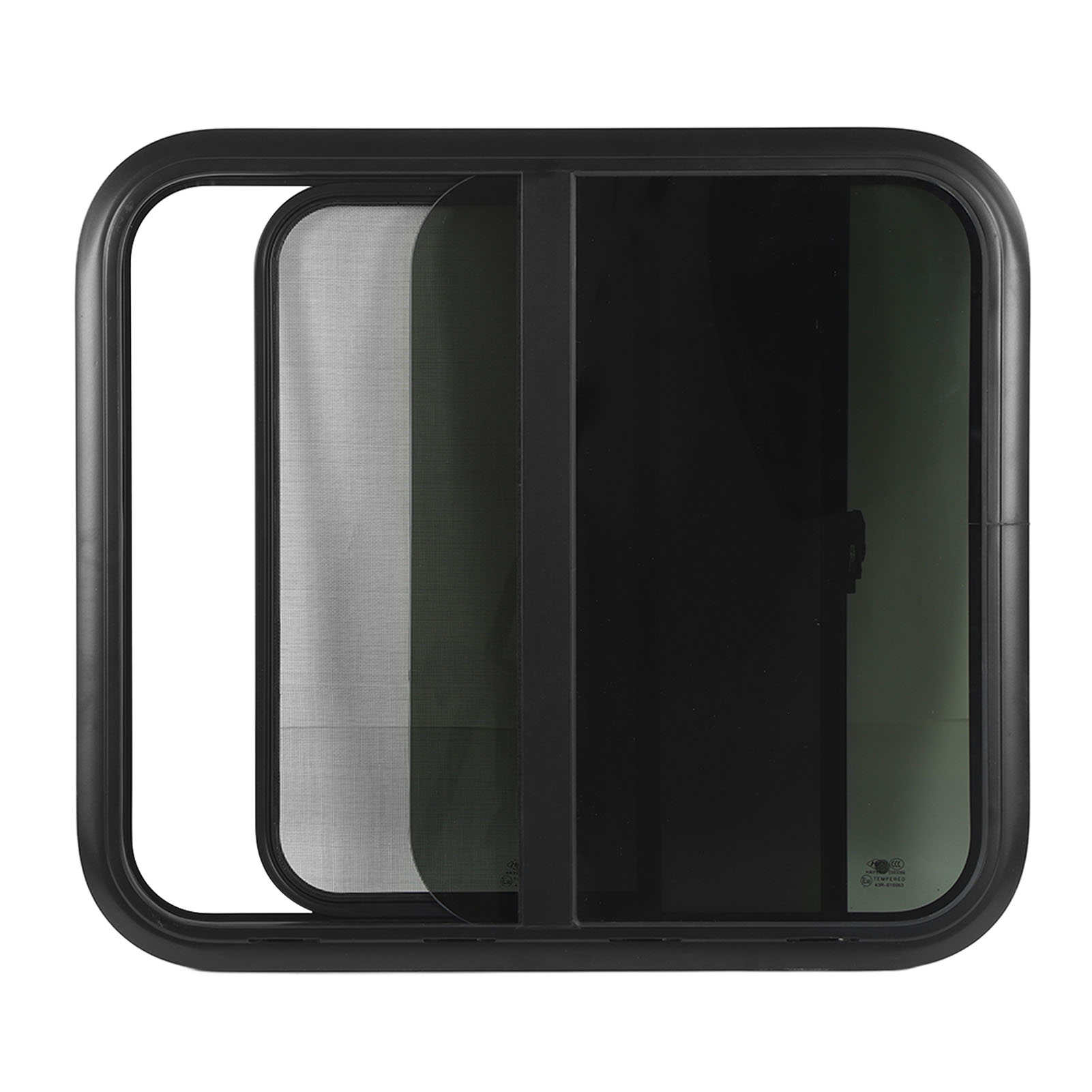 1、Aluminum Alloy Frame: The window features aluminum alloy frame with a black powder coated finish, which is oxidation proof, ensuring long lasting durability even in outdoor environments. 2、Good Sealing: Equipped with waterproof gaskets and a drainage hole, the window provides complete seal and waterproofing for a comfortable camping experience year round. 3、UV Resistant Tempered Glass: Certified by E‑mark, the window's 4mm thick black tempered glass ensures safety and durability, while its tinted glass effectively blocks UV rays and heat. 4、Removable Insect Screen: The RV window features a sliding mechanism for easy opening and closing, and is equipped with a movable insect screen which helps to keep bugs away. 5、Wide Application: The window can be installed anywhere, such as storage compartments, living rooms, or resting areas, to enhance the brightness or function as a ventilation window.