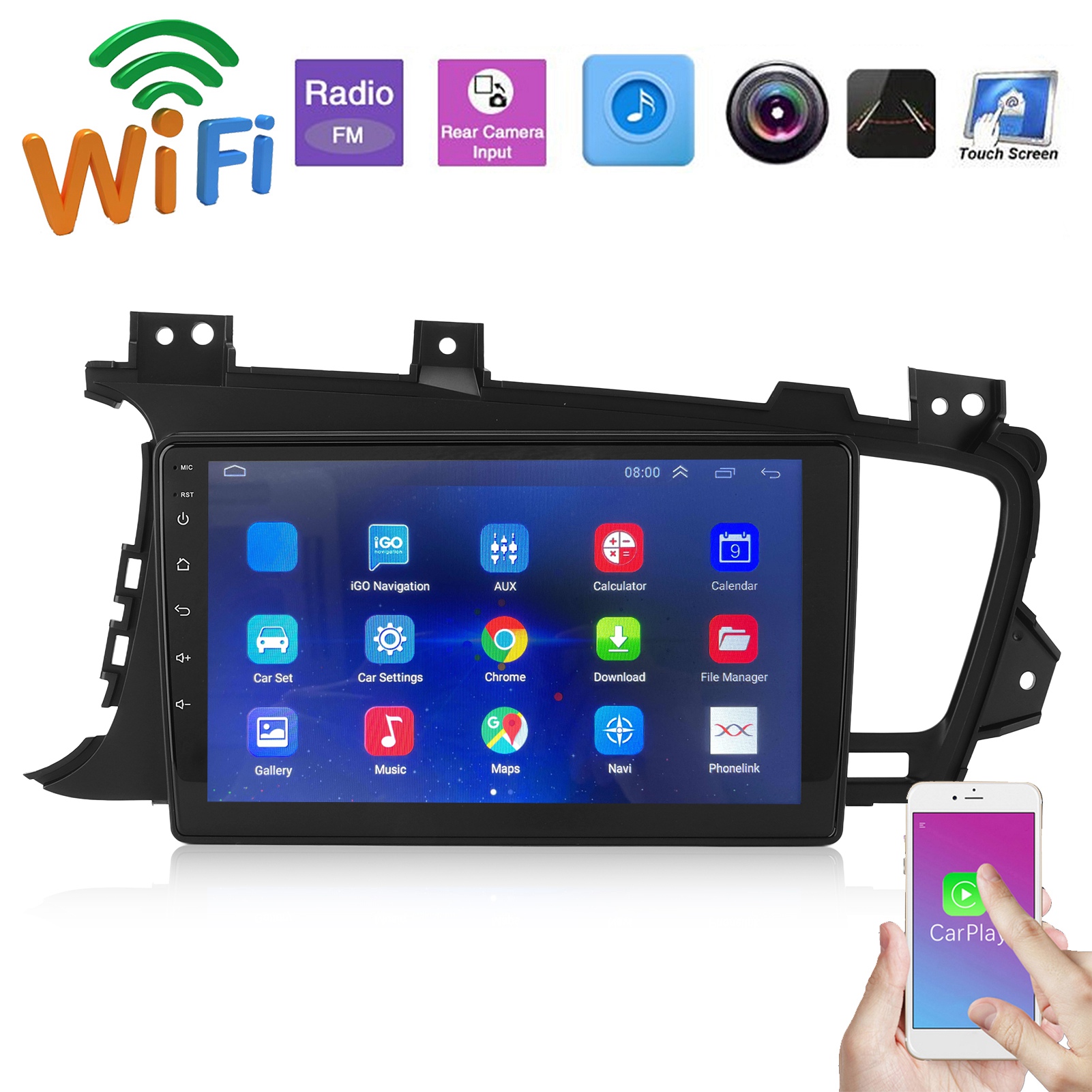 1、GPS Map: Support GPS maps, for example, support for Google Online Maps / for Navi Yandex / for Waze Online / for Sygic, etc. 2、Support: Support bluetooth hands free, support phone number book, support original car steering wheel buttons. 3、Wifi: Built in Wifi antenna to connect to nearby Wifi access point. You can use your phone as a WiFi access point. 4、Multiple Languages: Support multiple languages, Chinese (simplified), Russian, Spanish, Turkish, Hebrew, Italian, Chinese (traditional), Arabic, French, German, English, Portuguese, Korean, Thai and so on. 5、FM Function: The FM frequency range is 87.5‑108 MHz, and it integrated with 18 preconfigured stations.