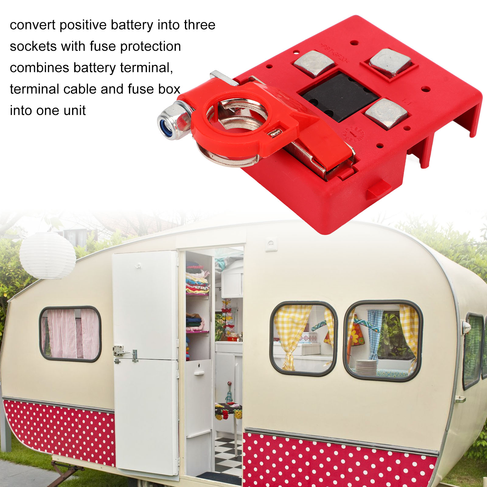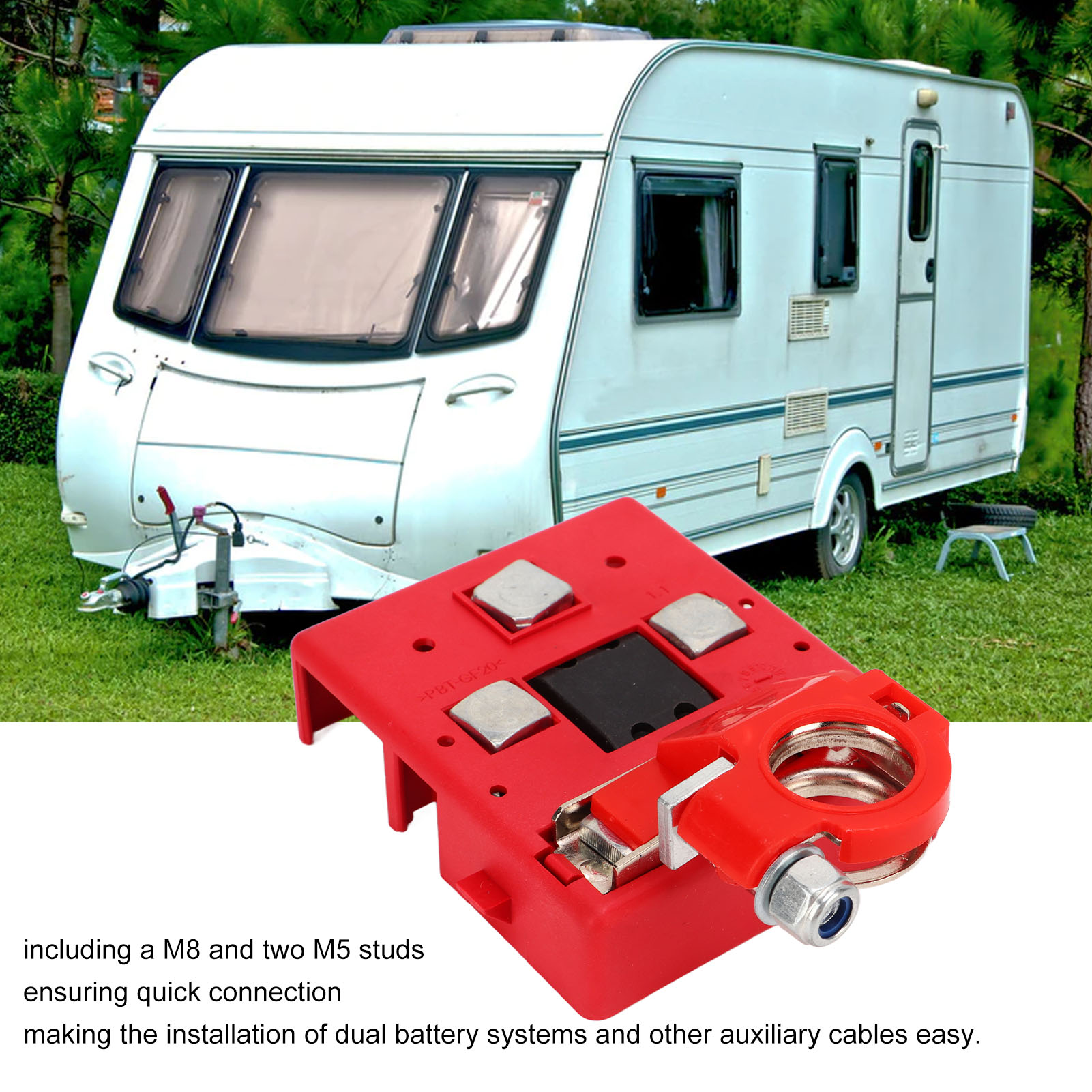 1、Excellent Function: Used to convert positive battery into three sockets with fuse protection, and combines battery terminal, terminal cable and fuse box into one unit to save space. 2、Professional Power Distribution Device: Allow the load of the starter motor or winch to operate without blowing the fuse, and sensitive enough to be blown off in the case of a direct short circuit. 3、3 Studs Design: Convenient for three fuse sockets, including a M8 and two M5 studs, ensuring quick connection, making the installation of dual battery systems and other auxiliary cables easy. 4、Scope of Application: Quick release car battery distribution connector is widely applicable to various kinds of cars, RVs, yachts, vans, trucks, caravans and much more to meet different demands. 5、Professional Production: The superior battery power distribution terminal is made of reliable metal and ABS, undergone extensive quality and safety testing to ensure long service life and strong durability.