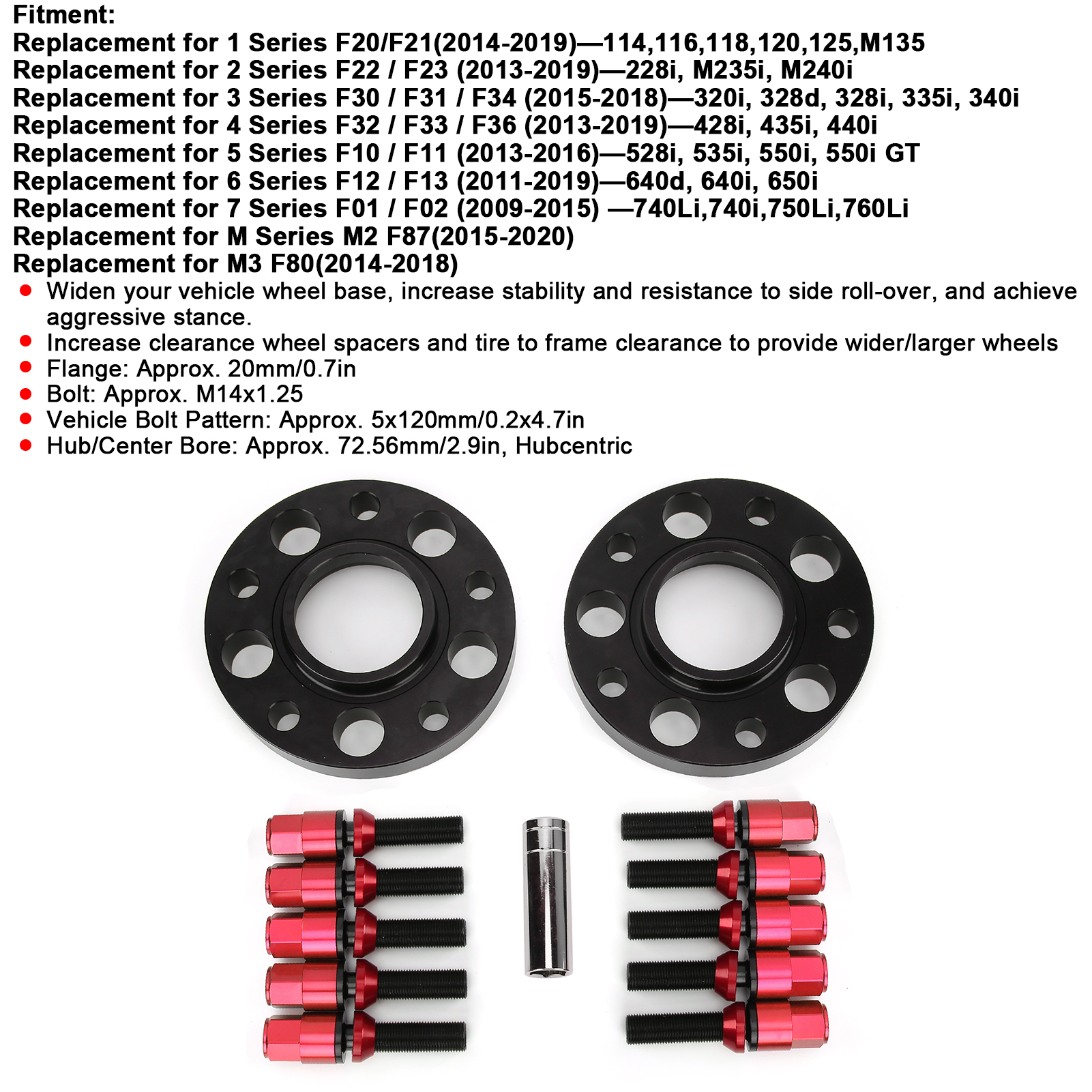 1、The wheel spacer is a wonderful replacement for 1 Series F20/F21(2014‑2019) ‑ 114,116,118,120,125,M135 and other models. 2、The wheel spacers widen your vehicle wheel base, increase stability and resistance to side roll‑over, and achieve aggressive stance. 3、Increase clearance wheel spacers and tire to frame clearance to provide wider/larger wheels to solve your problems. 4、Crafted from high quality 6061 T6 aluminum alloy and precisioned CNC machine to ensure a smooth and perfect fit your vehicle. 5、All the spacers go through a forging process to make the aluminum alloy as solid as it can be, have a longer service time.