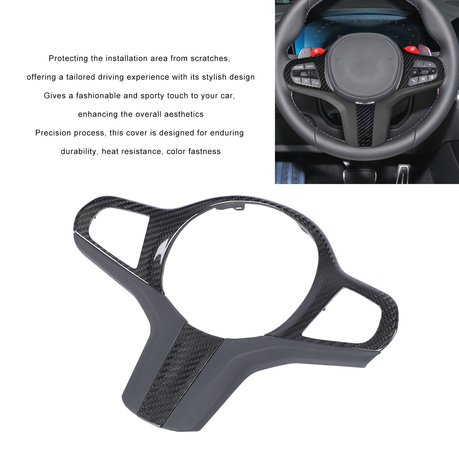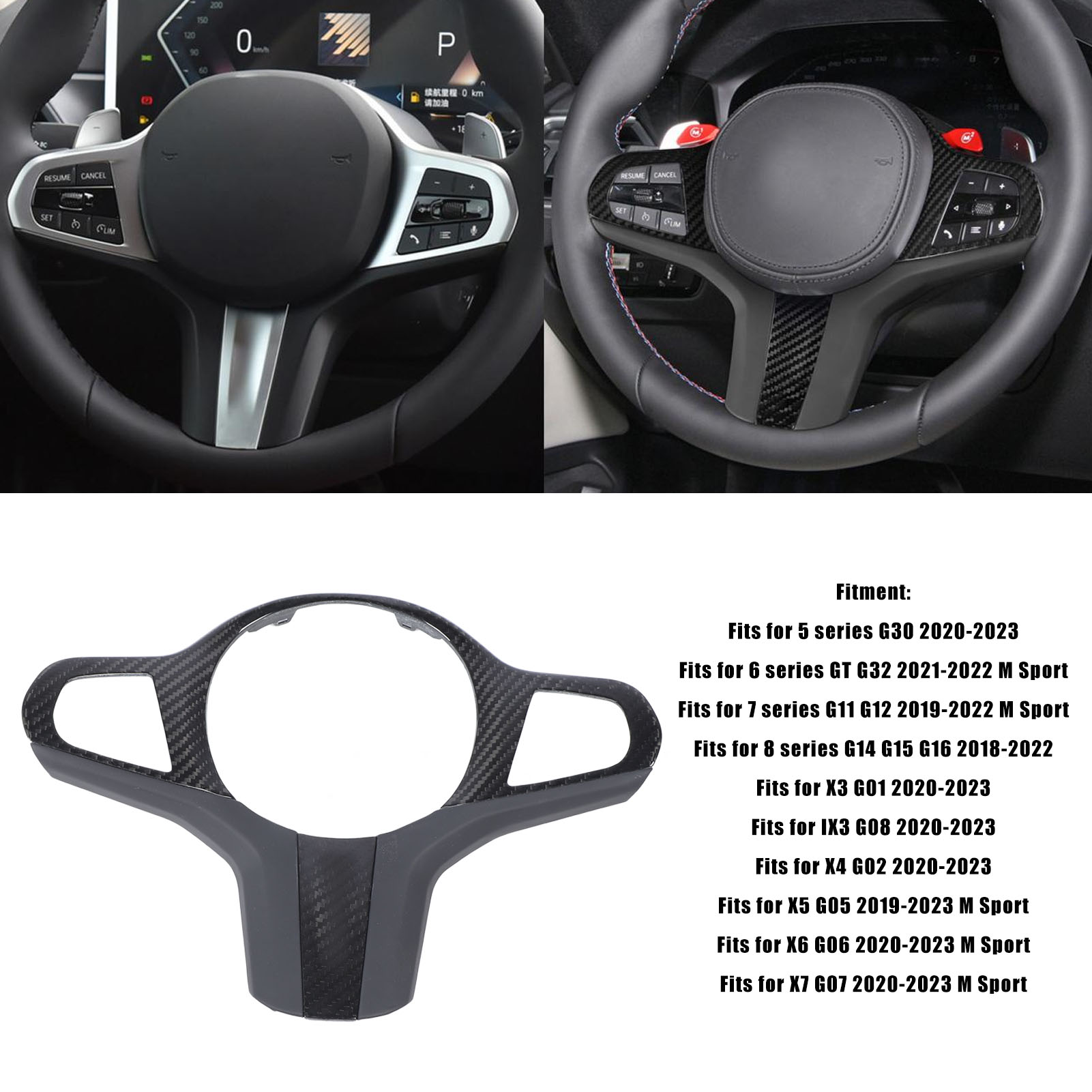 1、Applicable Model: The steering wheel cover is a replacement for 5 6 7 8 Series G30 G32 G11 G14, please check the model of your vehicle before ordering to confirm compatibility. 2、Enhanced Protection: Apart from protecting the installation area from scratches, it decorates the vehicle's interior, offering a tailored driving experience with its stylish design. 3、Sporty and Stylish Design: The dry carbon fiber trim gives a fashionable and sporty touch to your car, enhancing the overall aesthetics. 4、Durable and Resistant: Made from premium dry carbon fiber and Nappa leather, produced through a precision process, this cover is designed for enduring durability, heat resistance, color fastness. 5、Seamless Integration: This steering wheel cover can easily replace the existing cover, thus providing a precise fit and seamless integration with your vehicle's interior.