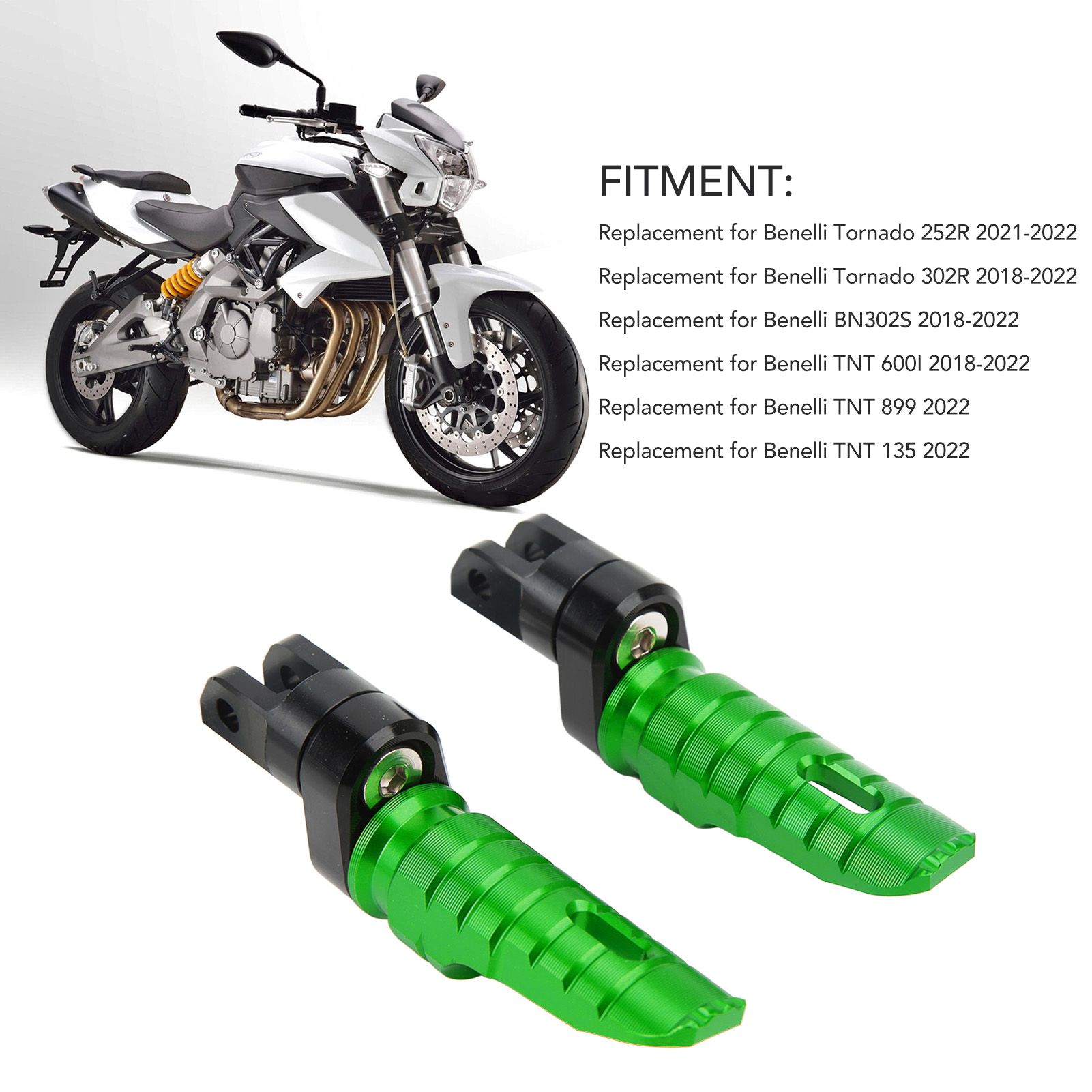 1、Fitment: The front foot peg is a replacement for Benelli Tornado 252R 2021‑2022, for Tornado 302R 2018‑2022, for BN302S 2018‑2022, for TNT 600I 2018‑2022. 2、Unique Design: The tubular design provides maximum strength without adding weight, which is a perfect replacement for your broken foot peg pedals. 3、Material: Made of high strength T6063 aluminum material, with CNC machined, resist to rusting and fading, wear proof, deformation proof and durable. 4、Fine Workmanship: Professional manufactured, exquisite workmanship with unique design, ensure stable performance and high reliability. 5、Easy Installation: It will perfectly match to your vehicle, do not require any modifications. You just need to take off your old motorcycle foot pegs, then install new replacement.