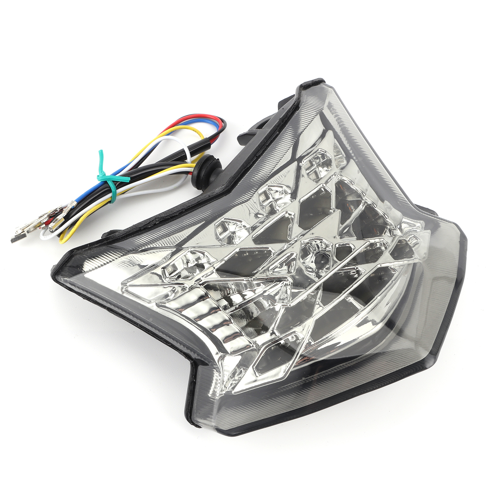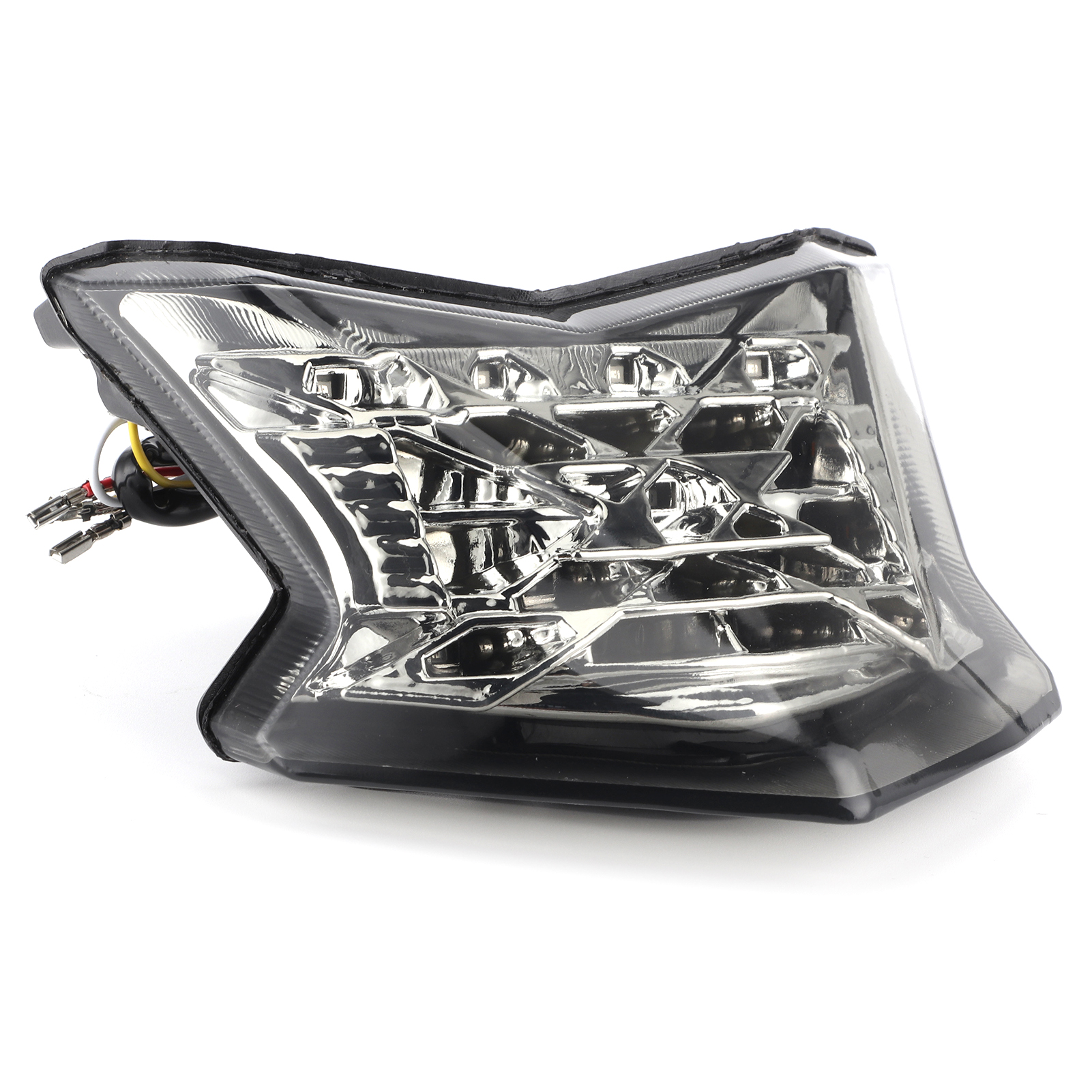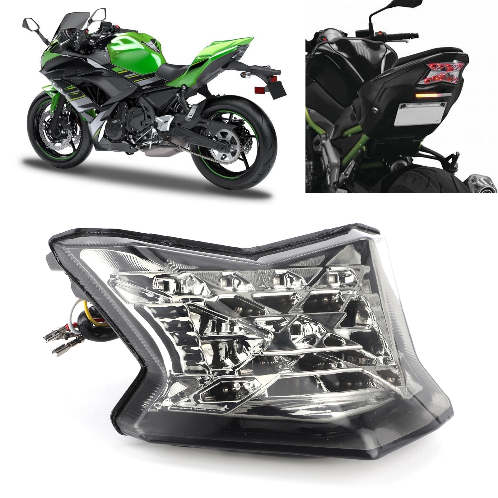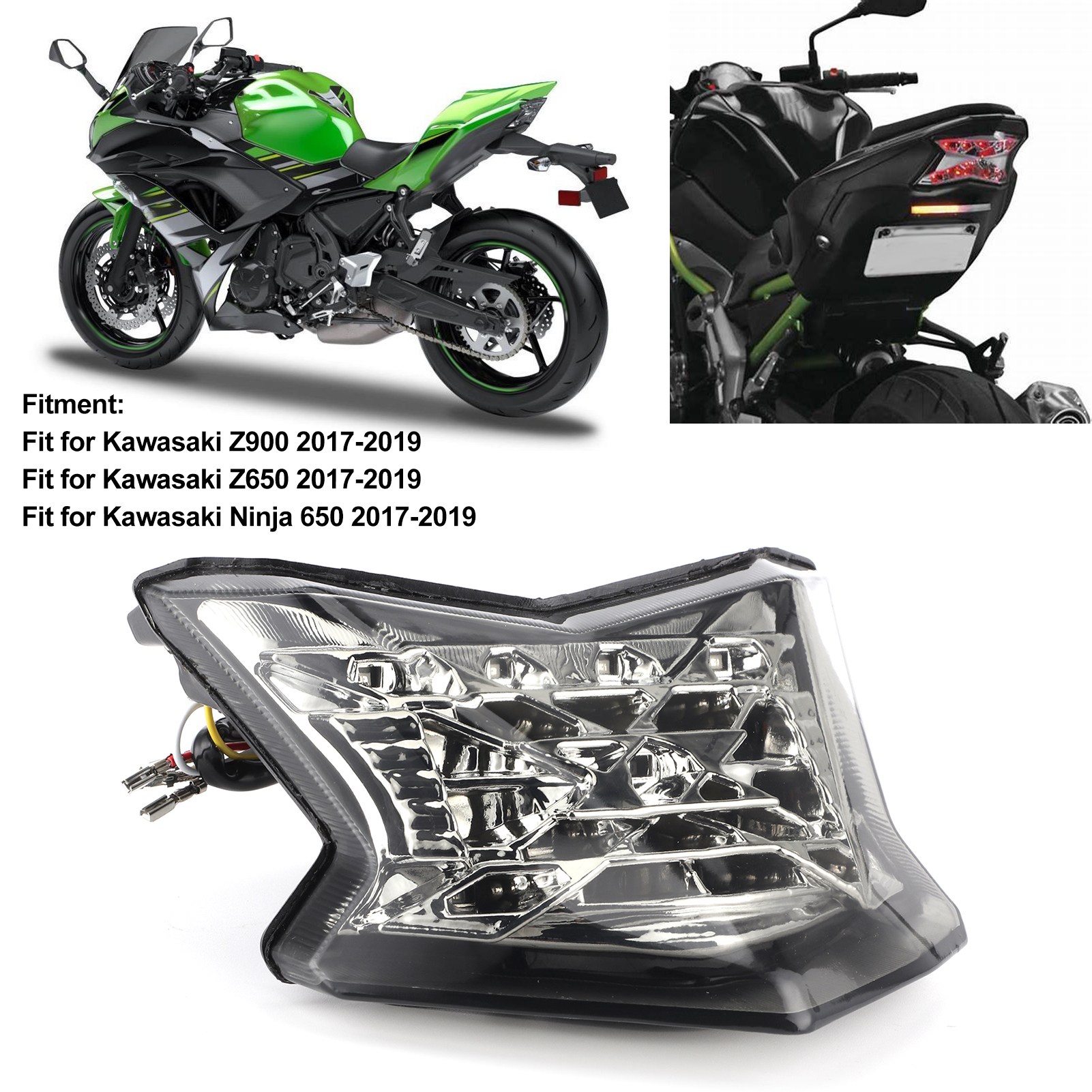1、Taillights assembly, with the functions of running light, brake light and turn signal. 2、Bright LED light, feature good luminous purity, improve visibility and enhance driving safety. 3、Streamlined styling, transparent lens, give your motorcycle a unique and stylish look. 4、Easy to install, convenient to use. Perfectly fit for Kawasaki Z900/Z650/Ninja 650 2017‑2019. 5、Adopt premium PVC plastic, high impact resistance, rugged and durable to use.