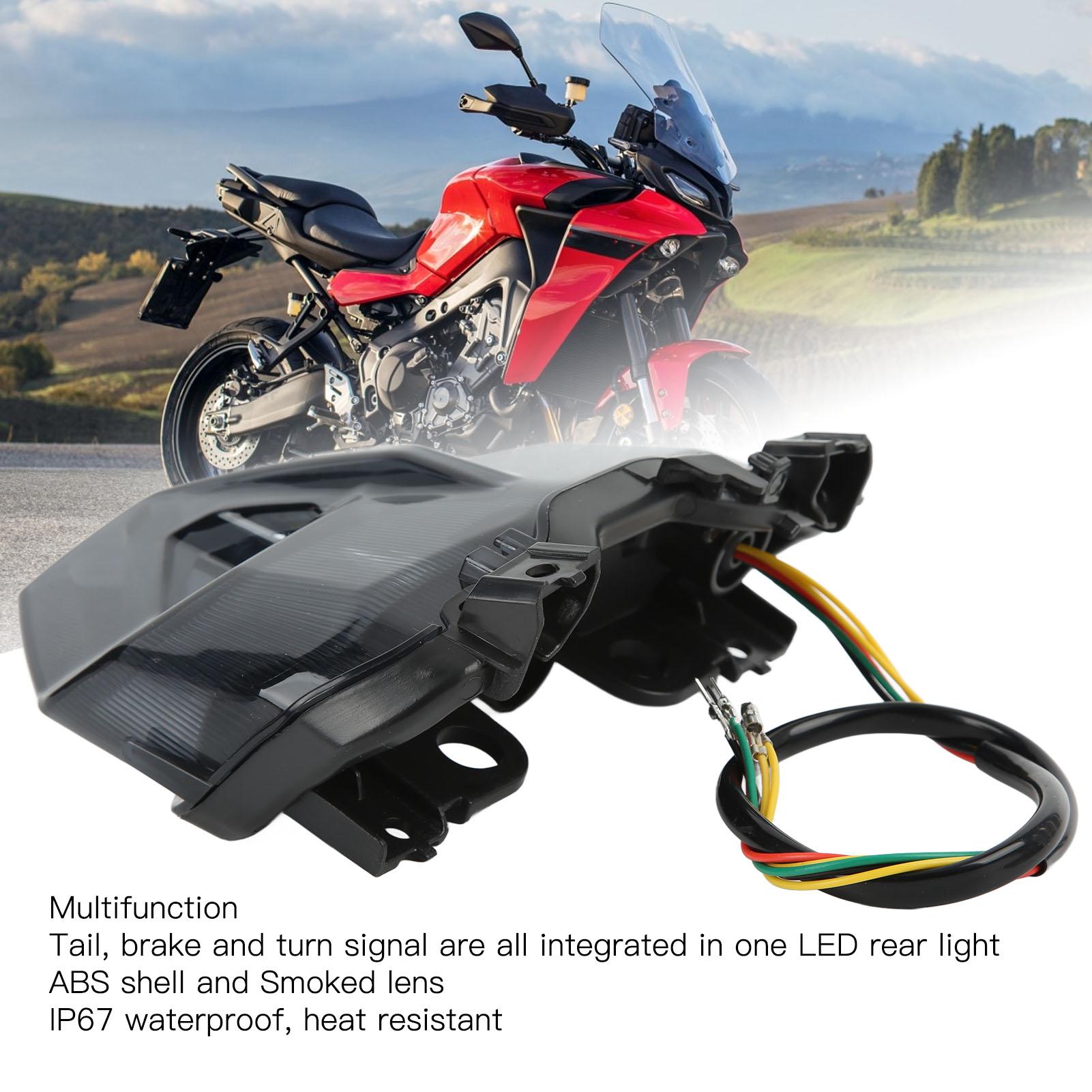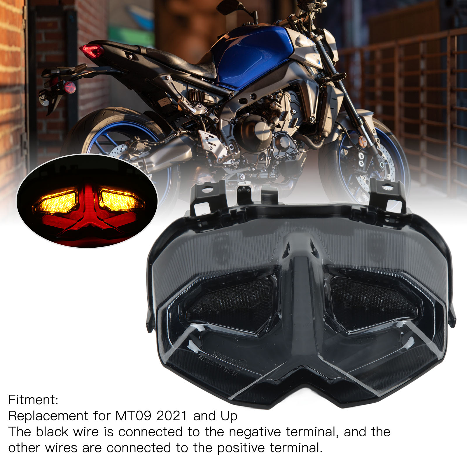 1、Fitment: Motorcycle LED tail lamp is professionally manufactured, with high performance, perfect replacement for MT09 2021 and Up. 2、Multifunction: Motorcycle LED light is multifunctional, with functions of turn signal light, tail light and brake light, meet your different needs. 3、Waterproof: Motorcycle brake light is made of ABS housing and PMMA lens, IP67 waterproof grade, weather resistant, no fear of rain and wind. 4、Energy Saving: Motorcycle rear stop light uses high quality LED, which not only has high brightness, but also has low power comsuption, long lasting. 5、Simple to Operate: Motorcycle turn signal tail light is easy to install, plug and play, no need for wiring or coding, perfect fit your motorcycle.