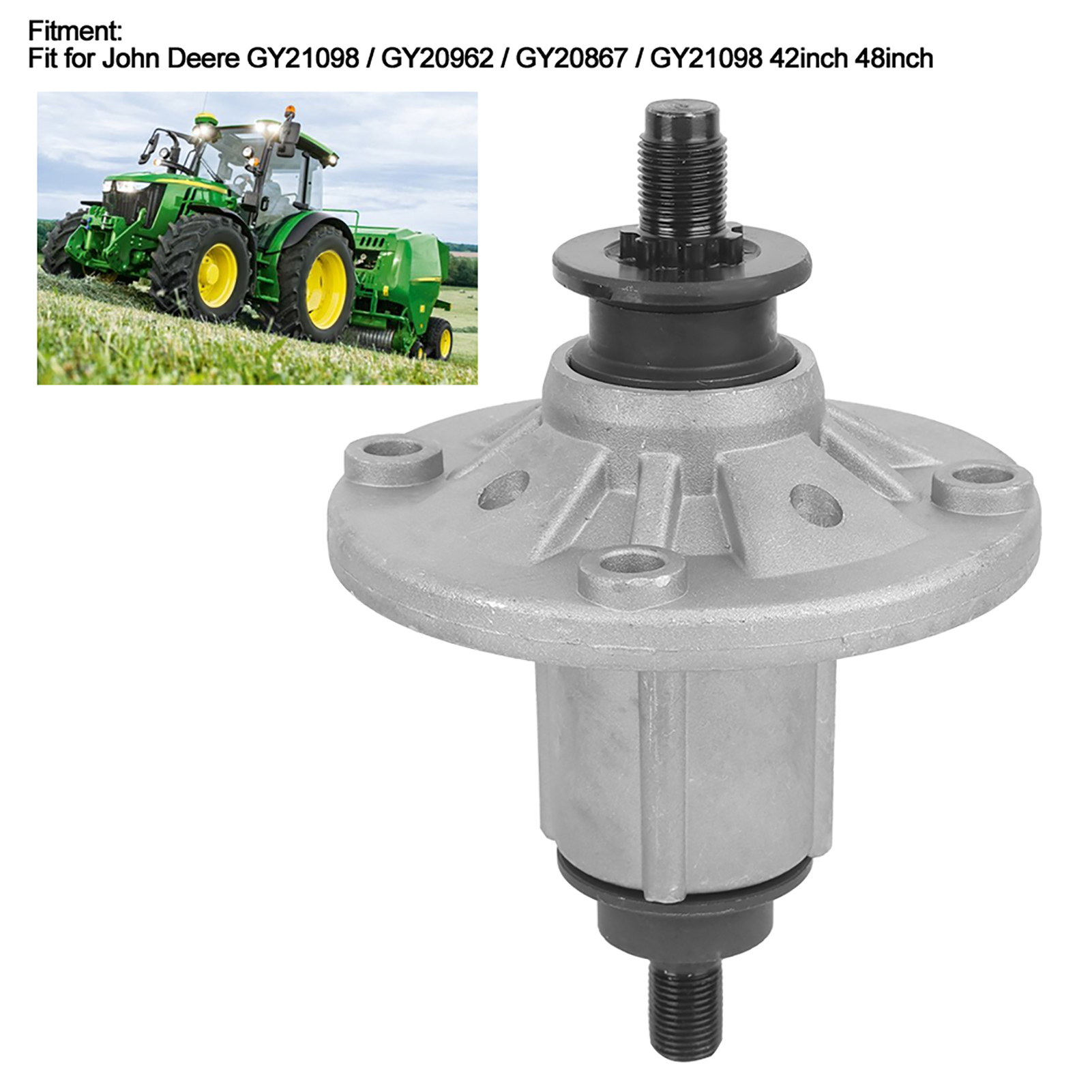 1、Special designed for John Deere GY21098 / GY20962 / GY20867 / GY21098 42inch 48inch. 2、Made of quality iron material, durable and reliable in use, having long service time. 3、Easy and convenient for installation and disassemble, reliable and durable to use. 4、Wonderful replacement for the old or broken one, directly fitment. 5、Keep your lawn mower running smoothly with this spindle assembly.