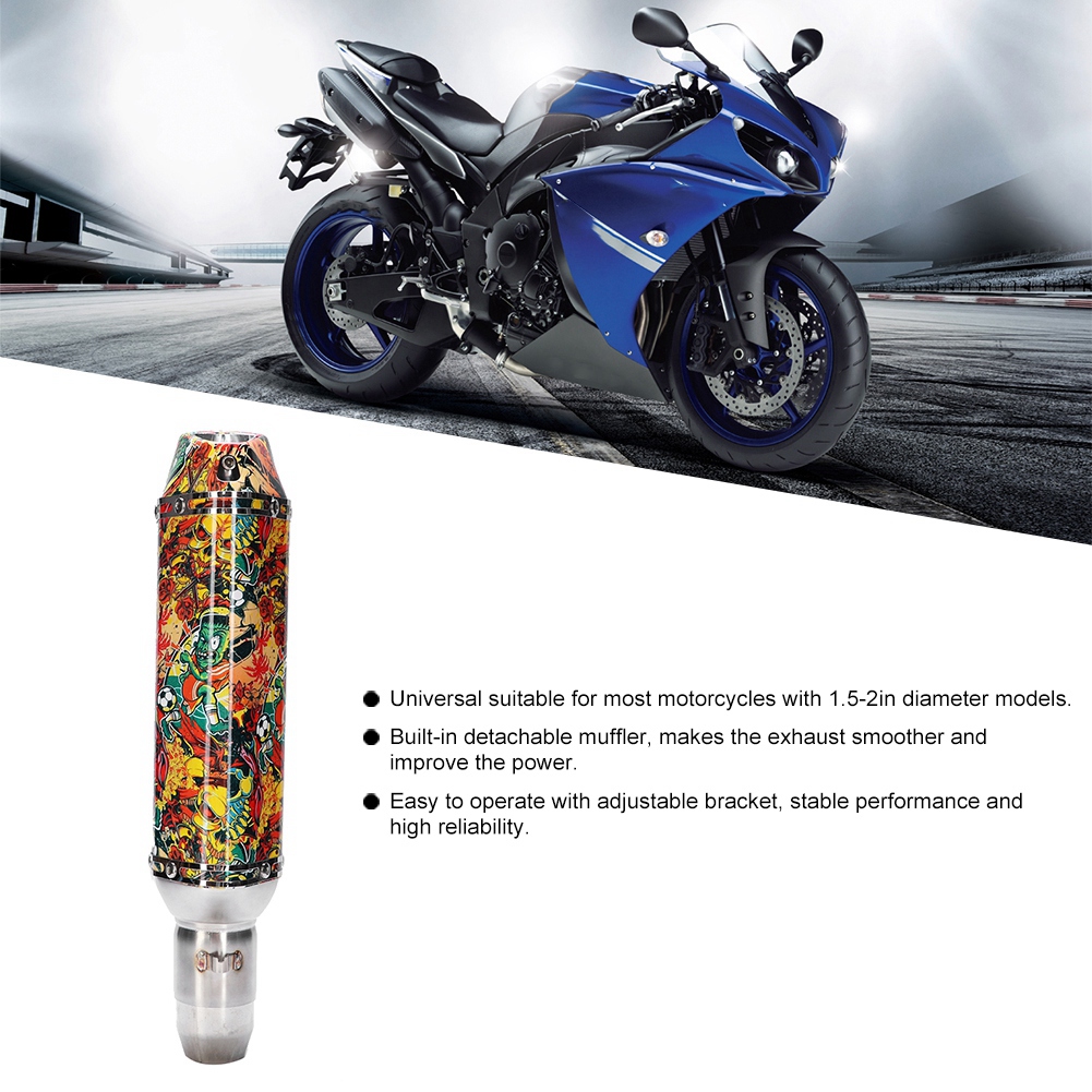 1、Built-in detachable muffler, makes the exhaust smoother and improve the power. 2、Universal suitable for most motorcycles with 1.5-2in diameter models. 3、Made of high quality stainless steel material, durable, corrosion resistance and rustproof. 4、Easy to operate with adjustable bracket, stable performance and high reliability. 5、Exquisite workmanship and fashionable design, it will enhance the look of your motorcycle.