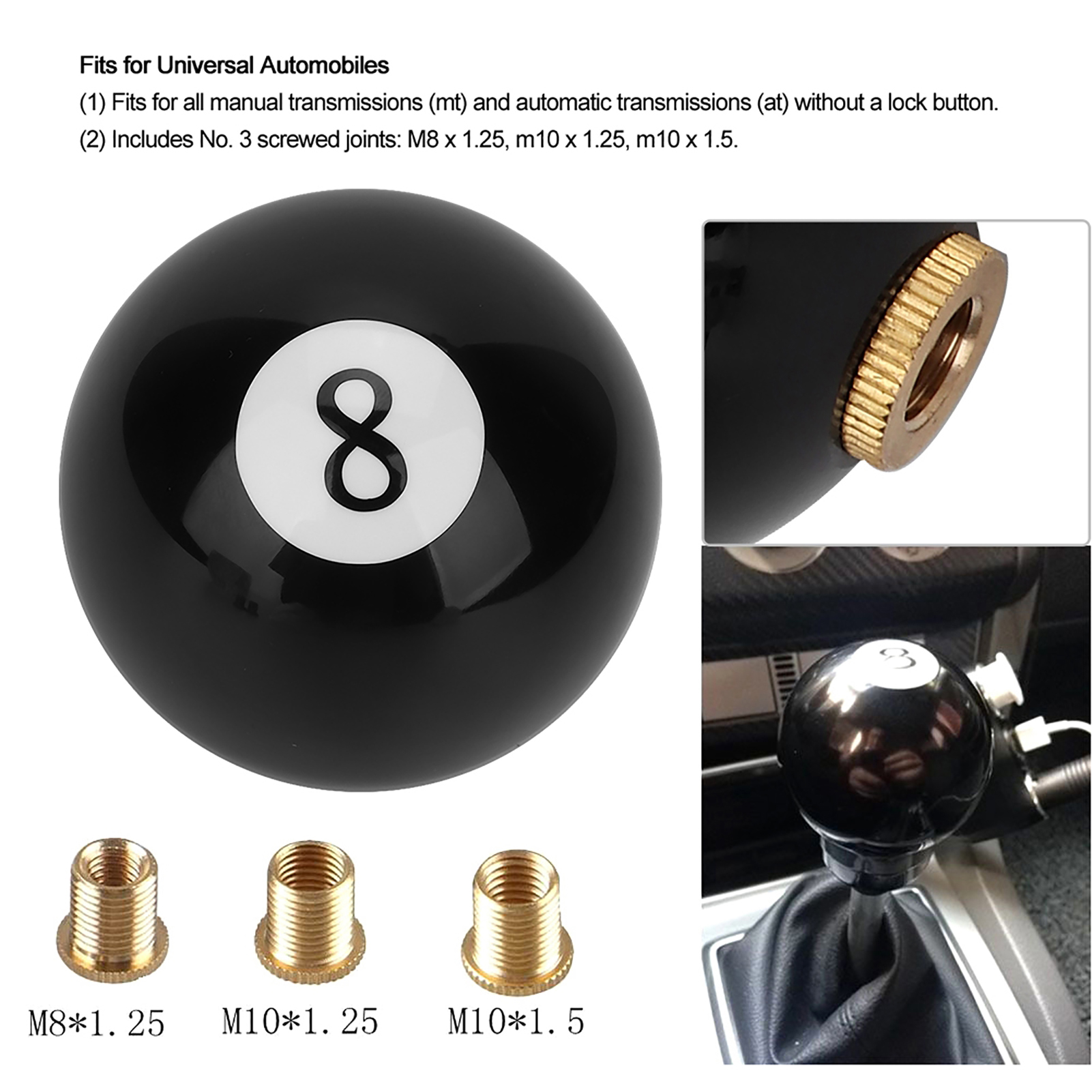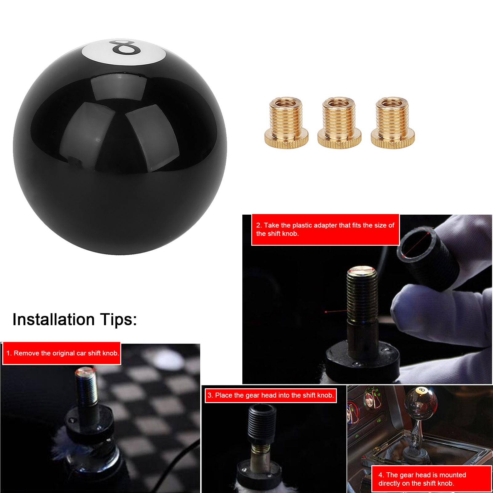 1、Fine workmanship, user-friendly design, comfortable hand feel. 2、A unique billiards appearance design can add a luxurious and stylish look to your car. 3、Easy to install and disassemble, simply disassemble the old one and change a new one. 4、It is suitable for universal automobiles,and it's perfect for your car. 5、Convenient to use and operate, and the gear head can be mounted directly on the shift knob.