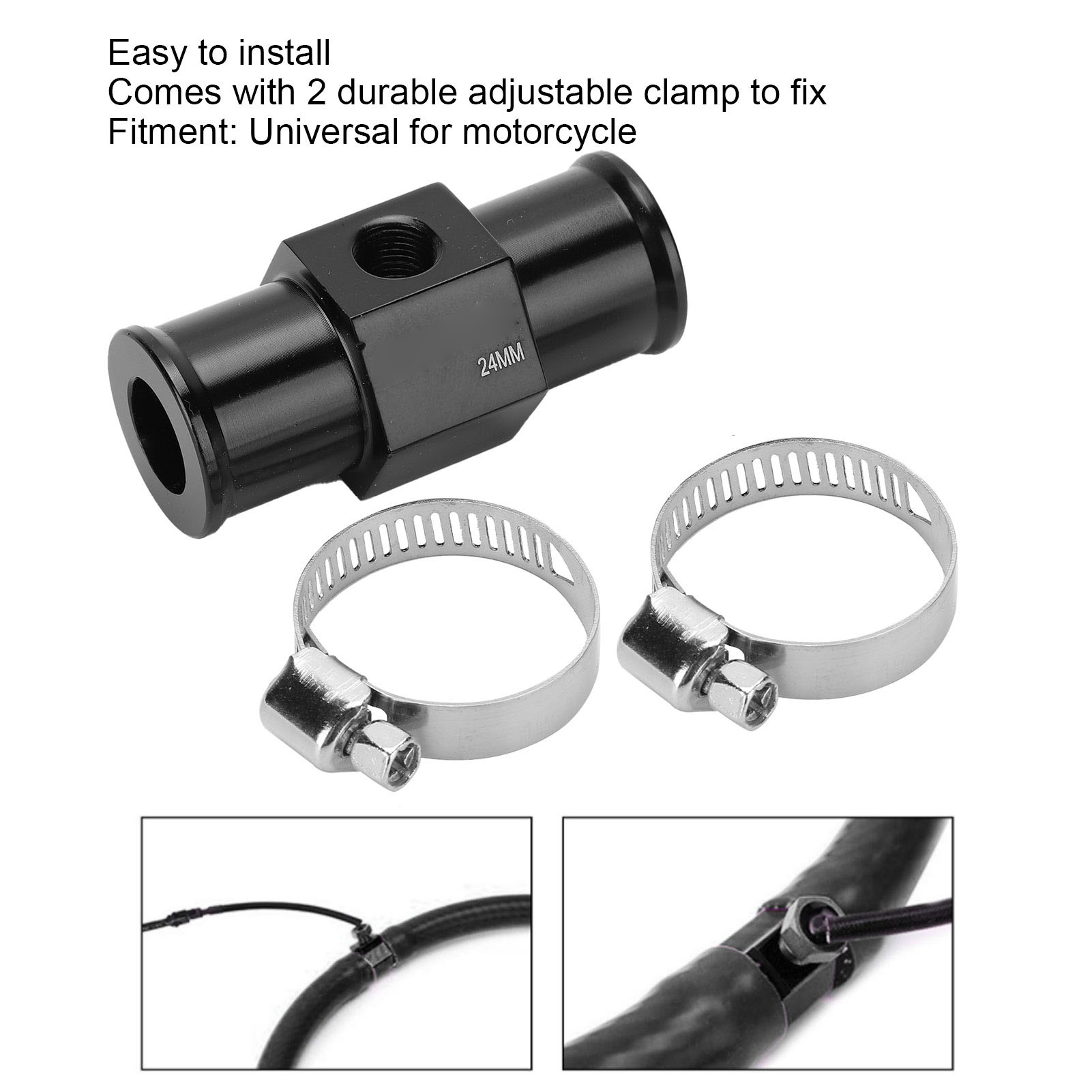 1、Water temp adapter can be installed in the water pipe of the cooling water tank. 2、Providing the accurate installation location of the water thermometer sensor (not include). 3、With CNC anodized treatment, bright and durable, good heat conduction effect. 4、Easy to install, with 2 durable adjustable clamp to fix. Suitable for most motorcycles. 5、With the use of high‑quality aluminum alloy material, high performance and long service life.