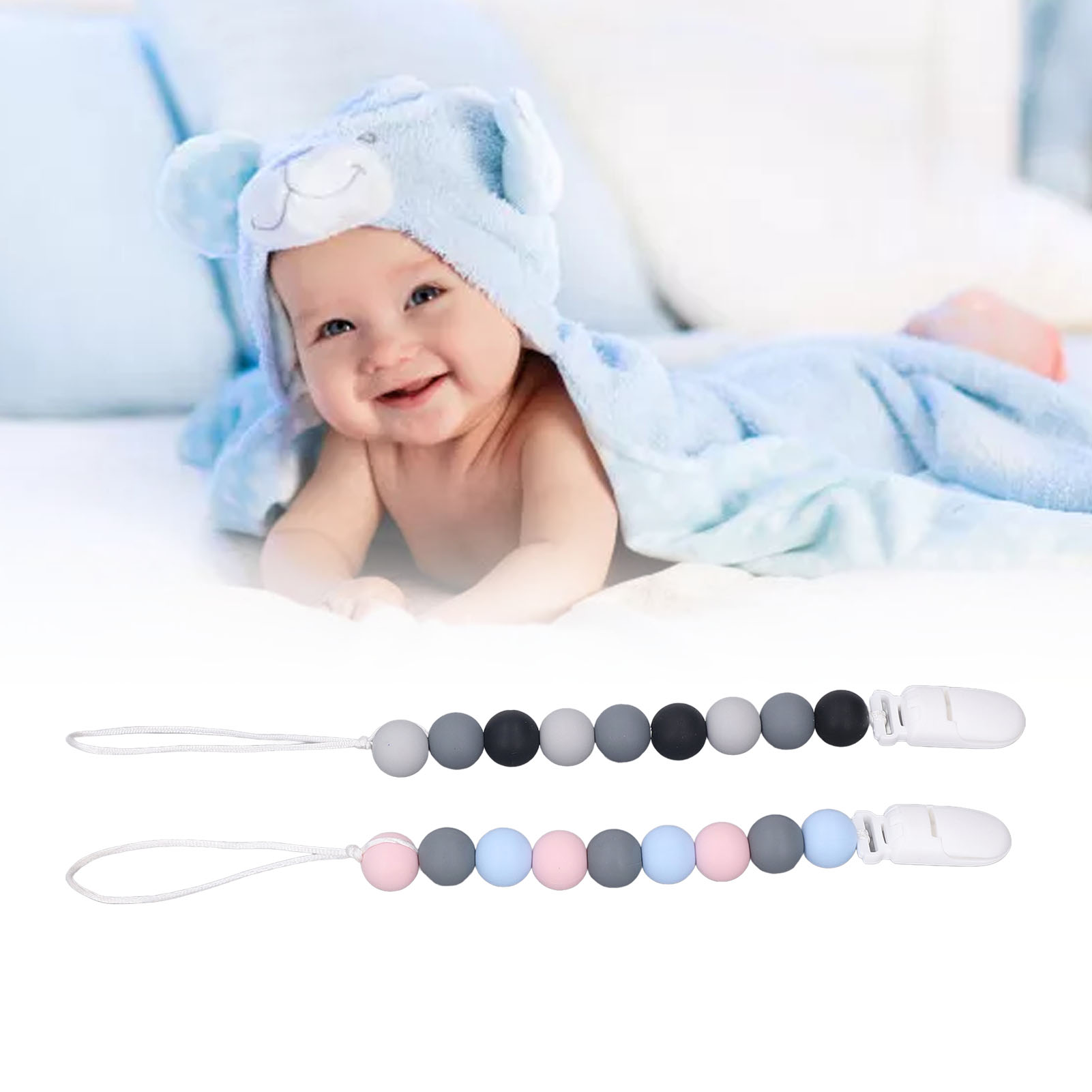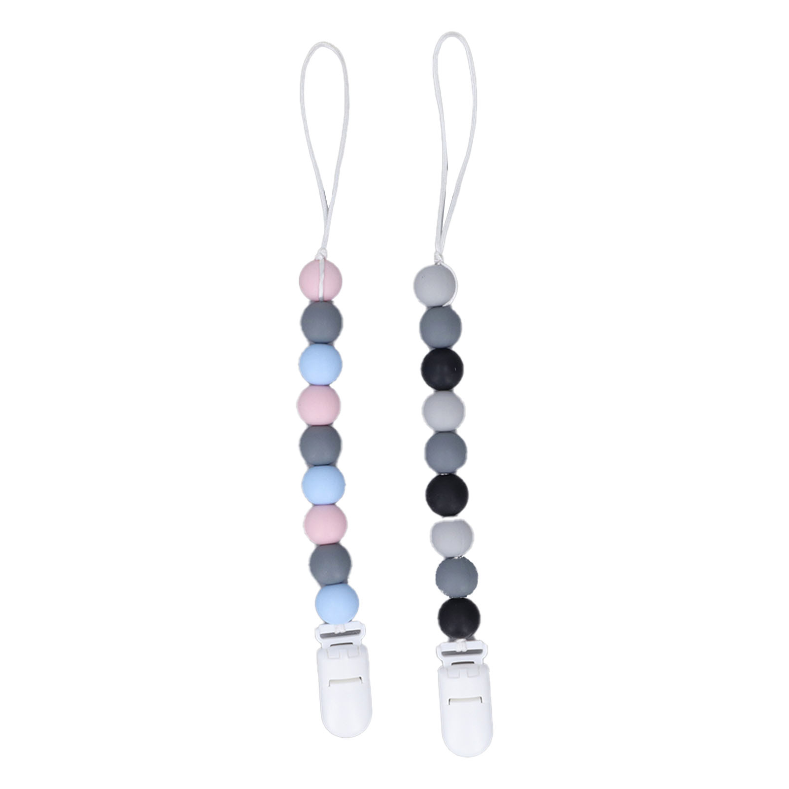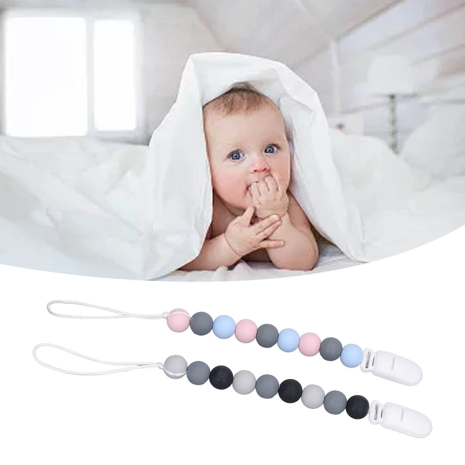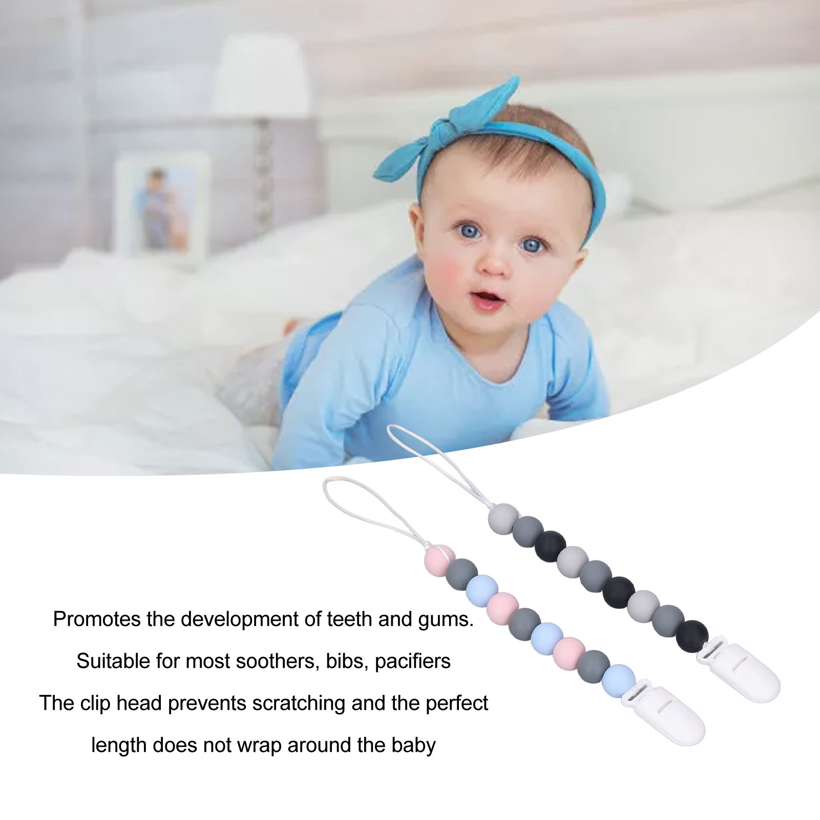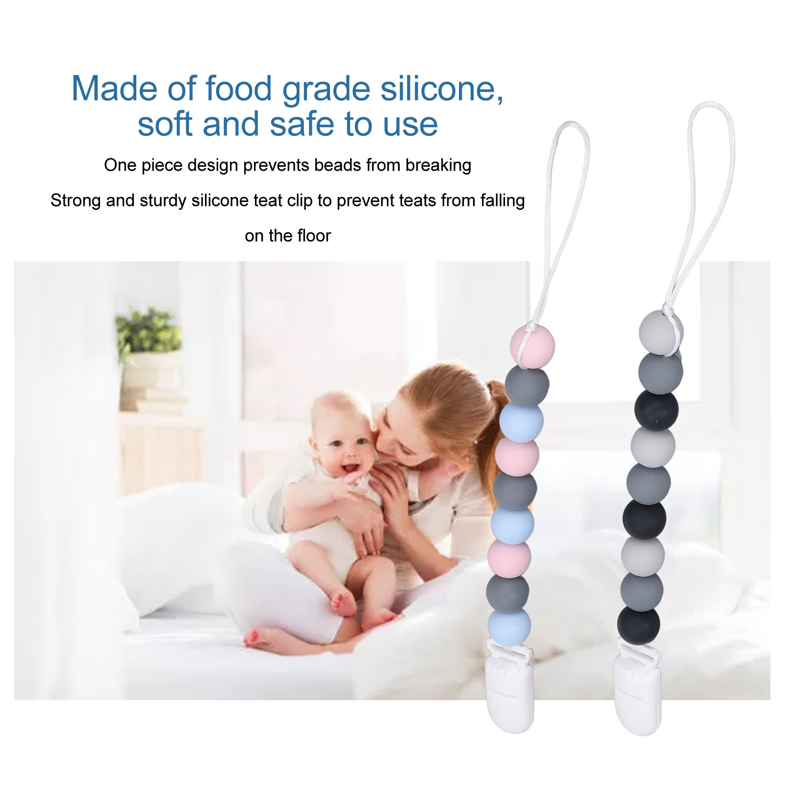 1、Material: The pacifier clip holder is made of food grade silicone, soft, safe to use, strong and sturdy to prevent the pacifier from falling on the floor. 2、One Piece Design: Our pacifier holder is a one piece design that prevents the beads from breaking, the clip head prevents scratching the baby and the perfect length won't wrap around the baby. 3、Multifunctional: The soother holder promotes the development of teeth and gums and it fits most soothers, bibs and pacifiers. 4、Applicability: The pacifier holders are suitable for use for all babies, boys and girls, the perfect gift for baby shower, birthdays, Christmas etc. 5、Easy To Use And Clean: Simply attach baby's pacifier or teething toy to one end and use the clip to attach the other end to clothes, blankets, car seats, prams or nappy bags. These clips can be washed by hand, simply clean with pacifier wipes or wash with warm water, rinse well and drying.