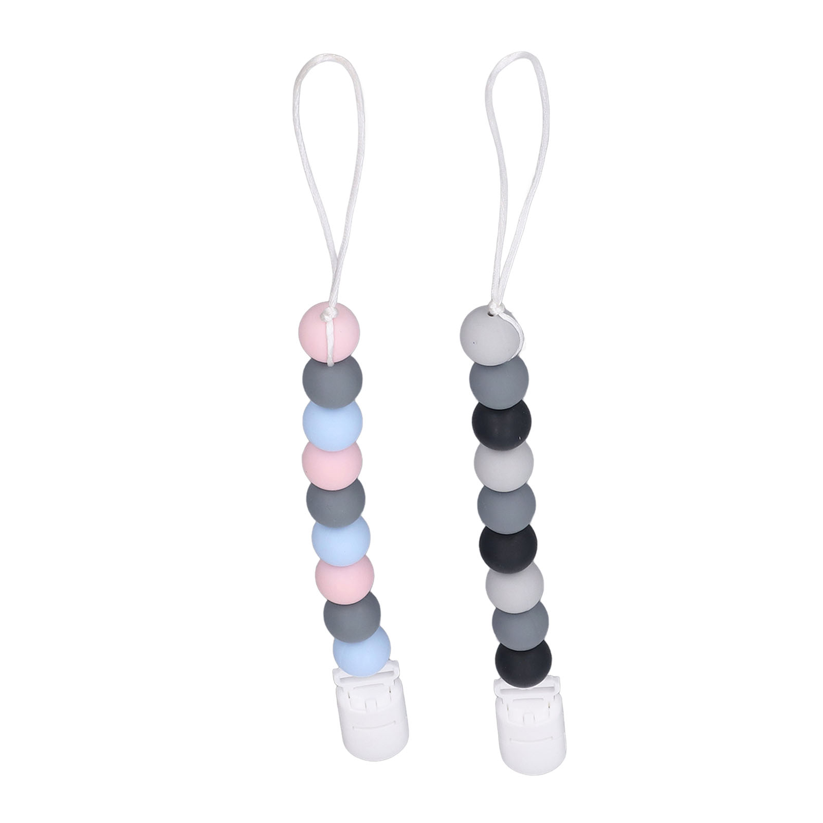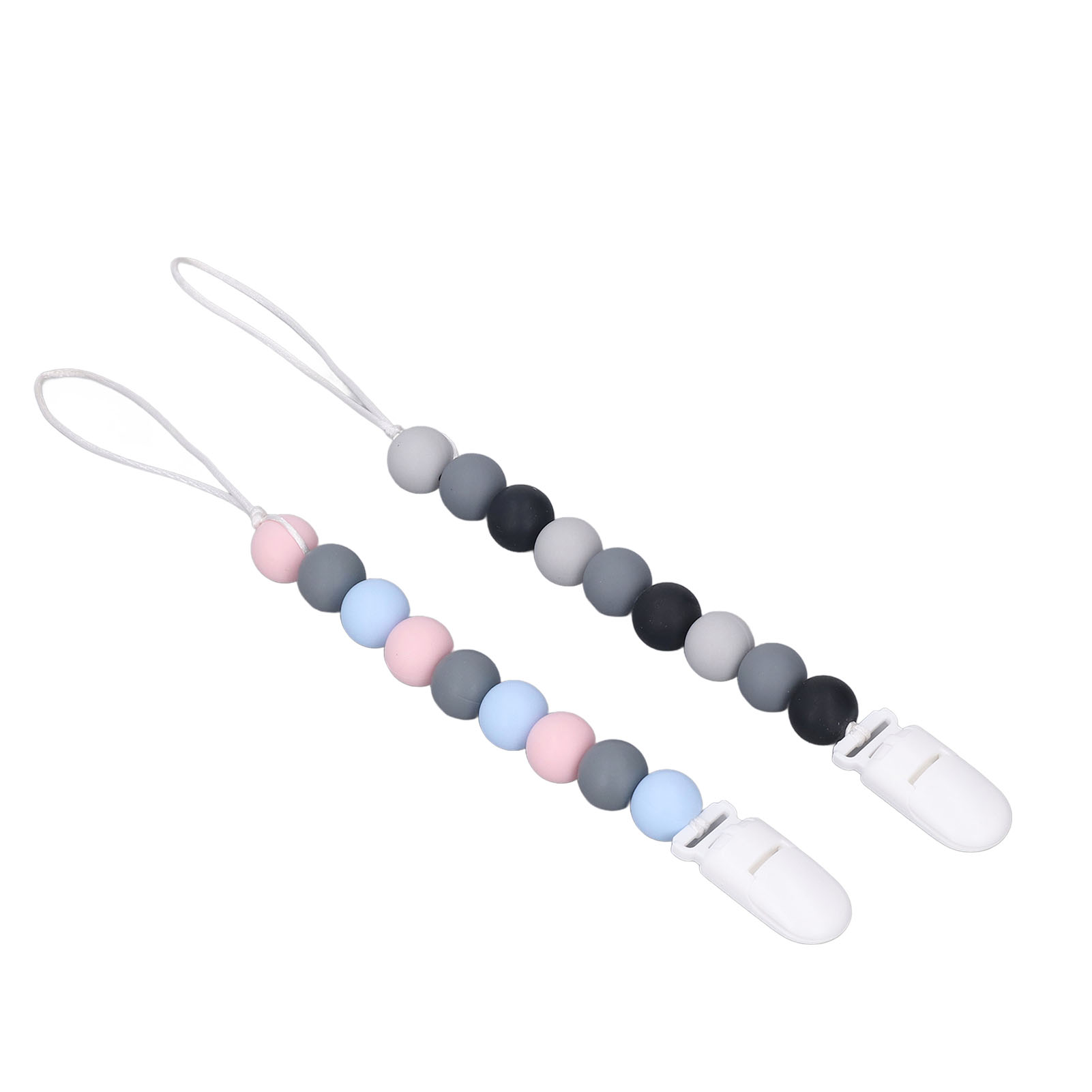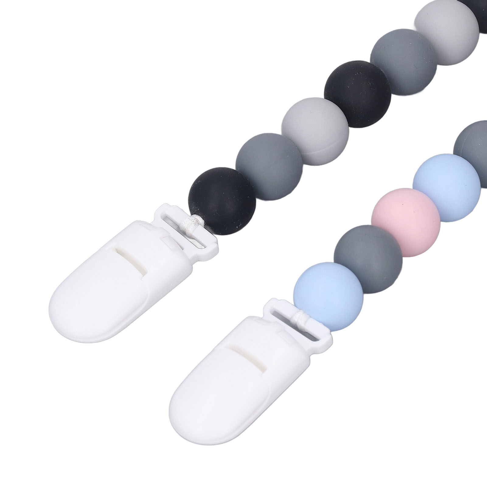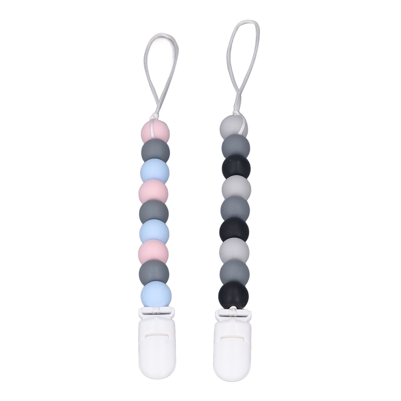 1、Material: The pacifier clip holder is made of food grade silicone, soft, safe to use, strong and sturdy to prevent the pacifier from falling on the floor. 2、One Piece Design: Our pacifier holder is a one piece design that prevents the beads from breaking, the clip head prevents scratching the baby and the perfect length won't wrap around the baby. 3、Multifunctional: The soother holder promotes the development of teeth and gums and it fits most soothers, bibs and pacifiers. 4、Applicability: The pacifier holders are suitable for use for all babies, boys and girls, the perfect gift for baby shower, birthdays, Christmas etc. 5、Easy To Use And Clean: Simply attach baby's pacifier or teething toy to one end and use the clip to attach the other end to clothes, blankets, car seats, prams or nappy bags. These clips can be washed by hand, simply clean with pacifier wipes or wash with warm water, rinse well and drying.