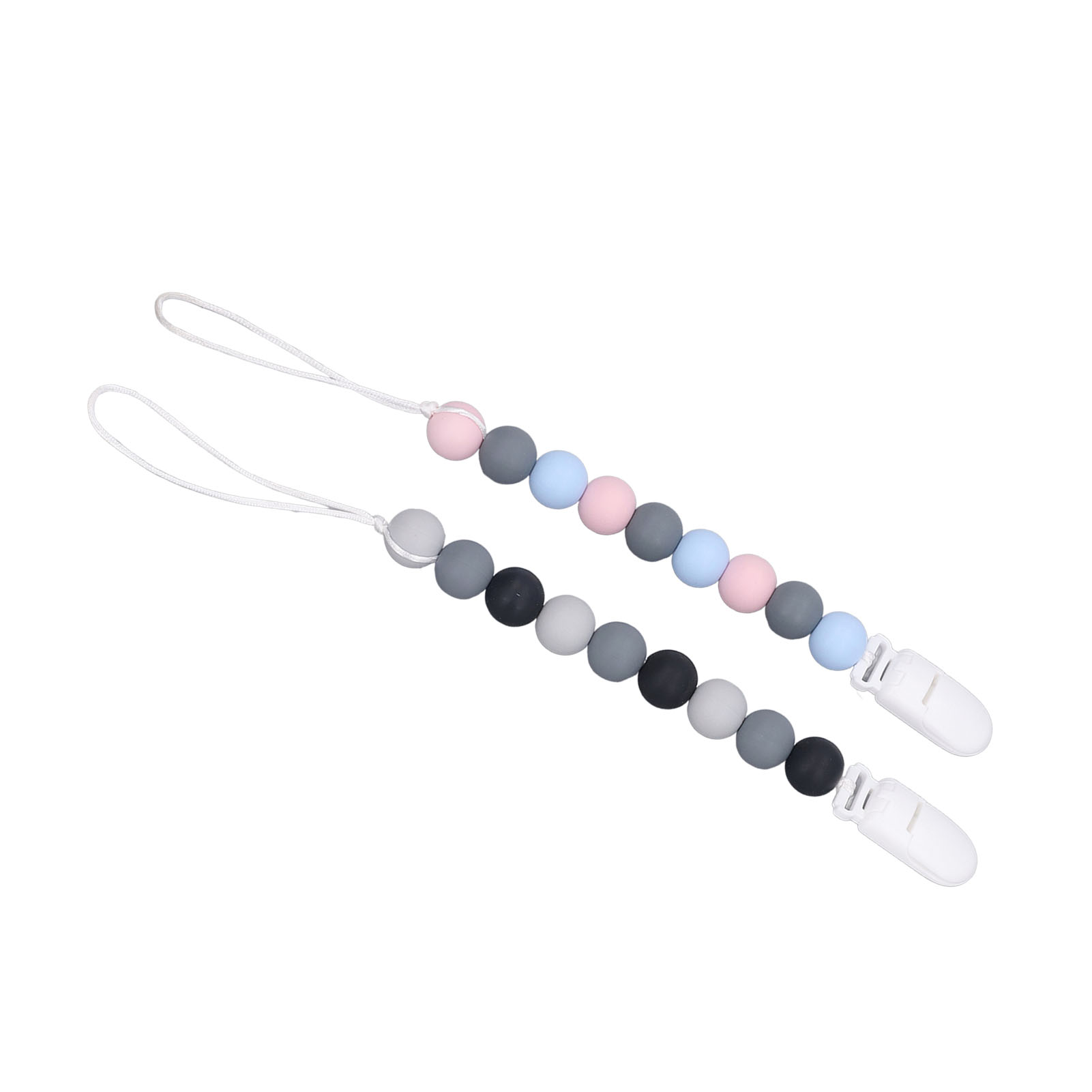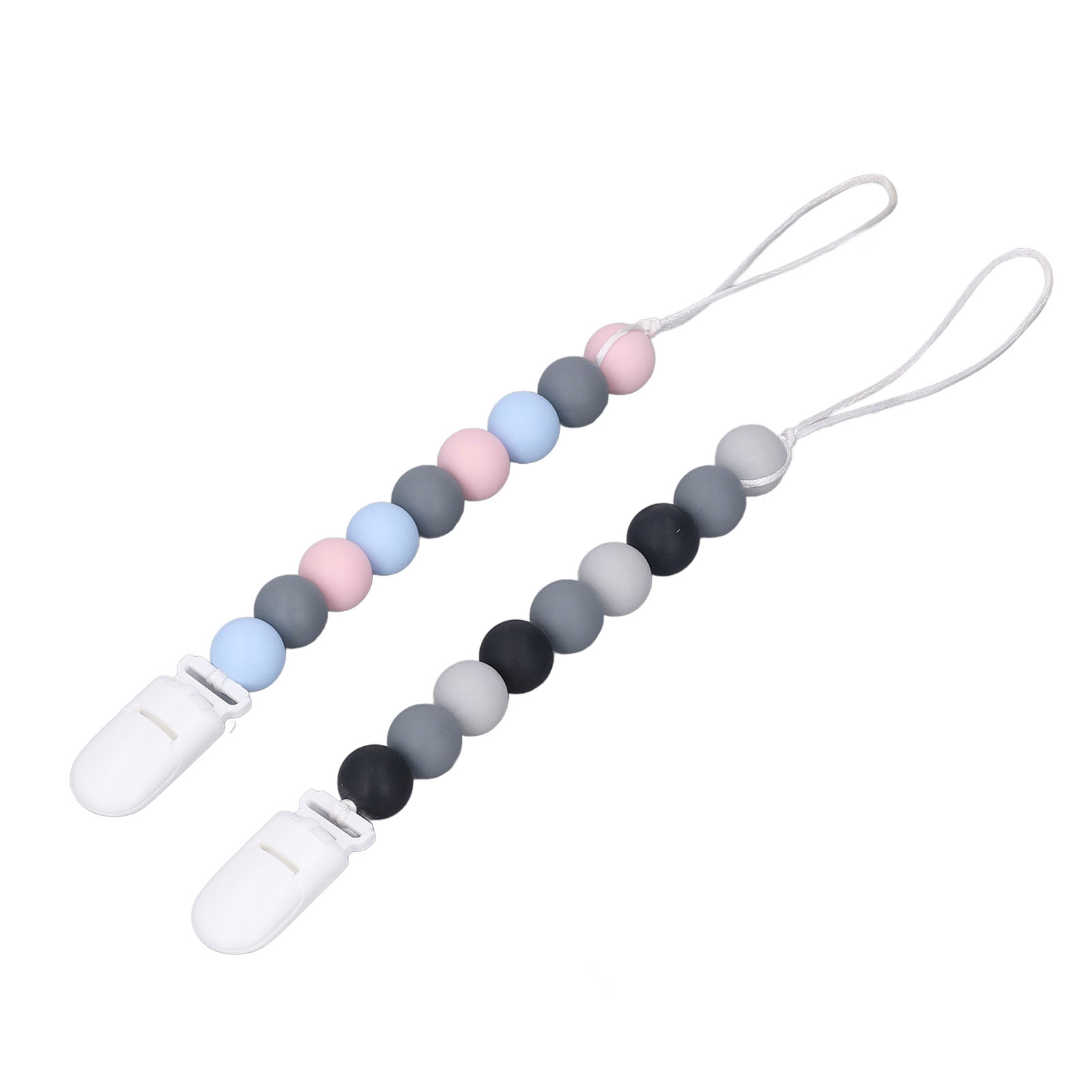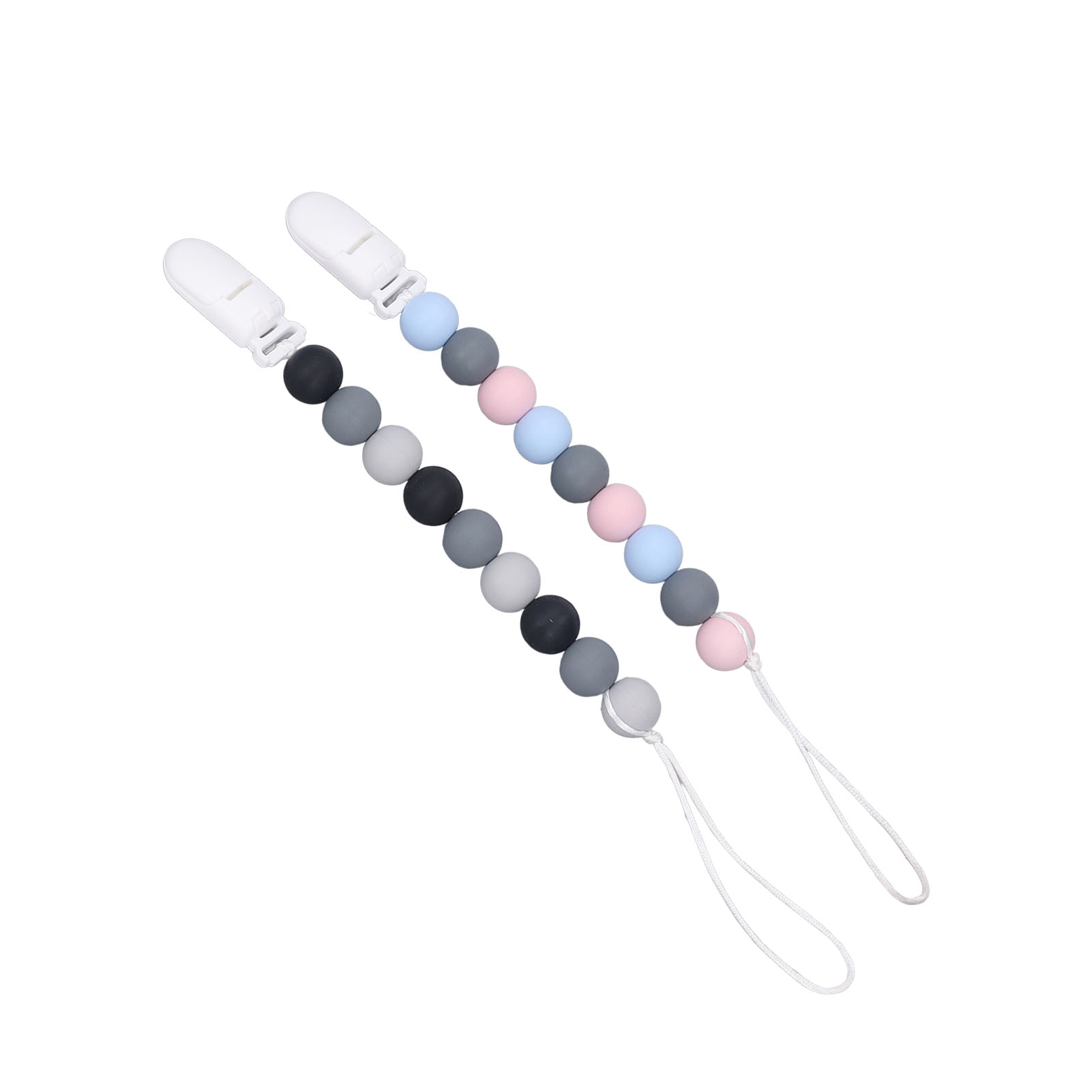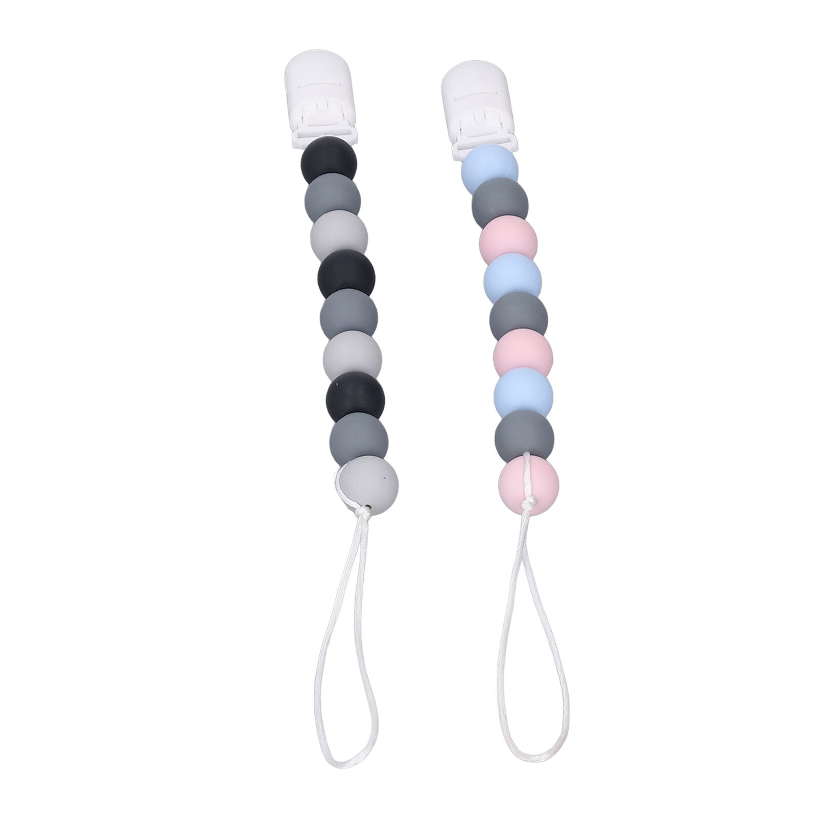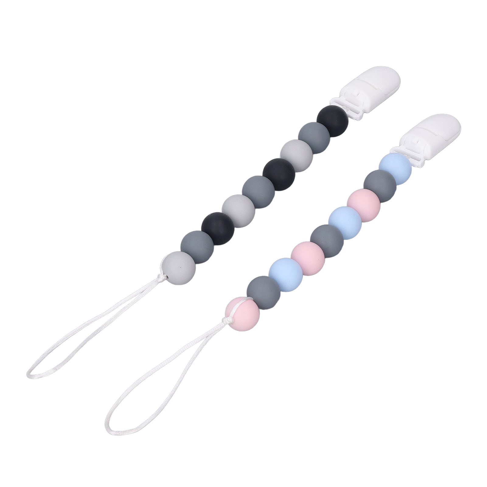 1、Material: The pacifier clip holder is made of food grade silicone, soft, safe to use, strong and sturdy to prevent the pacifier from falling on the floor. 2、One Piece Design: Our pacifier holder is a one piece design that prevents the beads from breaking, the clip head prevents scratching the baby and the perfect length won't wrap around the baby. 3、Multifunctional: The soother holder promotes the development of teeth and gums and it fits most soothers, bibs and pacifiers. 4、Applicability: The pacifier holders are suitable for use for all babies, boys and girls, the perfect gift for baby shower, birthdays, Christmas etc. 5、Easy To Use And Clean: Simply attach baby's pacifier or teething toy to one end and use the clip to attach the other end to clothes, blankets, car seats, prams or nappy bags. These clips can be washed by hand, simply clean with pacifier wipes or wash with warm water, rinse well and drying.
