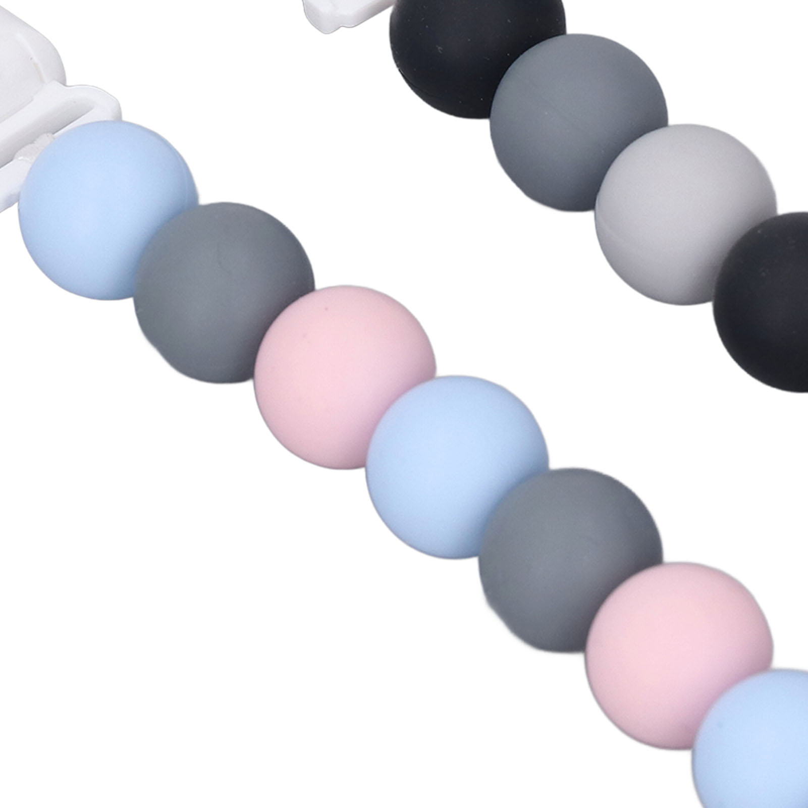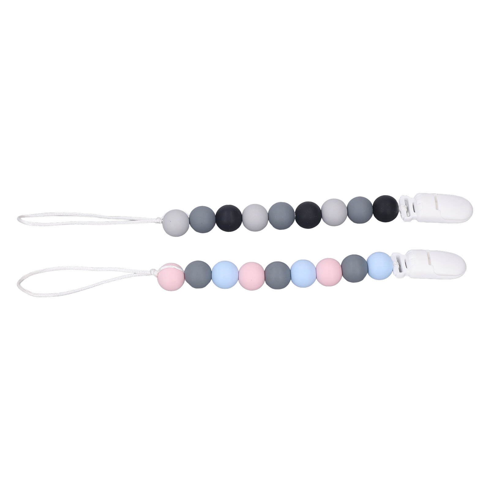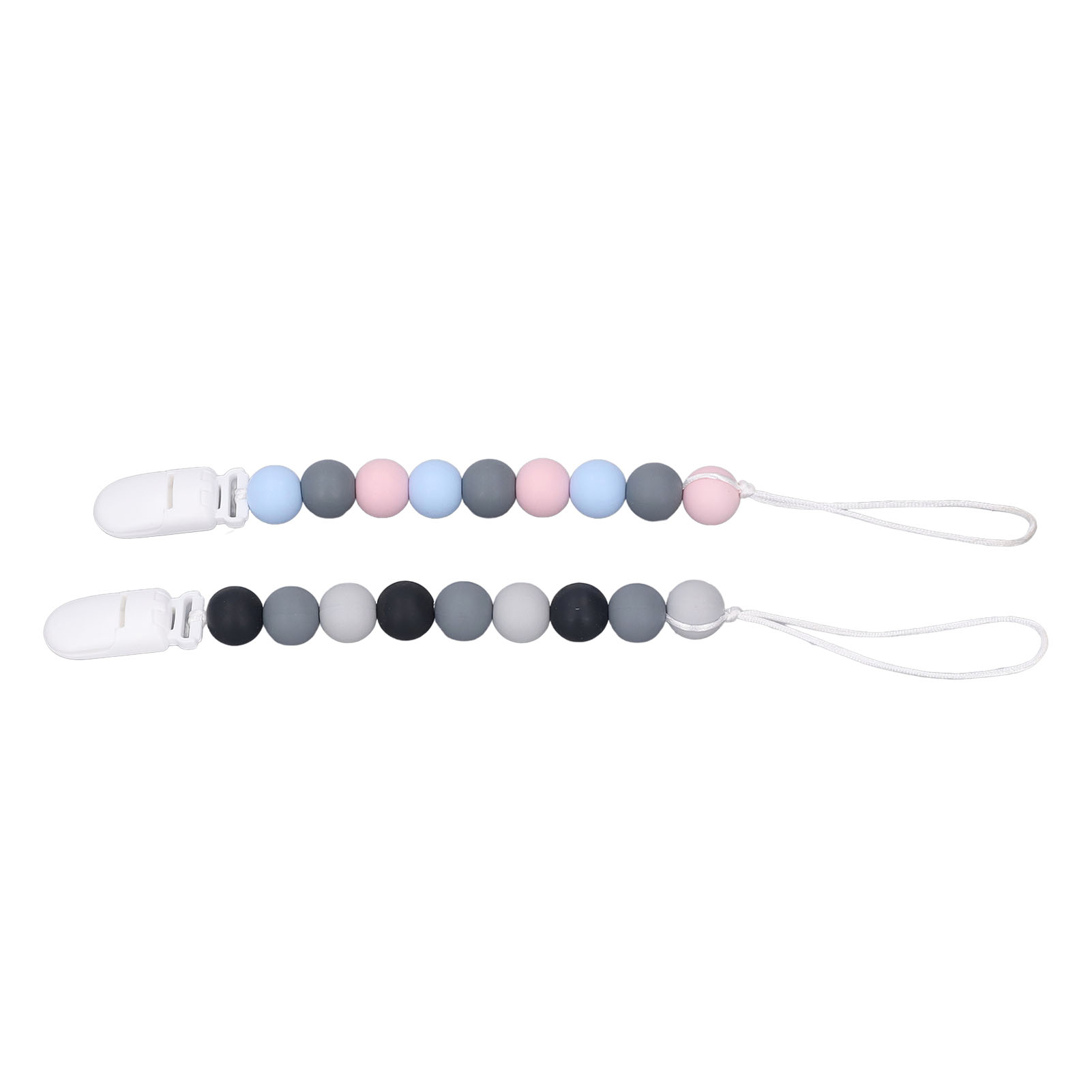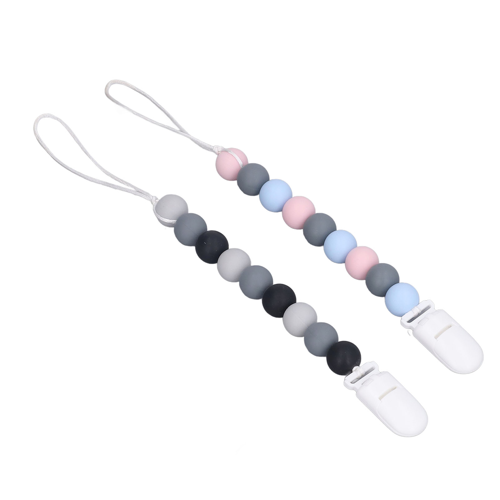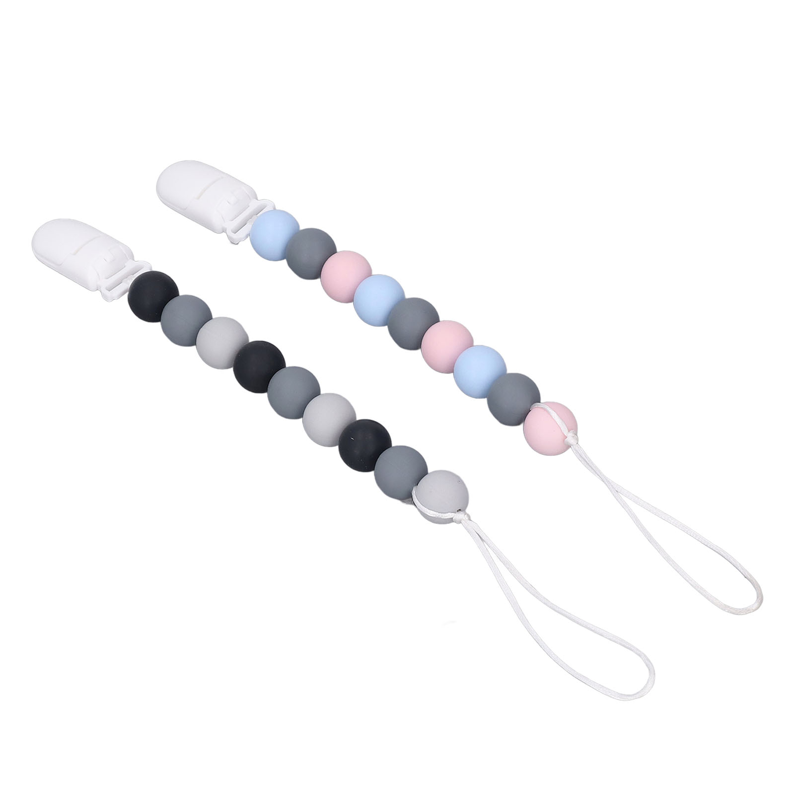 1、Material: The pacifier clip holder is made of food grade silicone, soft, safe to use, strong and sturdy to prevent the pacifier from falling on the floor. 2、One Piece Design: Our pacifier holder is a one piece design that prevents the beads from breaking, the clip head prevents scratching the baby and the perfect length won't wrap around the baby. 3、Multifunctional: The soother holder promotes the development of teeth and gums and it fits most soothers, bibs and pacifiers. 4、Applicability: The pacifier holders are suitable for use for all babies, boys and girls, the perfect gift for baby shower, birthdays, Christmas etc. 5、Easy To Use And Clean: Simply attach baby's pacifier or teething toy to one end and use the clip to attach the other end to clothes, blankets, car seats, prams or nappy bags. These clips can be washed by hand, simply clean with pacifier wipes or wash with warm water, rinse well and drying.
