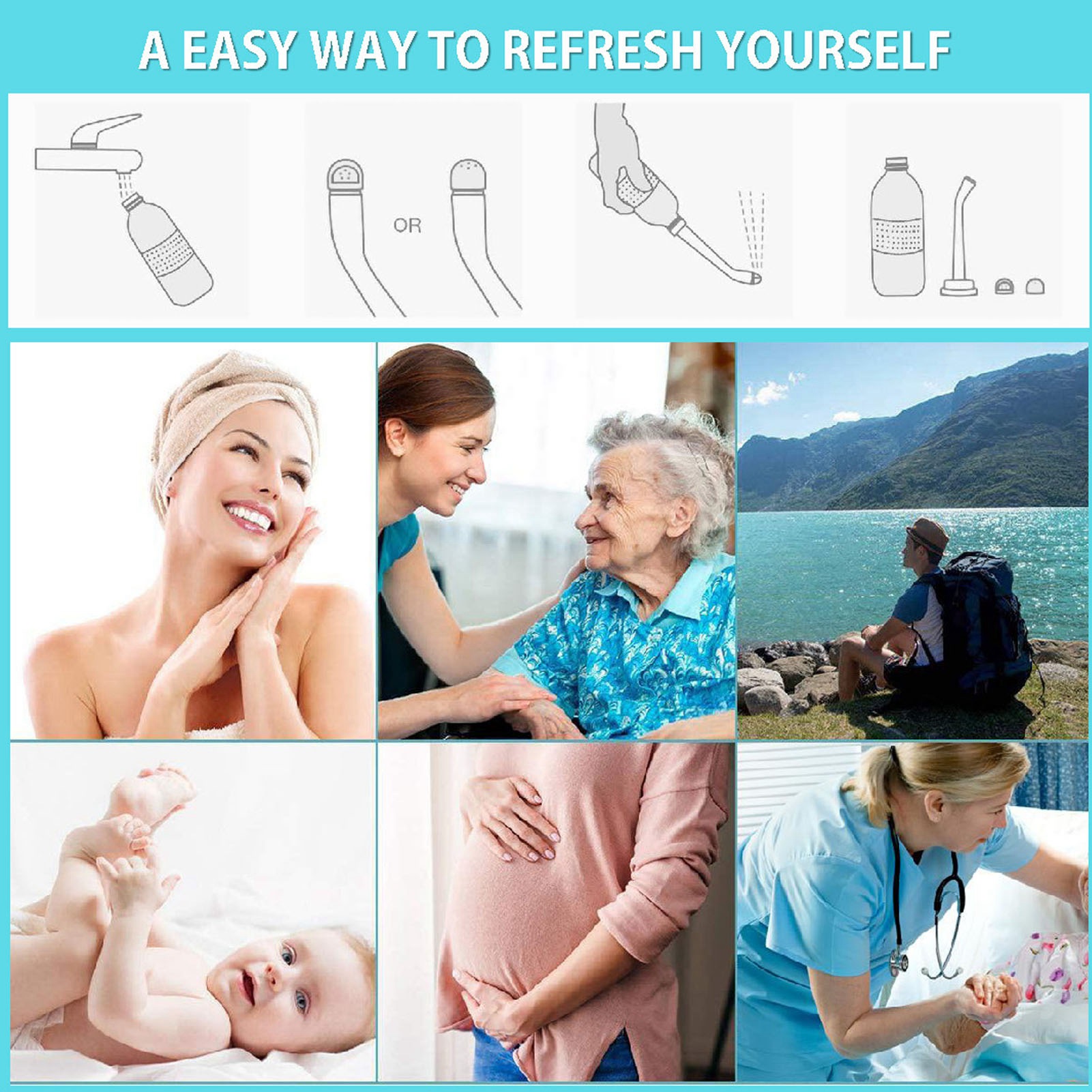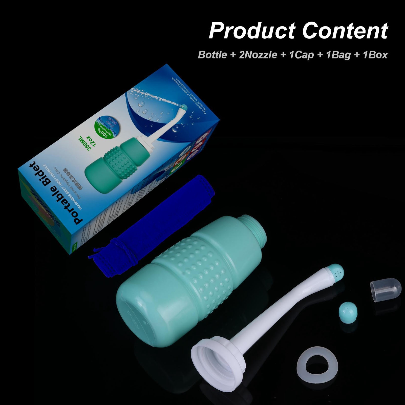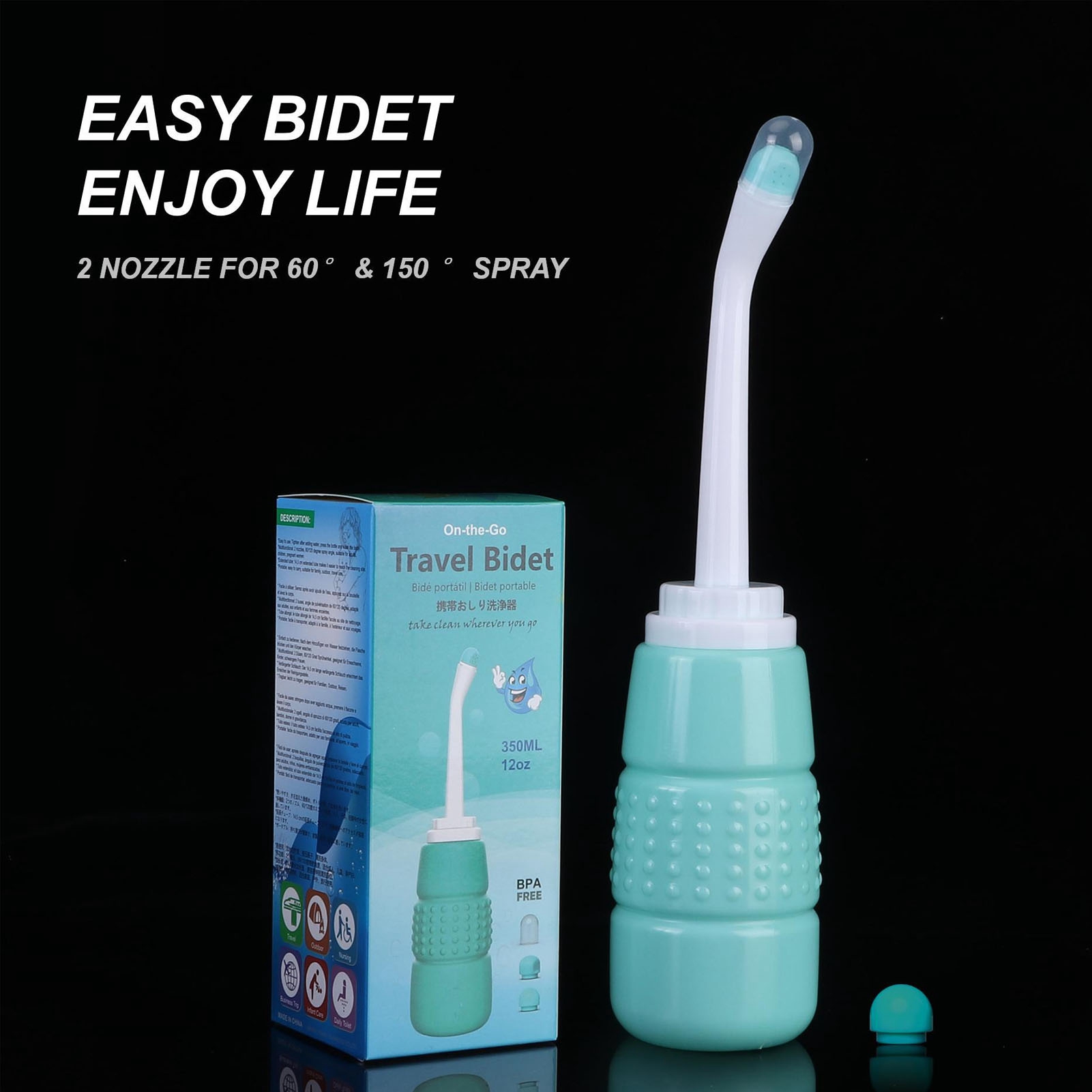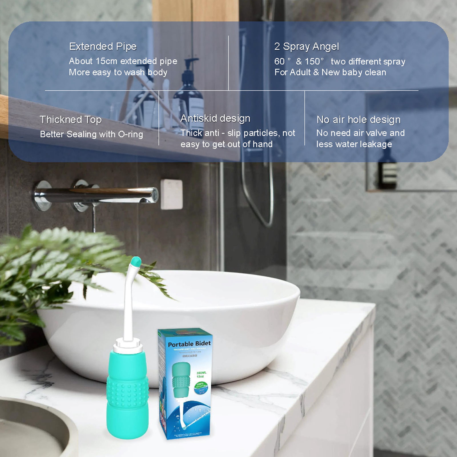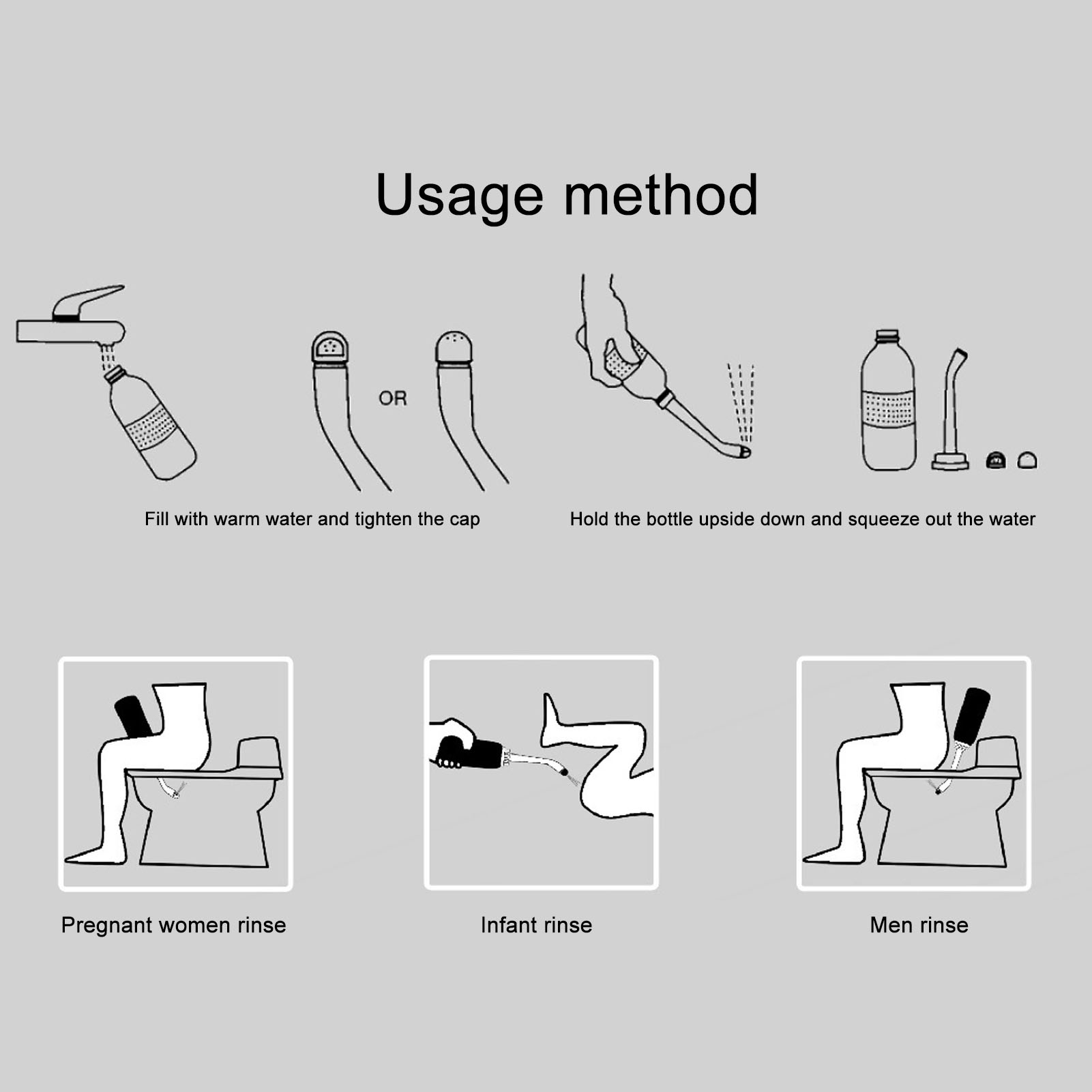 1、Easy To Use: Made of EVA and PP material, strong elasticity, fast rebound, good feel, simply fill with cool or warm water, screw on the cap, just a squeeze can do the job right, then you will get a refreshing experience. 2、Practical: Replace paper towels, thoroughly clean, do not damage the skin, effectively prevent diseases and infections of private parts, save toilet paper, environmentally friendly, economical, comfortable and clean. 3、Ergonomic Design: Specially designed to be held upside down, includes both an angled nozzle and a straight nozzle to meet different situations. Equipped with a dust cover, tightly covered after use, protects personal hygiene. 4、Application: Suitable for post defecation, urinal cleaning, baby cleaning, shampooing, postpartum wound cleaning, menstrual care, for patients with hemorrhoids, people with physical disabilities. 5、Portable: 350ml portable bidet with compact handheld size, can easily fit into backpacks and suitcases, flexible for outdoor use, perfect for personal care hygiene sprayer at home, office, on vacation, travel, public toilet.
