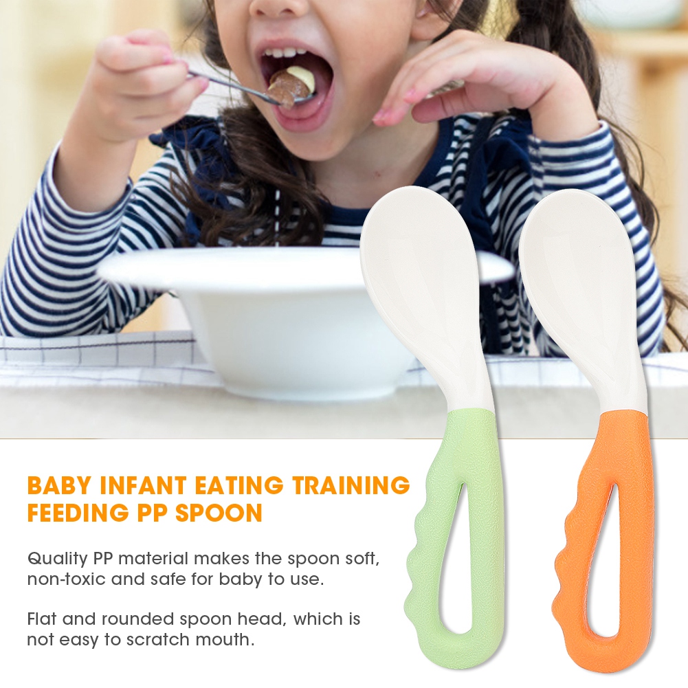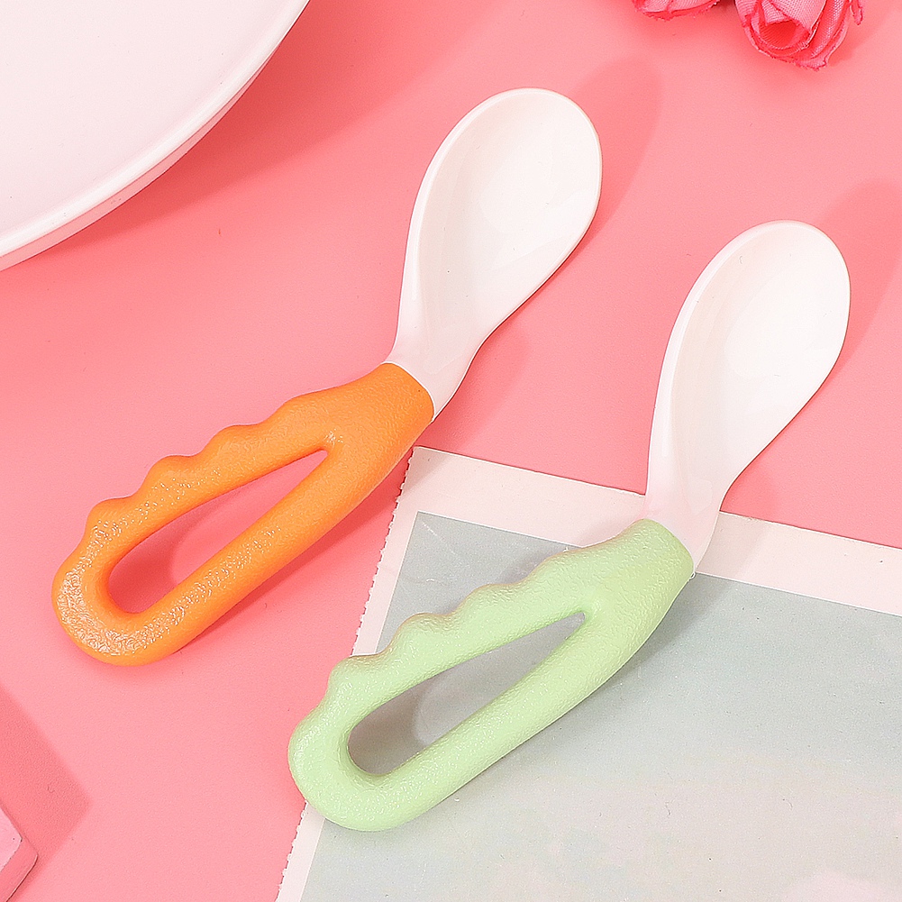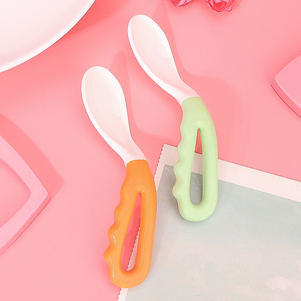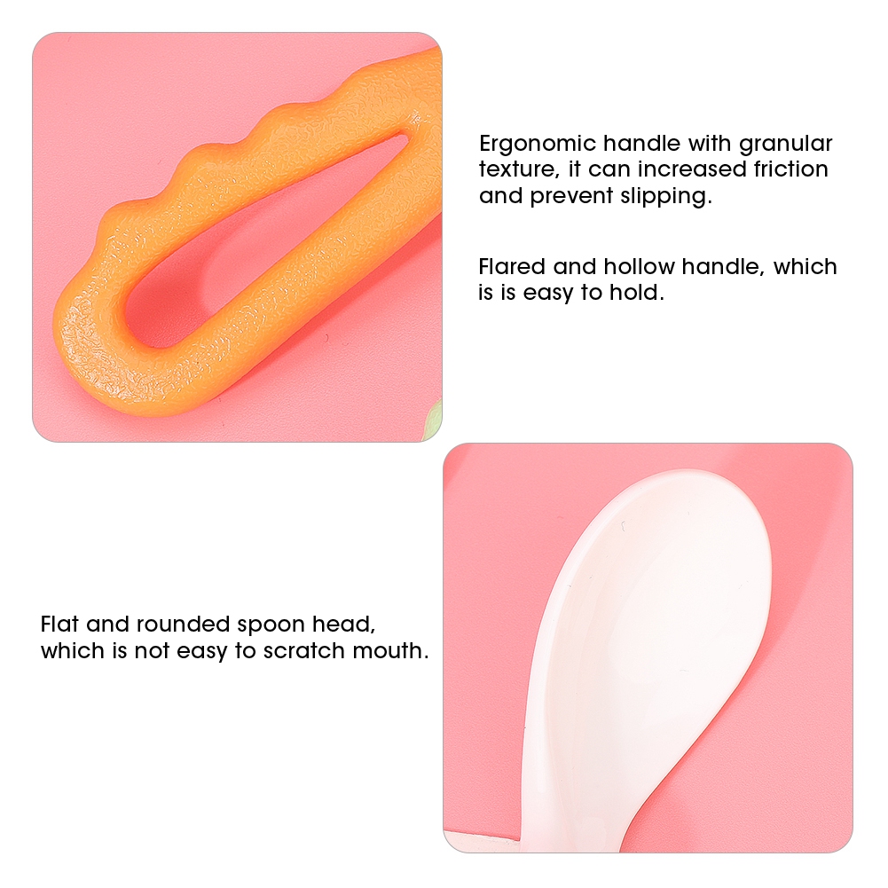 1、Quality PP material makes the spoon soft, non-toxic and safe for baby to use 2、Ergonomic handle with granular texture, it can increased friction and prevent slipping 3、Flared and hollow handle, which is is easy to hold. 4、Flat and rounded spoon head, which is not easy to scratch mouth. 5、Exquisite workmanship makes it smooth without burrs, which won't hurt baby's hands, and it is also easy to clean.