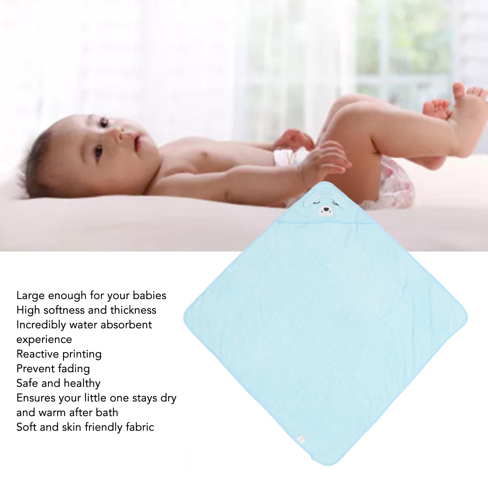 1、Animal Shaped: Baby bath towel adopted cartoon animal shaped hooded, adds a touch of cuteness to bath time for an enjoyable experience. 2、Perfect Size: Baby bath towel adopted 80 x 80cm in size, large enough for your babies, ensures your little one stays dry and warm after every bath. 3、Water Absorption: Baby hooded towel with high softness and thickness for an incredibly water absorbent experience, effectively drying baby. 4、Soft Fleece: Hooded bath towel made of coral fleece, soft and skin friendly, which can provide warmth and coziness for a comfortable bath time. 5、Safe to Use: Made from fleece fabric for skin friendly our hooded towel is a safe and healthy choice for your baby, will not scratching skin.