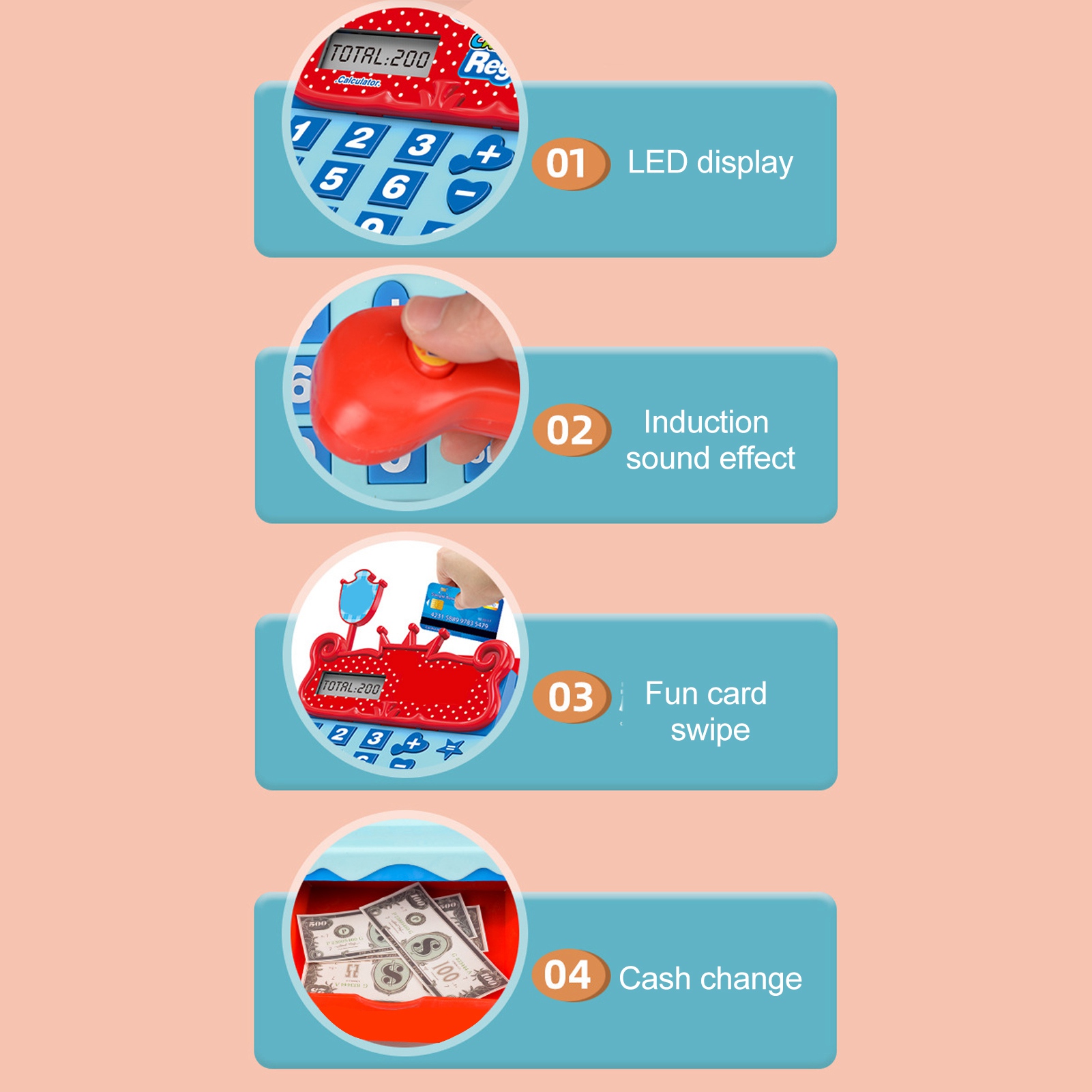1、Math Counting: Cash register playset helps improve the math skills of children by helping train addition, subtraction and multiplication skills by pressing number buttons. 2、Educational: Cash register toy teach your children about money, number crunching and credit cards while playing and having fun in their role playing world. 3、Role Play: Calculator cash register toy improve the social and teamwork skills of your child by fully engaging them in food, shopping role play games. 4、Wonderful Gift: Kids calculator cash register toy is an ideal gift for boys and girls on Halloween, Christmas, Birthday, Easter or even for home school. 5、Safe Material: Made of ultra durable material with soft edges and free from any harmful substances, suitable for children, boys and girls as a cash register gift.