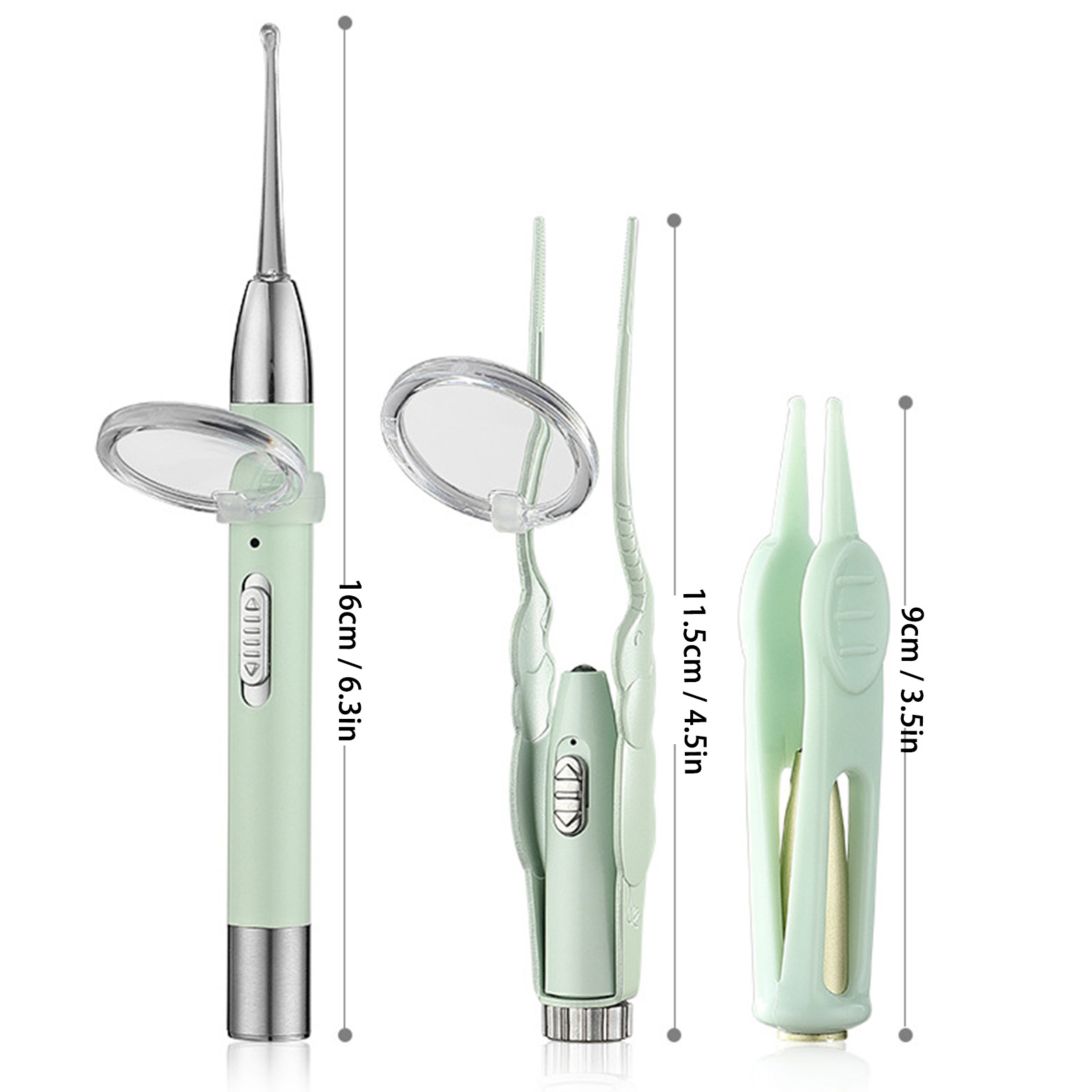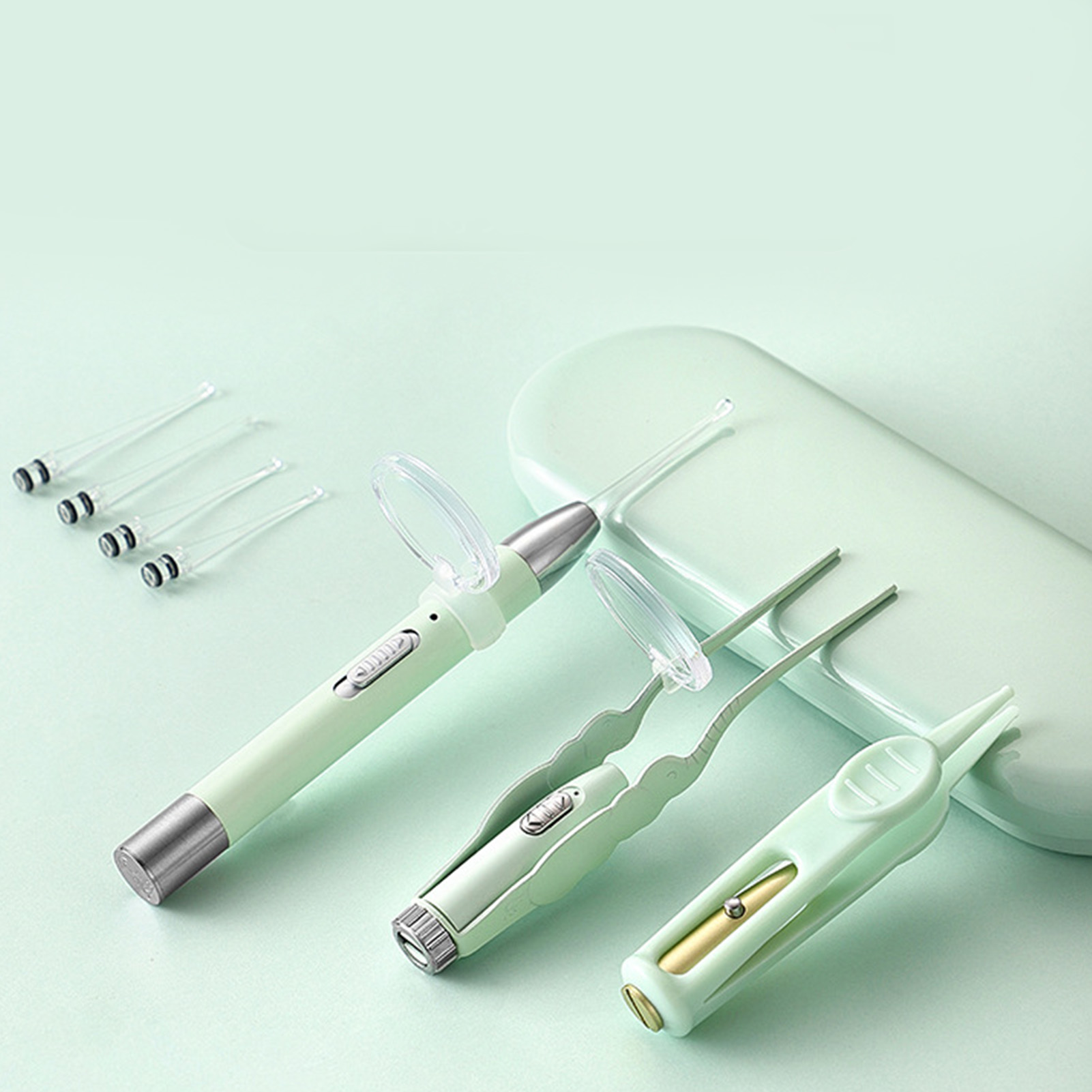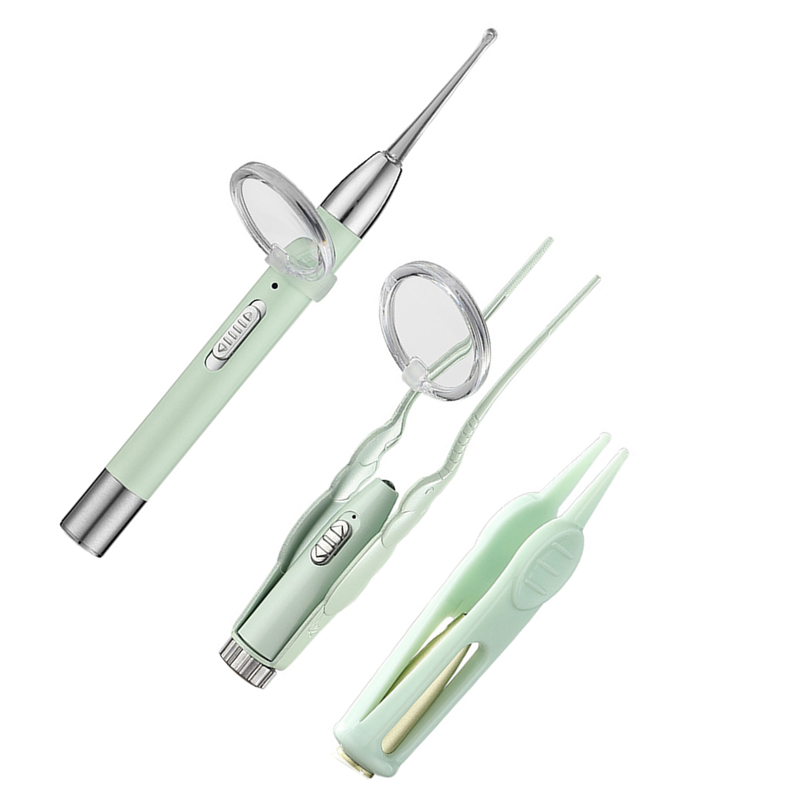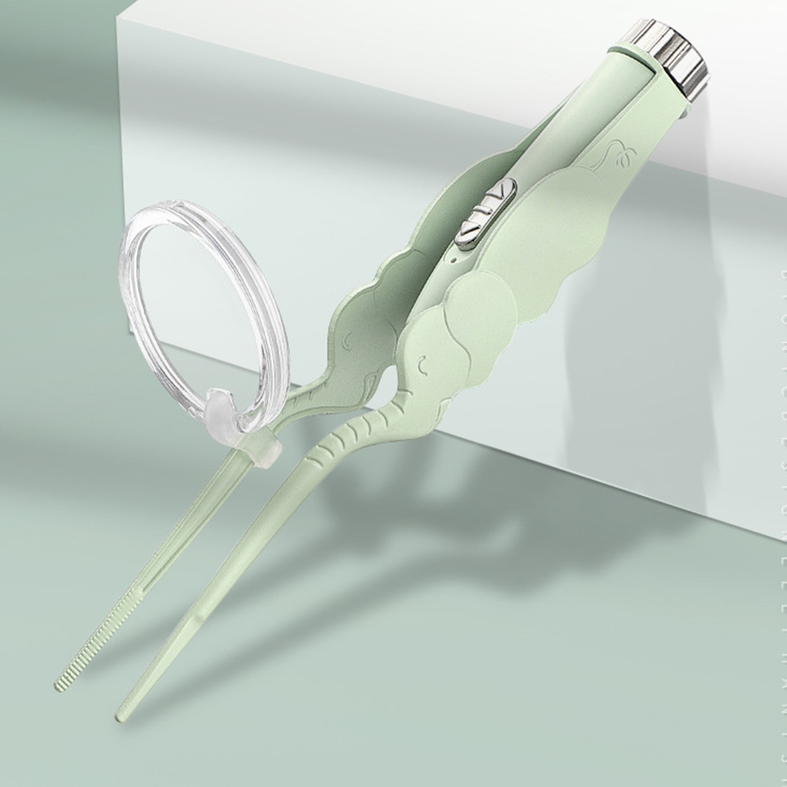 LED Lighted Earpick Set Ear Wax Removal Noseclip Forceps Bright Lighting Ear Care Kit for Children Light Green