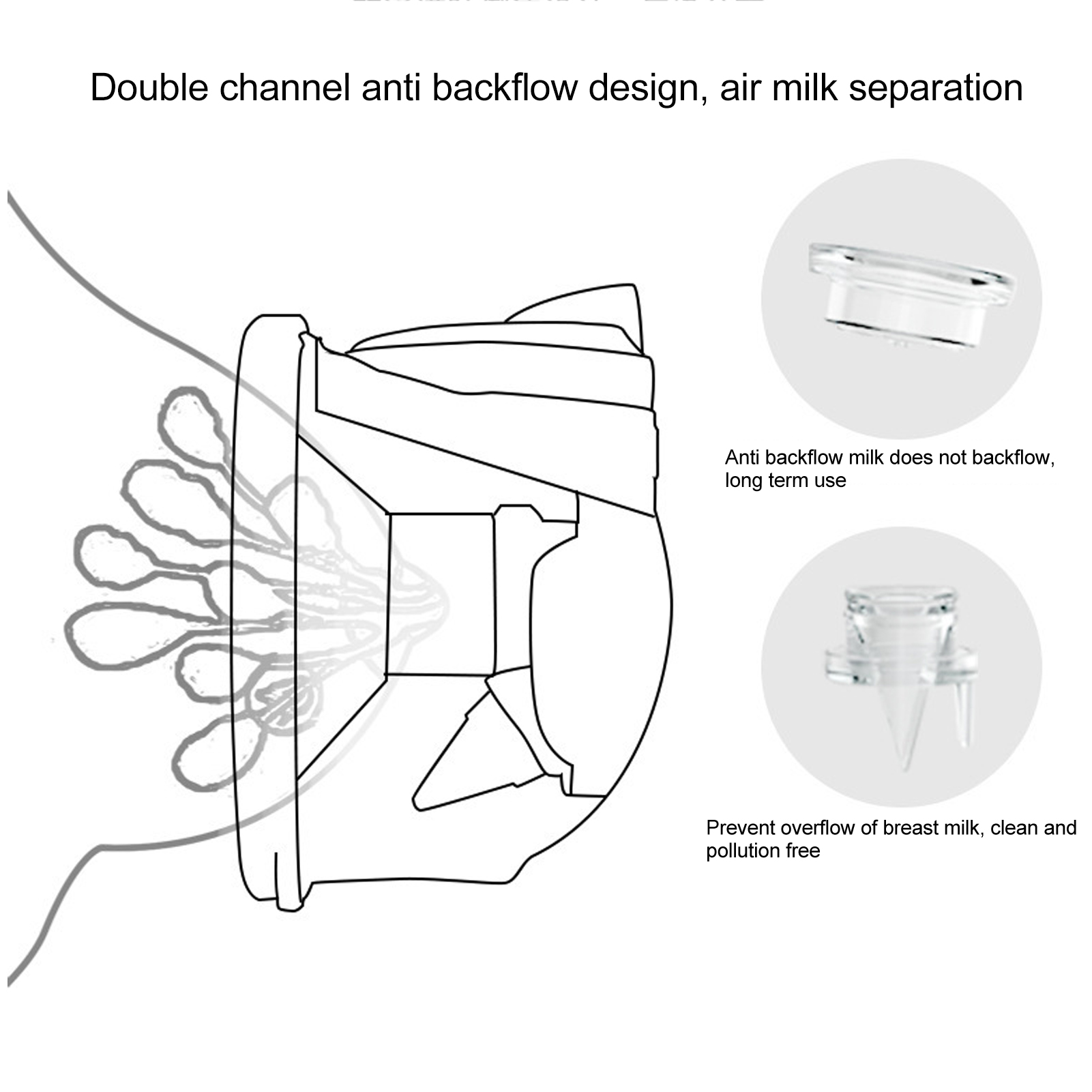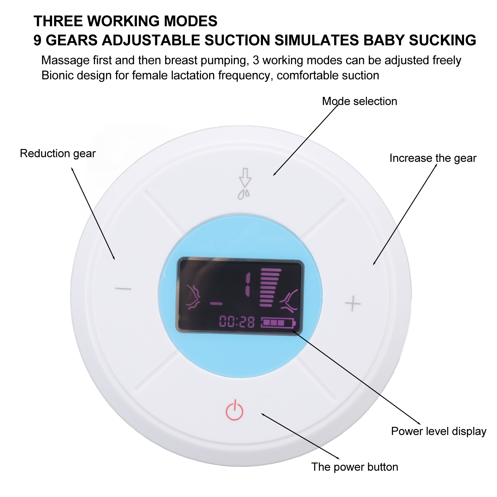 1、SUPERIOR PERFORMANCE: Wearable electric breast pump, efficient emptying, painless suckling, stable milk discharge. Double channel anti backflow design, air milk separation. 2、EASY TO ADJUST: Wearable breast pump with custom gear adjustment, adapt to different needs, lactation mode, massage mode, breast pumping mode switch with one button. 3、DIFFERENT PATTERNS: Intelligent wearable breast pump adopts 9 adjustable suction levels, simulating baby sucking, massage first and then breast sucking, 3 working modes can be adjusted freely. 4、BIONIC DESIGN: Hands free breast pump adopts bionic design, suitable for female lactation frequency and comfortable suction. More fresh milk for babies and more sleep for mothers. 5、MASSAGE FUNCTION: Intelligent wearable breast pump with pneumatic pulse pump, piston cycle movement, high frequency vibration per minute, double frequency conversion technology, massage dredge mammary gland. 6、LOW NOISE: Wearable breast pump with low decibel work, night suckling is not disturbing, low vibration low noise, do not disturb the baby's good sleep. Large capacity lithium battery, a variety of ways of power supply, a variety of gear selection.