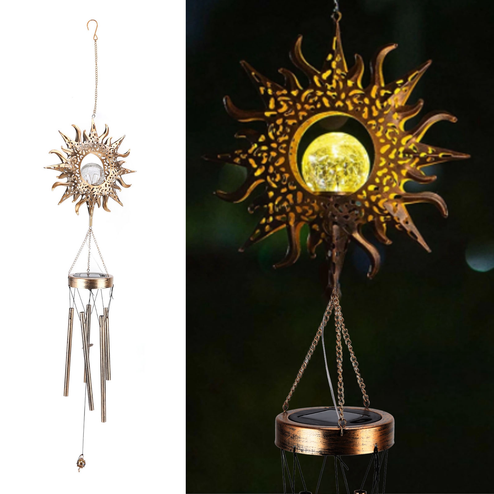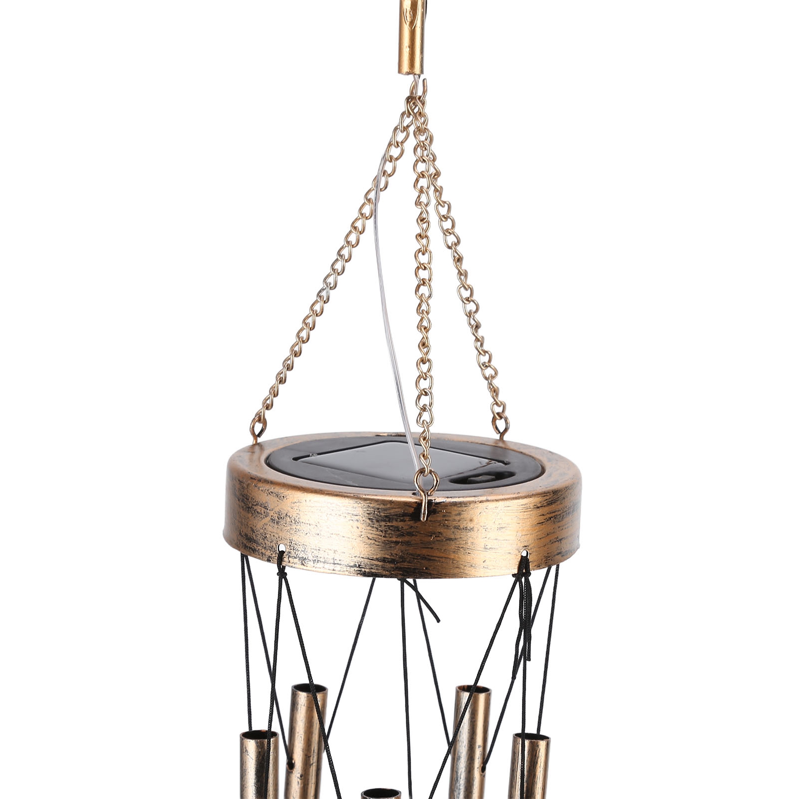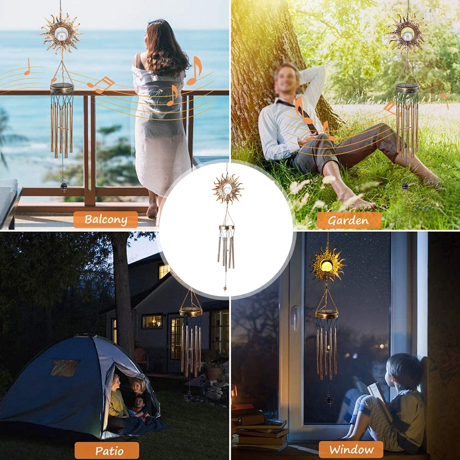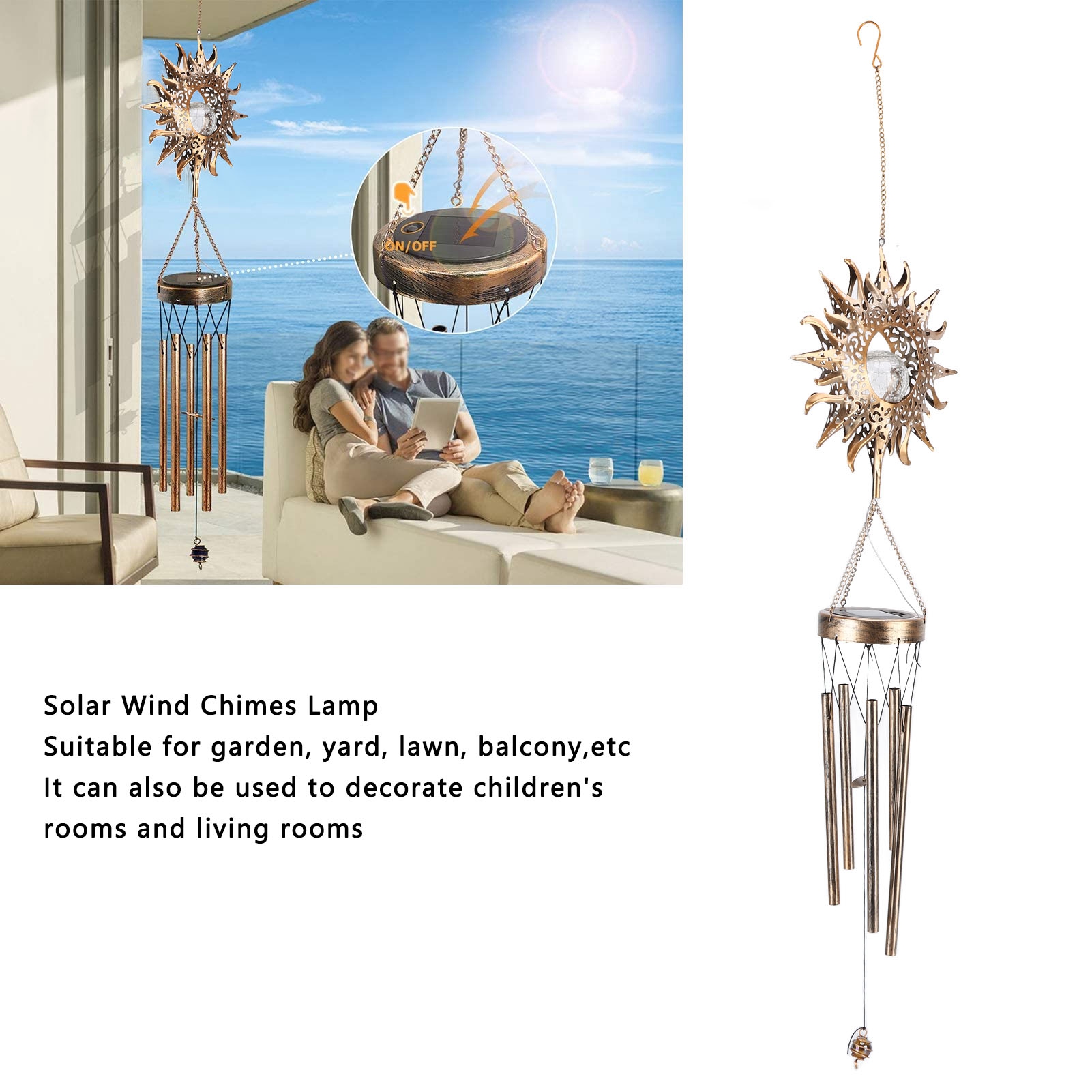 1、This retro solar wind chimes adopt beautiful hollow out design and are equipped with glass ball lamp, which can provide warm light and romantic atmospheres for your yard at night. These wind chimes are not only an outdoor wind chimes, but also a solar garden lamp. The pleasant wind chimes music is accompanied by warm lighting, which makes you feel more comfortable and relaxed. 2、This windbell is made of high quality infarctate aluminum and anti fading material, which makes its resonance time longer than other products and brings you lasting spiritual pleasure. The structure of wind chimes are strong and durable, which can resist most outdoor bad weather, and is not easy to rust and fade. The upper solar glass lamp has IP65 waterproof grade to ensure normal operation in rain and snow. 3、This product is powered by high efficiency solar panels. Turn the wind chimes switch to the ON key before making it work. The LED glass bulb lamp will automatically light up for about 8 hours at night after being fully charged for 8 hours in the daytime, which is both energy‑saving and environmental protection. Make sure that the wind chimes are hung in a sunny place without shading to get good sunlight. 4、These wind chimes are easy to be hanging outdoors or indoors as home decoration, without wiring or external power. These wind chimes are designed to add fashionable and warm atmospheres to your garden, yard, lawn, balcony, window, tree and front porch. It can also be used to decorate children's room and living room, adding beautiful melody to your family. 5、These wind chimes are a commemorative gift to express love, happiness, safety and best wishes. It's not only the best gift for mom, family, friends, girls, birthdays, mother's day, father's day, Thanksgiving, Valentine's day and Christmas, but also for anniversaries and housewarming.