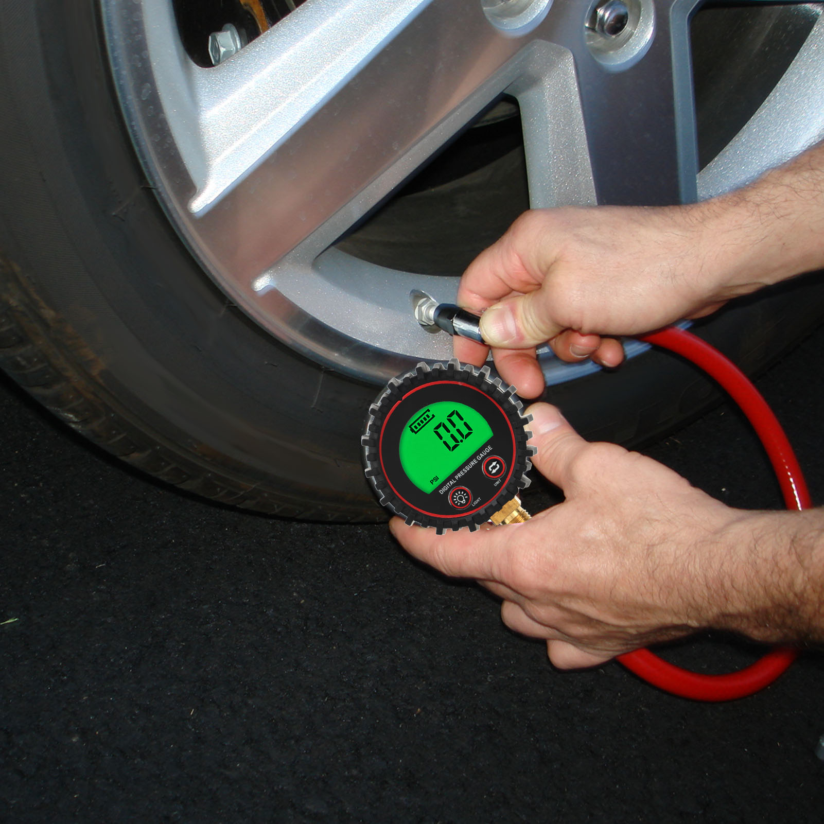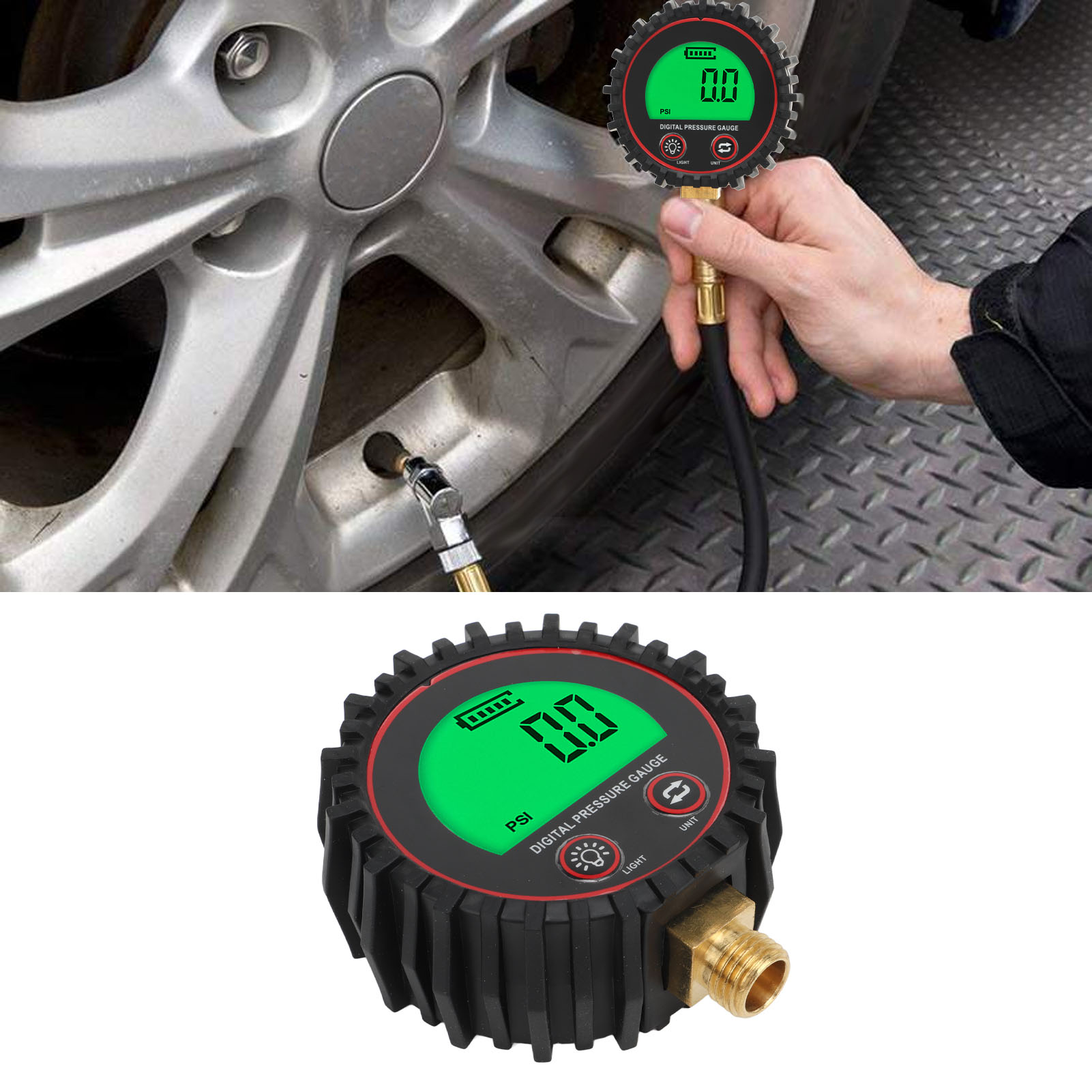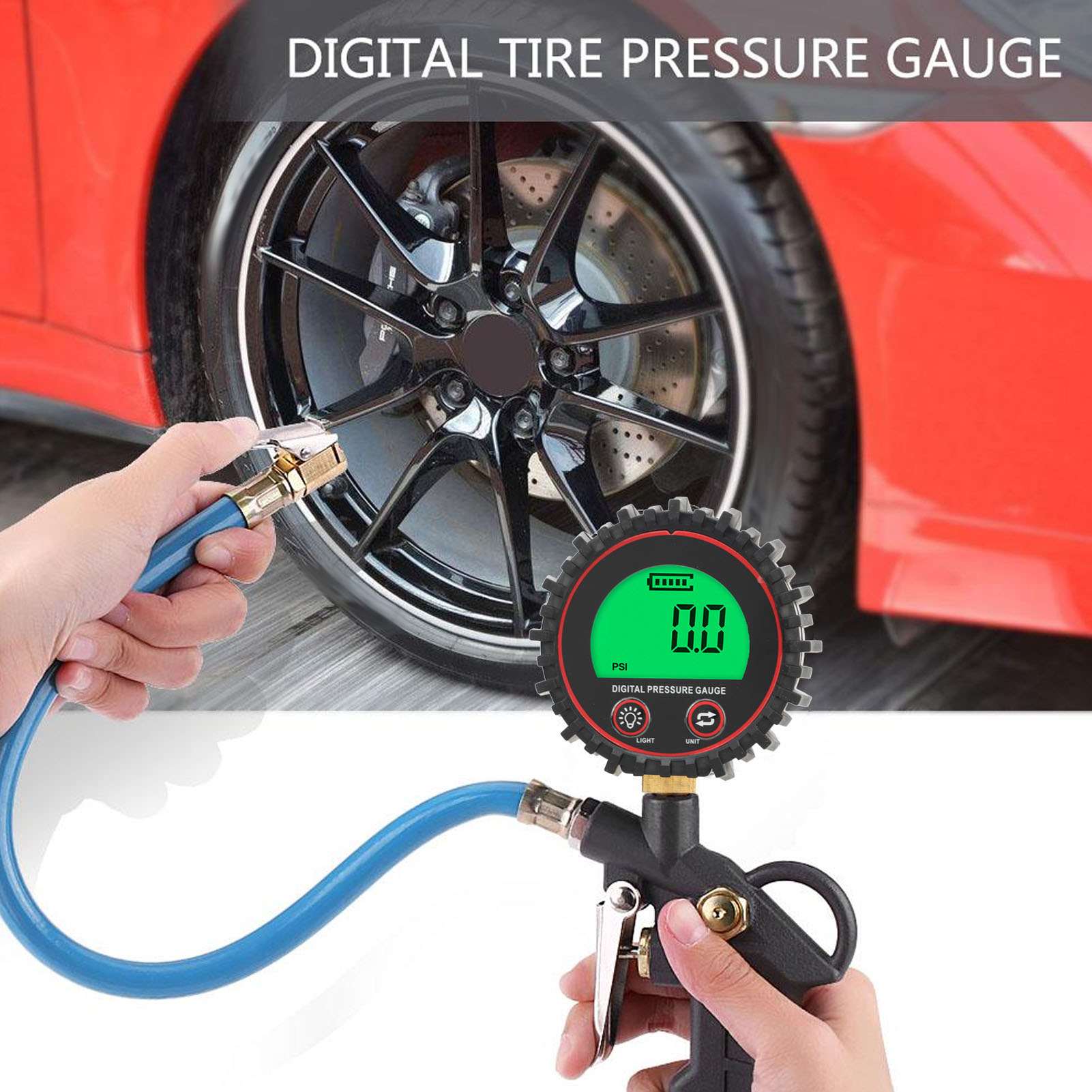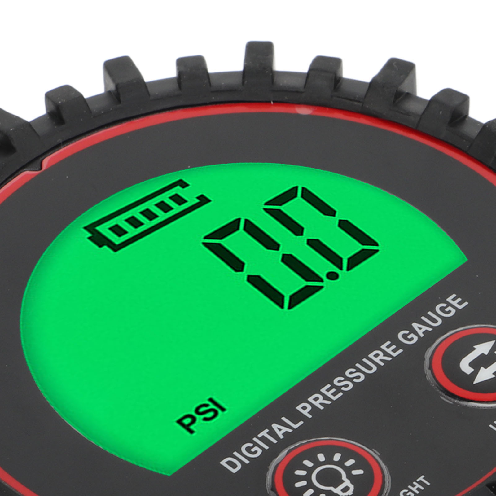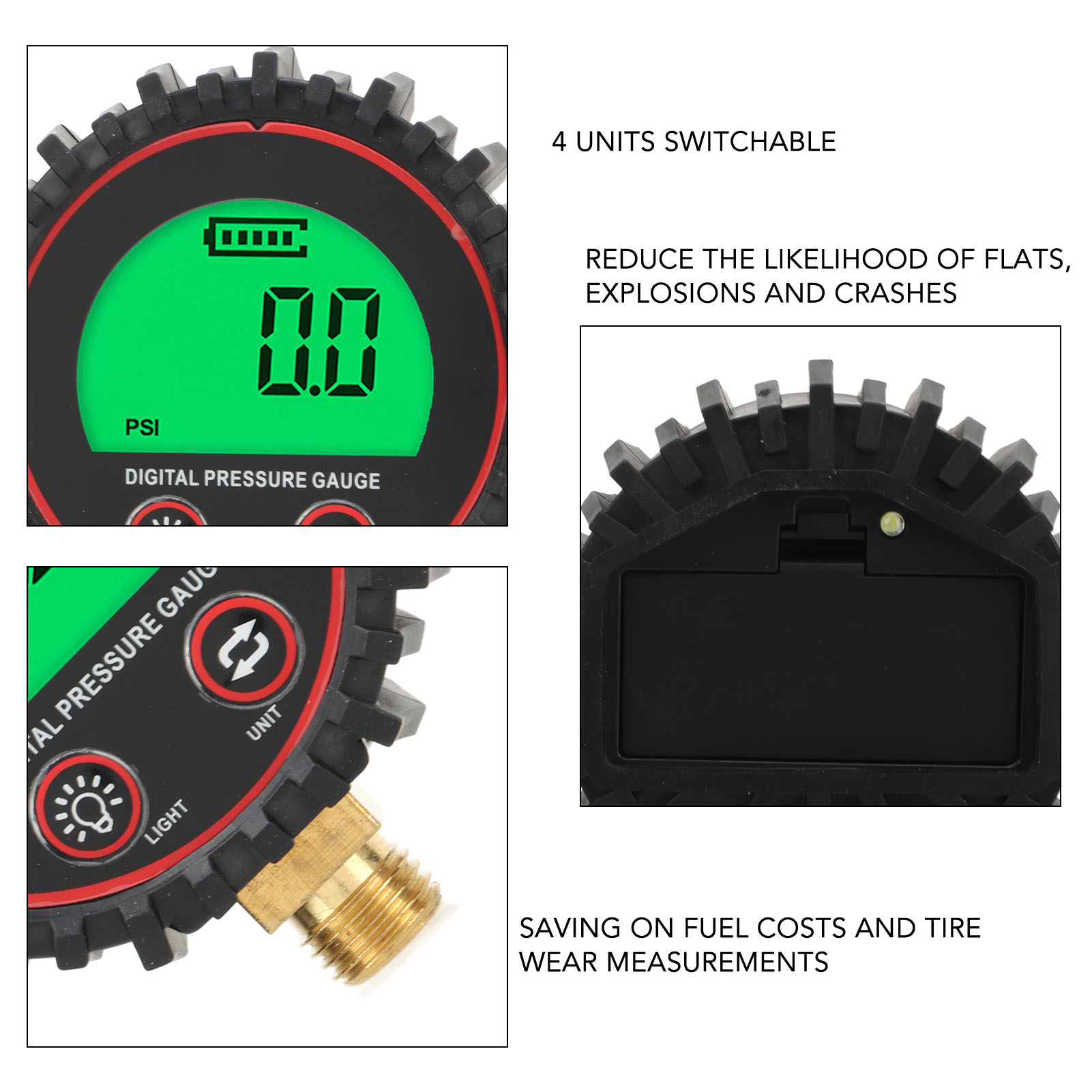 1、Advanced Accuracy: The digital tire pressure gauge always returns accurate readings within 1% of exact tire pressure for 0.1 display resolution, and the measuring range is 3 ‑255PSI. 2、Switchable Design: The tire inflator pressure gauge can switch between 4 units at will. Measured in PSI, KPA, Bar and Kg/cm^2. 3、Function: Digital pressure gauge can reduce the likelihood of flats, explosions and crashes, improve your MPG, saving on fuel costs and tire wear measurements. 4、High Visibility: Bright visibility is achieved with the LCD backlit display, even in low light conditions or at night. 5、Application: Widely used for cars, trucks, motorcycles, trails, SUVs, RVs, and provide excellent performance in all weather conditions.