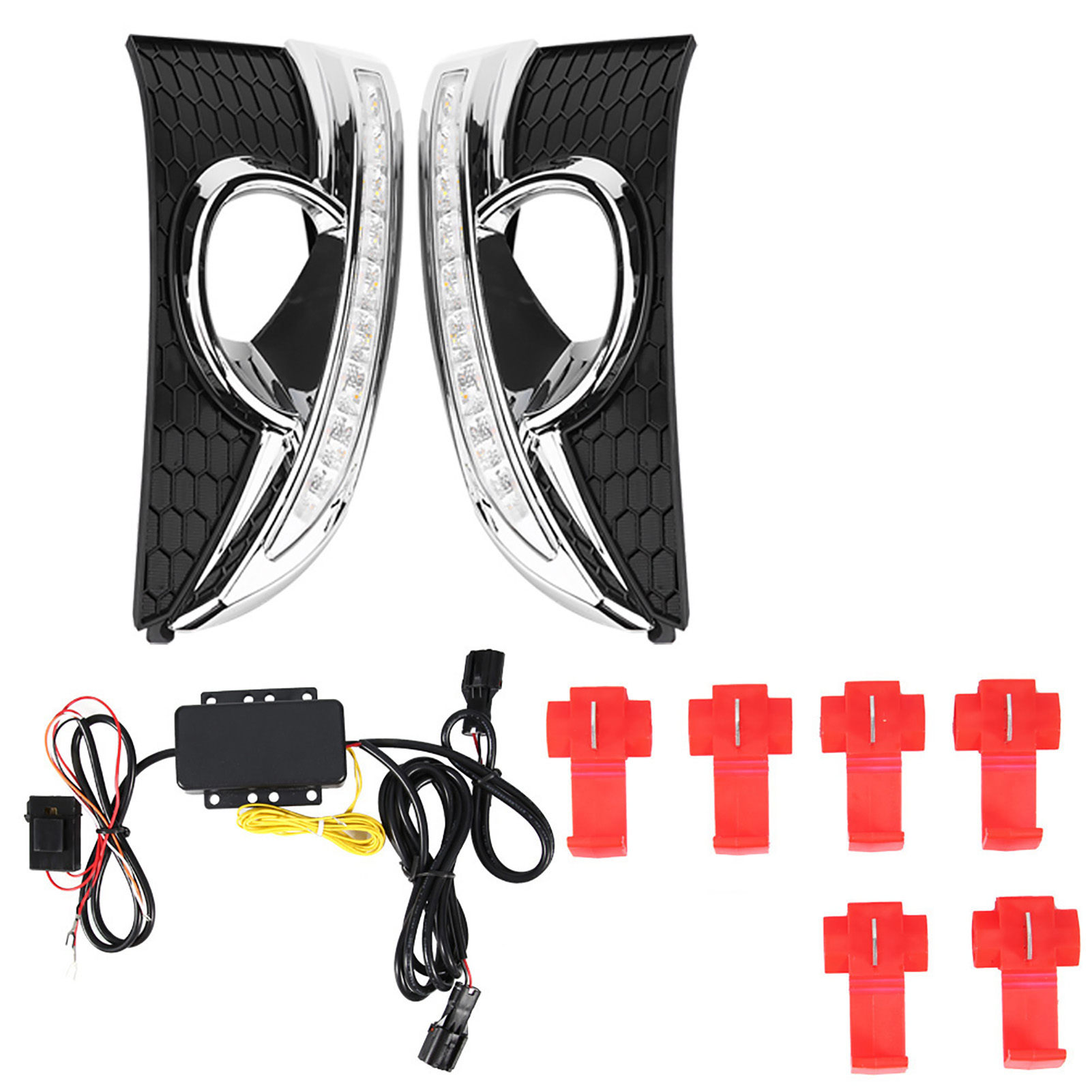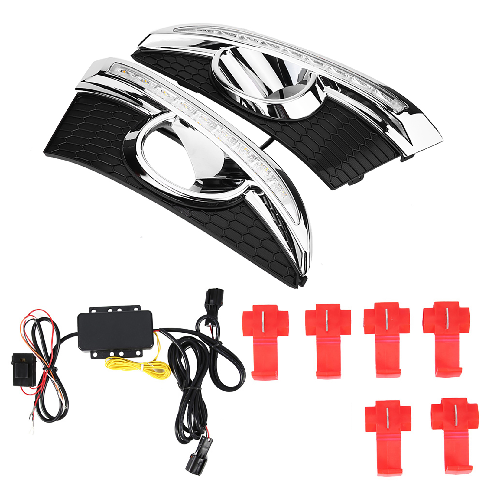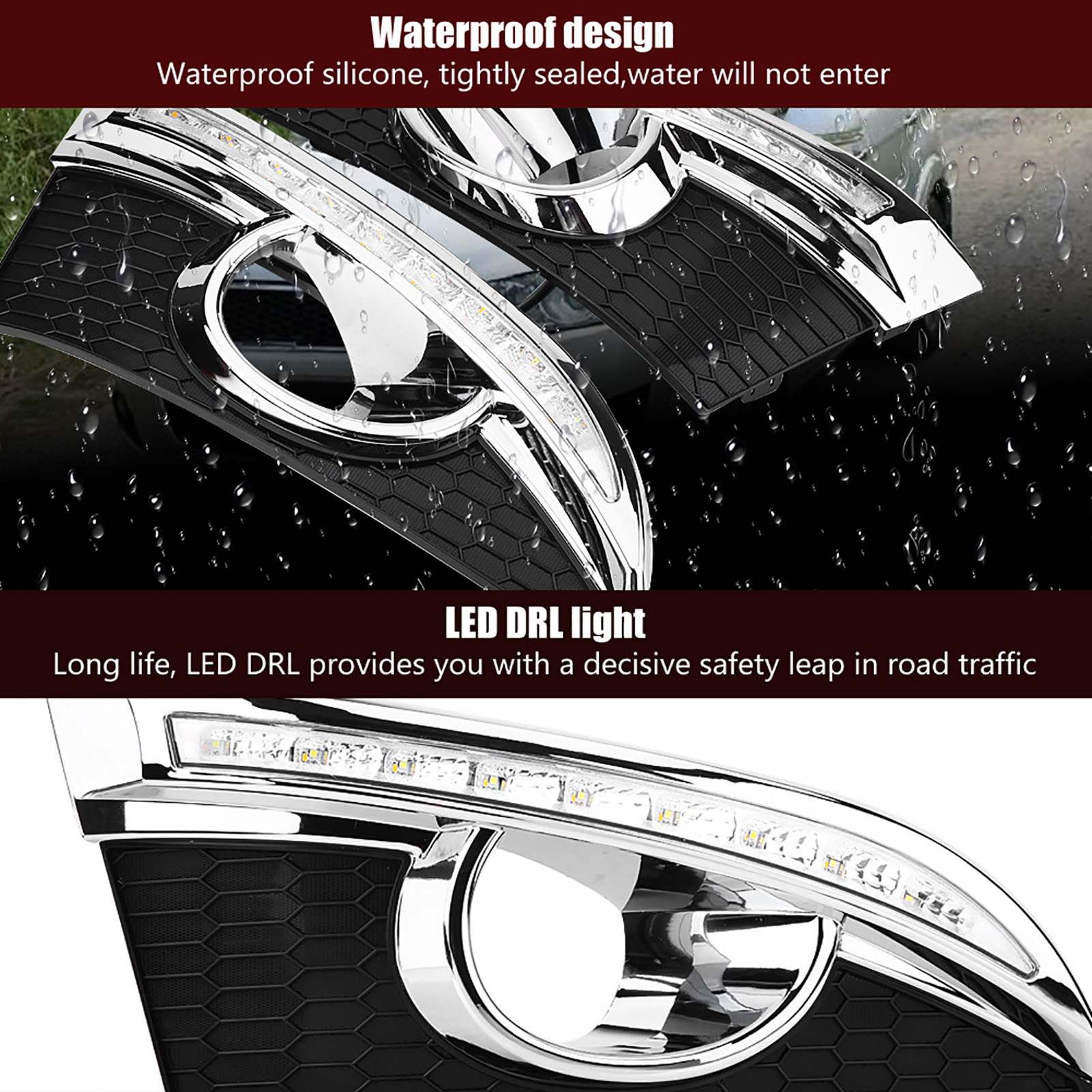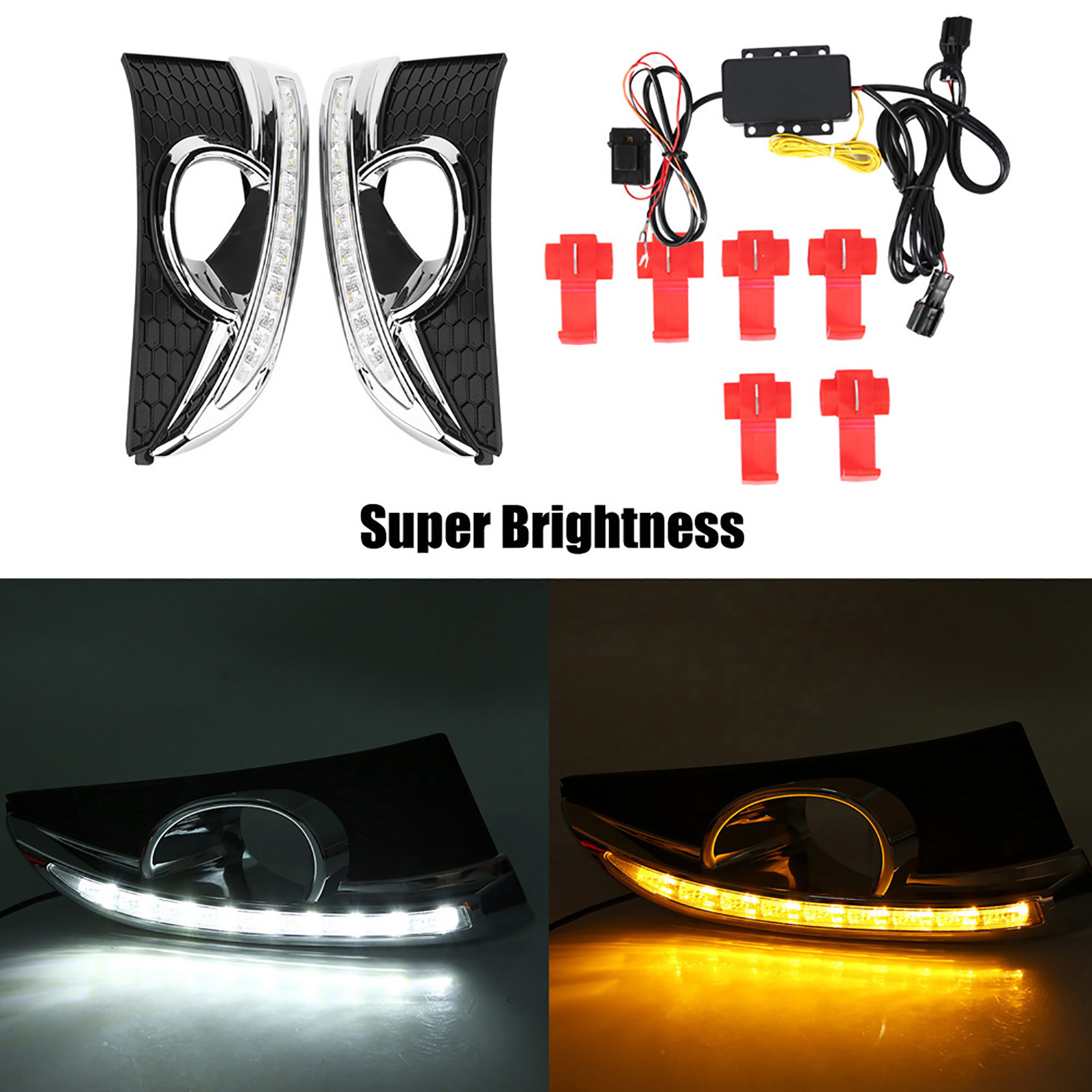1、LED DRL provides you with a decisive safety leap in road traffic and helps prevent 58% of accidents. 2、Advanced constant current technology, well‑distributed luminescence. 3、Comes with two color LED lights, white light work as daytime running light, yellow light work as turning signal. 4、Oxidation treatment on surface. Nice appearance with good shake‑proof, waterproof, and corrosion resistant. 5、High quality ABS plastic material, good dissipation function and durable.