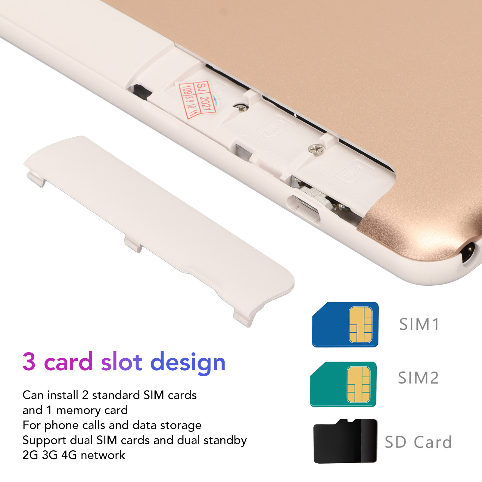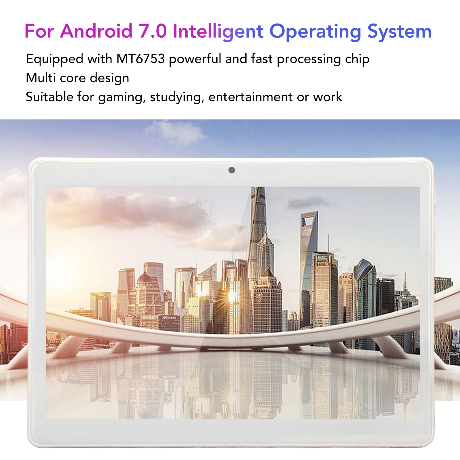 1、High Resolution: for android 7.0 tablet adopts 10.1 inch 1280x800 resolution full screen, full view brilliant HD, vivid and lifelike picture. 2、Powerful Chip: 10.1 inch tablet is equipped with MT6753 powerful and fast processing chip, with multi core design, super power saving, suitable for games, learning, entertainment or work. 3、Large Capacity Memory: 10.1 inch tablet is equipped with 2GB large capacity memory, game running, movie brushing drama without pressure, built in 32GB storage space, while supporting memory card expandable storage, games, music, movies, photos, etc. 4、3 Card Slot Design: 10.1 inch tablet with 3 card slot design, can install 2 standard SIM cards and 1 memory card for phone calls and data storage, support dual SIM dual standby 2G 3G 4G network. 5、For Android 7.0 Intelligent Operating System: Dual sim dual standby tablet adopts for Android 7.0 intelligent operating system to improve the speed of application launching and switching. 6、HD Pixel: 10.1 inch tablet adopts 5 megapixel rear camera and 2 megapixel front camera with flash, so it is easier to take photos and record daily life.
