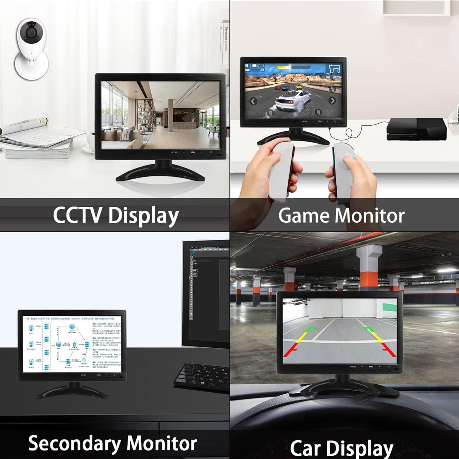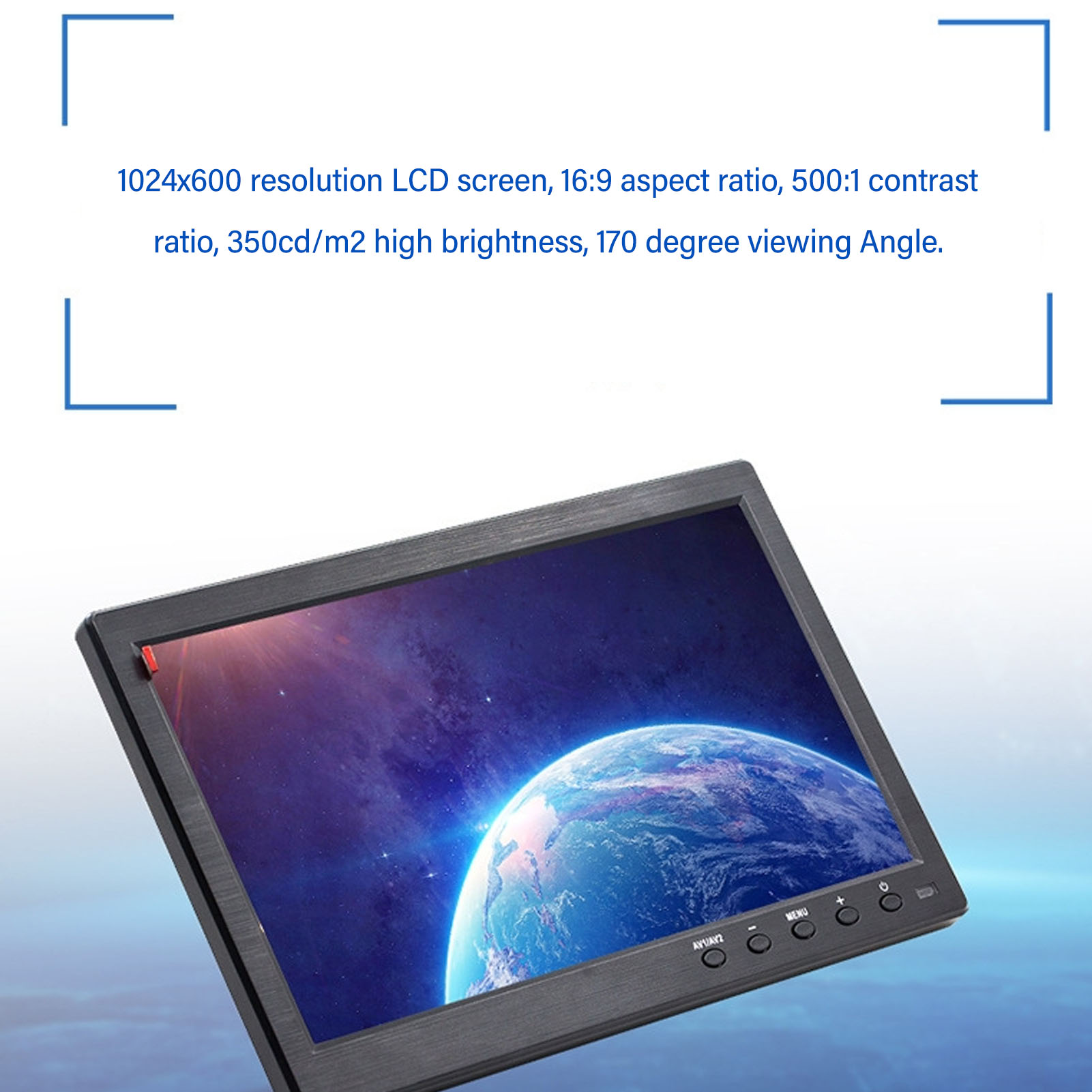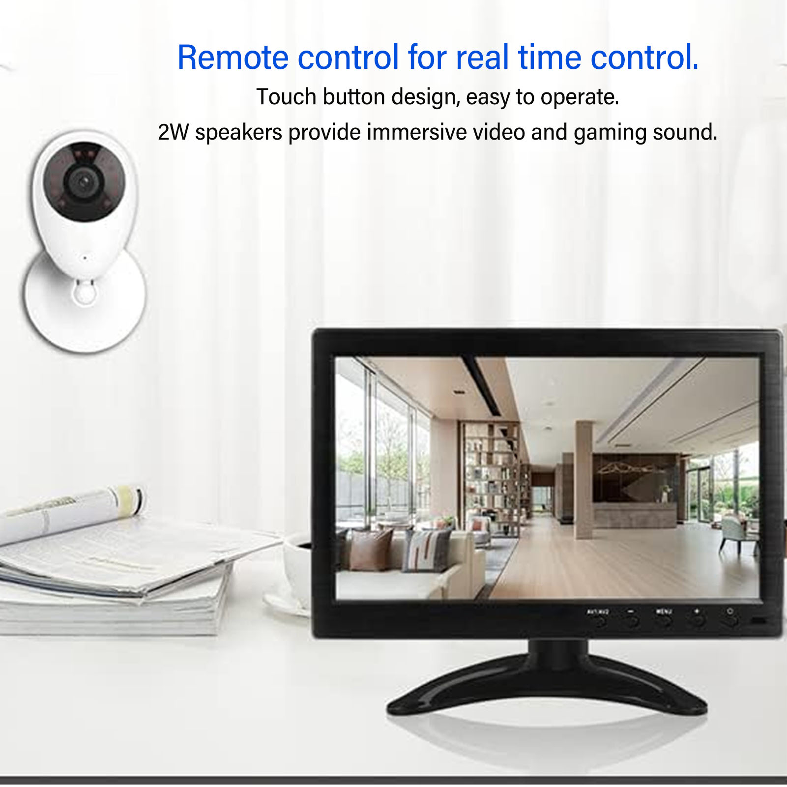 1、10.1 Inch LCD Screen: The portable monitor features a 10.1 inch LCD screen with a resolution of 1024x600. It has a widescreen aspect ratio of 16:9, a contrast ratio of 500:1, a high brightness of 350cd/m2, and a wide viewing angle of 170 degrees. 2、Multiple Input Ports: The monitor includes various input ports such as HD Multimedia Interface, VGA, AV, BNC, and USB video input. The versatility allows it to be compatible with industrial automation, PCs, analog CCTV systems, POS systems, retail self service terminals, DVD players, laptops, and more. 3、Image Mirror Flip: The monitor has a unique image mirror flip function, supporting vertical and horizontal image mirroring, ideal for use as a teleprompter monitor, printer monitor, car monitor, or home automation system. 4、Remote Control and Speaker: The monitor comes with a remote control for real time control, featuring a touch sensitive button design for easy operation. It also has built in 2W speakers that provide immersive video and gaming sound effects. 5、Easy Installation: The portable monitor is designed for easy installation with a stand and wall mount holes. It also comes with an adjustable angle feature, allowing you to adjust the viewing angle as per your convenience.