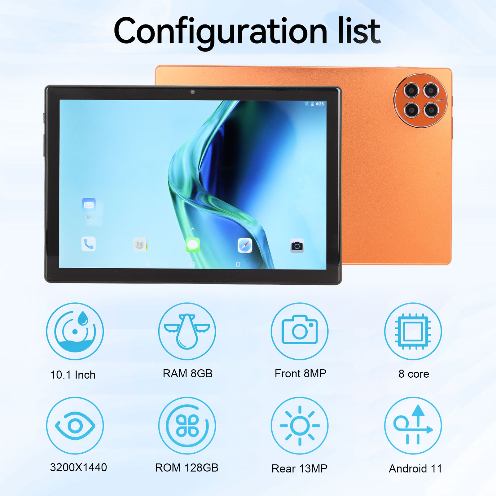 1、[High Definition Screen]: The high performance tablet has 10.1 inch HD+ screen, with 3200X1440 resolution, bringing you clearly and wonderful visual experience. 2、[Dual SIM Dual Standby]: The 10.1 inch tablet support dual SIM dual standby, can simultaneous install 2 Sim Cards or a Sim Card and a Memory Card, more flexible and convenient choice. 3、[Large Memory Storage]: The octa core tablet has 8GB RAM and 128GB ROM, can meet the multi task operation, storing more photos, videos, sound, games, etc. 4、[High Speed Network]: The smart tablet has 5G WiFi dual band and dual 4G LTE cellular data, bringing you more smoothly and pleasant Internet experience. 5、[Large Capacity Battery]: The high performance tablet has large capacity battery, built in 8800mAh lithium battery, with strong battery life on a single charge, durable daily use.