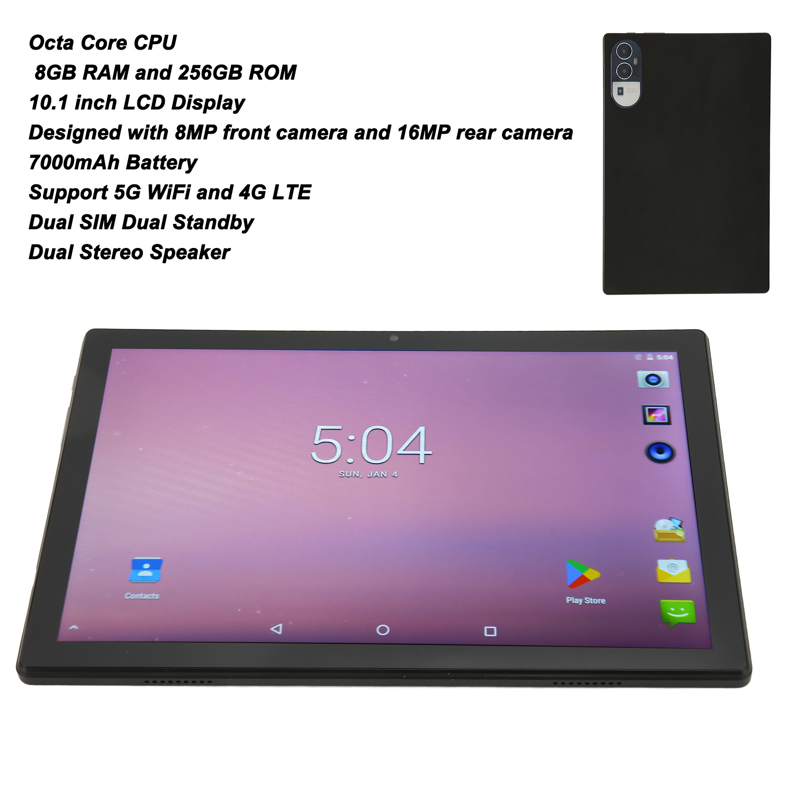 1、10.1 Inch Screen: This HD tablet adopts 10.1 inch LCD screen with dual speakers, watch your favorite movies and shows on display for a stunningly mobile cinematic experience. 2、Octa Core CPU: This 10.1 Inch tablet introduces Octa Core CPU, and it adopts for Android 13 operating system, which offers a user friendly interface and access to a wide range of apps. 3、8GB RAM 256GB ROM: This tablet PC provides 8GB RAM and 256GB ROM, which ensures smoothing multitasking and efficient performance. 256GB storage for storing your apps, files, and media, 128GB memory card expandable. 4、Dual Camera: This business tablet is designed with 8MP front camera and 16MP rear camera, help you catch all the beautiful moments of life, support clear video calls and online learning. 5、4G LTE and 5G WiFi: This gaming tablet with 2 card slots supports 4G LTE and 5G WiFi. It makes it easy to stay connected, providing convenient experience for entertainment, browsing, gaming and shopping.