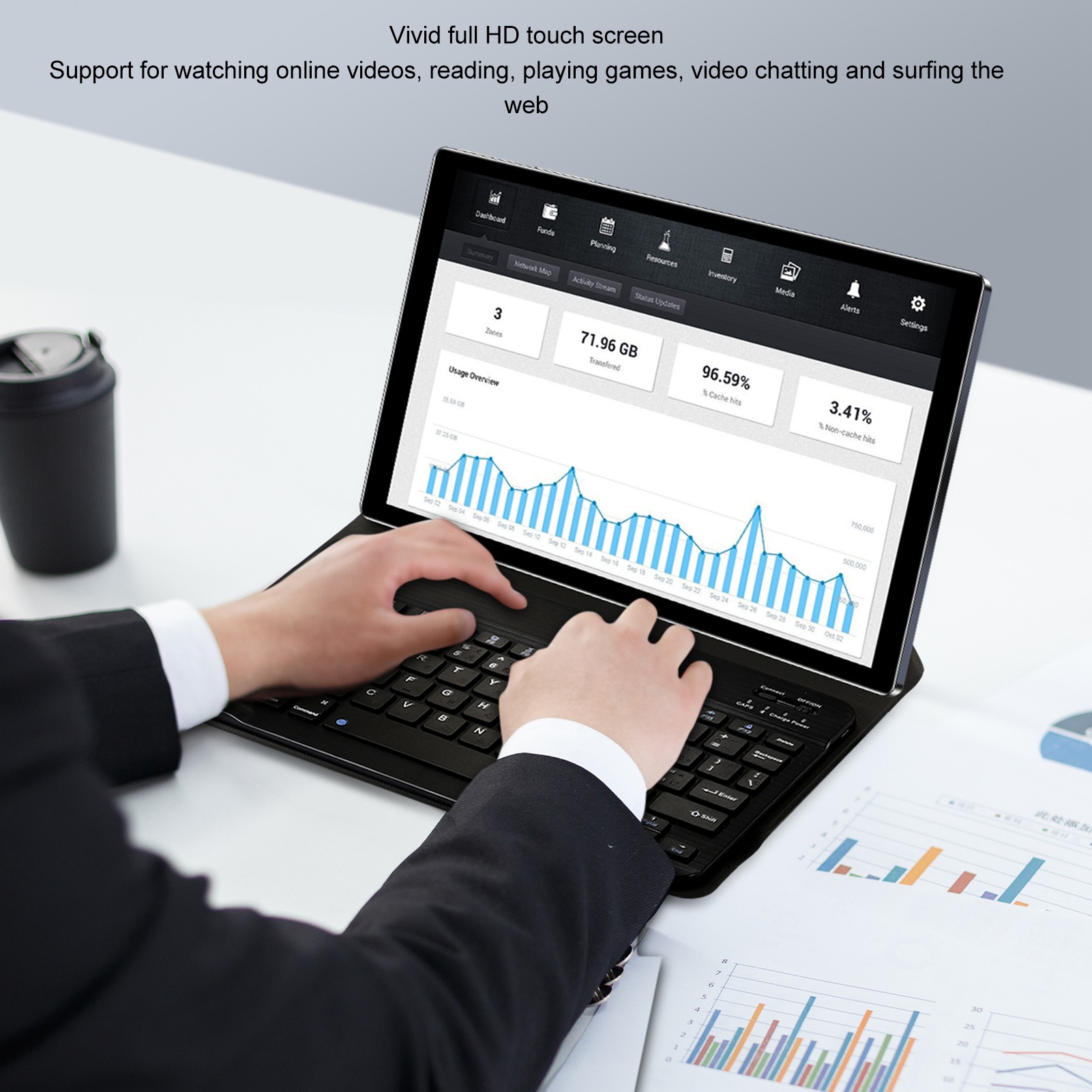1、Operational Performance: Tablet with keyboard is equipped with a high performance 10 core CPU, and features for Android 12 with artificial intelligence, easy for you to operate faster. 2、High Resolution: Tablet with vivid full HD 1920x1200 touch screen for watching online videos, reading, playing games, video chatting and surfing the web. 3、Advanced Design: The 10.1inch tablet with Bluetooth keyboard attached can be turned into a portable 2 in 1 laptop. Advanced look and exquisite touch is perfect for your office and entertainment. 4、Multifunctional and Practical: Built in Bluetooth, GPS, FM, gravity sensor and more. Dual cabinet speakers bring you rich instrumental harmonies, clear vocals and finely balanced sound. 5、Storage Space: The 12GB RAM + 256GB ROM makes operations such as multitasking, swapping and switching between apps faster, and provides ample storage for valuable multimedia files.