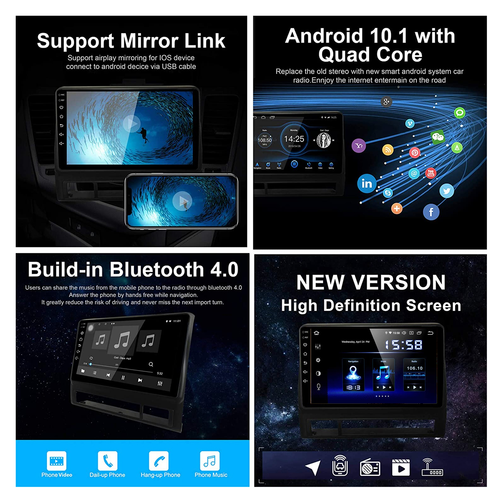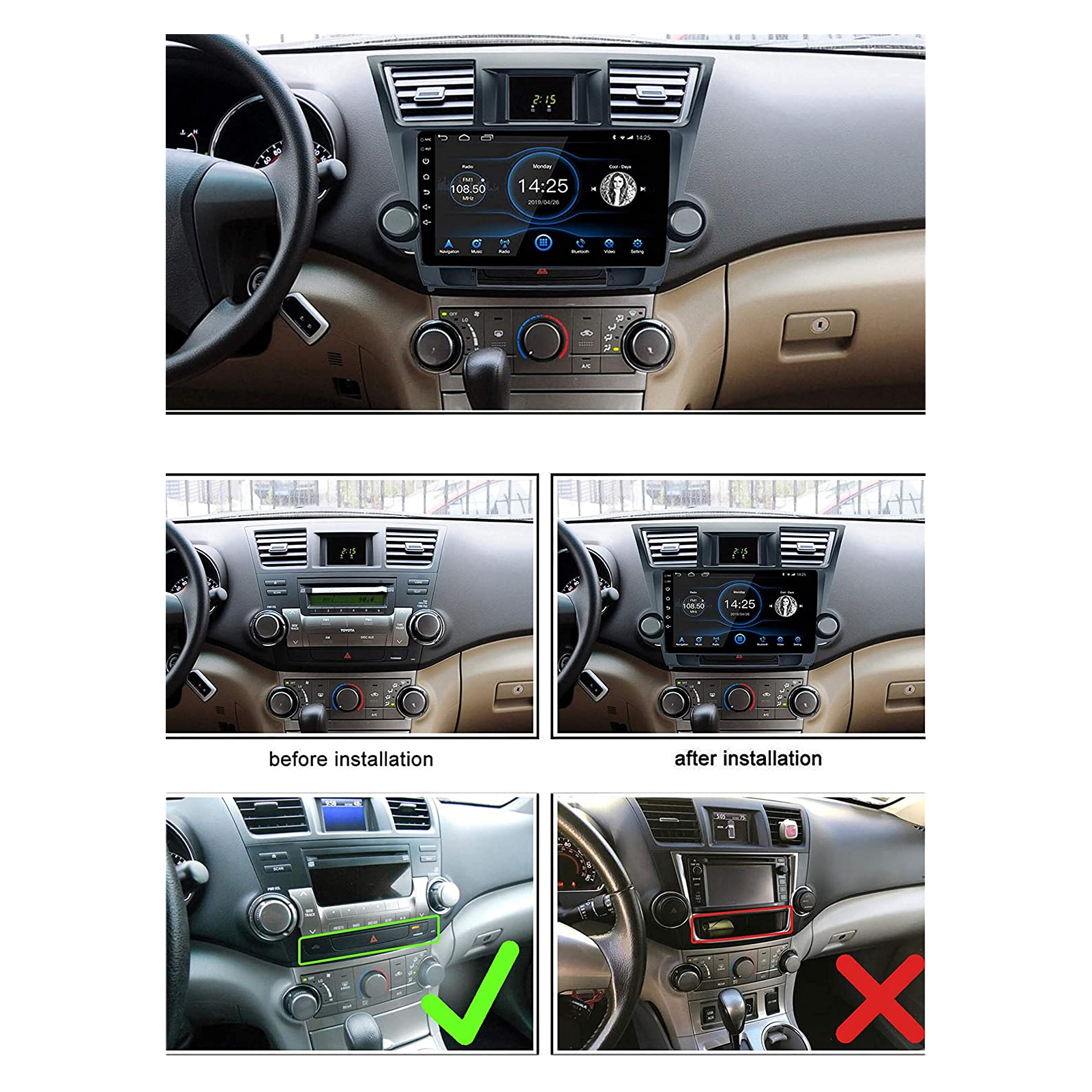 1、For Android 10.0 operating system, you can connect to WIFI to install the applications, for Skype, for Facebook, for YouTube, for Twitter and so on. 2、The large 10.1‑inch HD full touch screen with a resolution of 1024 x 600 can meet the needs of audio and video, you can control as you like. 3、Come with built‑in bluetooth 4.0, support phone book and original car steering wheel buttons, to get hands‑free and safe driving. 4、According to the original factory specifications, the car multimedia player can perfectly fit for highlander 2015‑2019. 5、Support JPEG, GIF, PNG, BMP picture formats, MP3, WMA and other audio formats, and AVI, MP4 and other video formats.