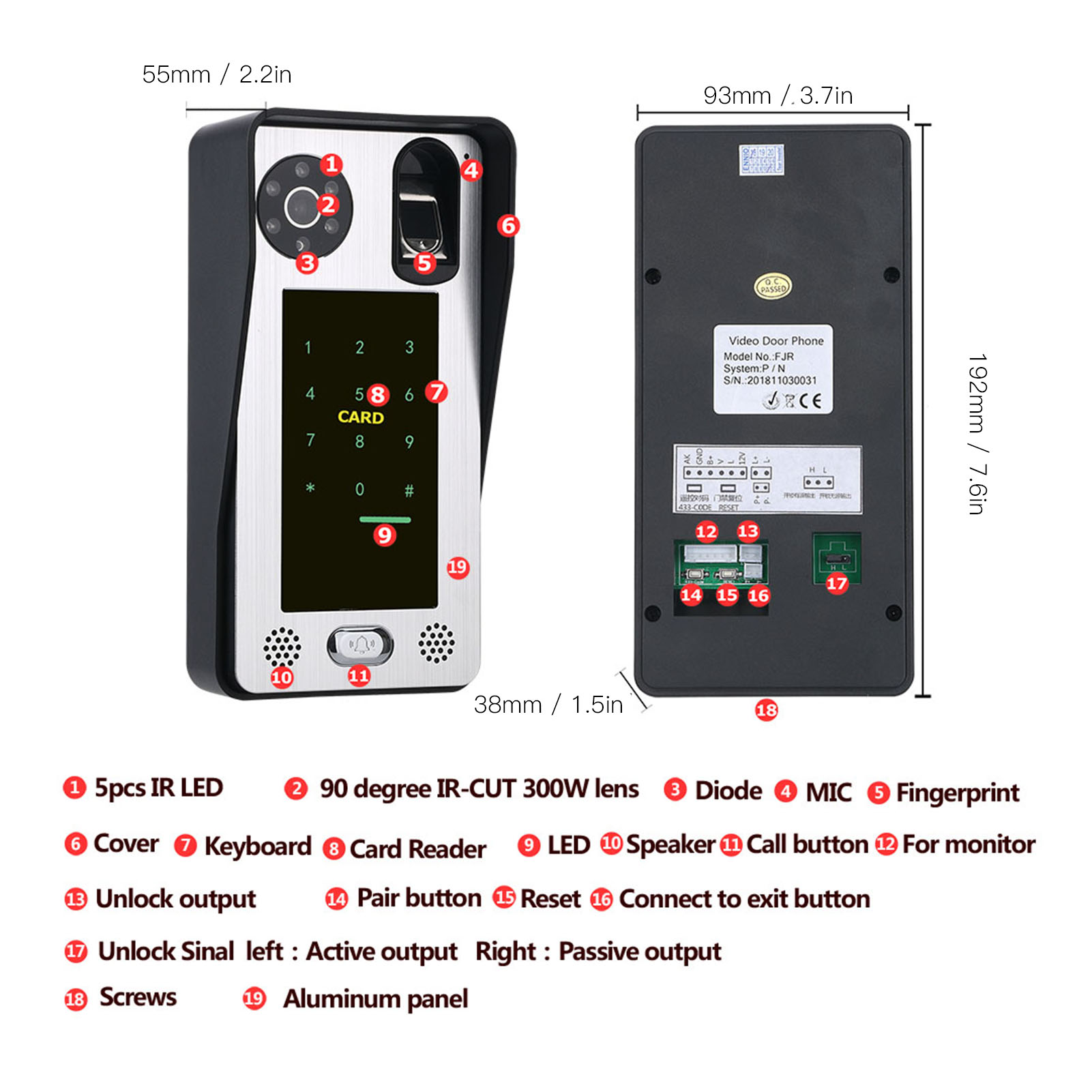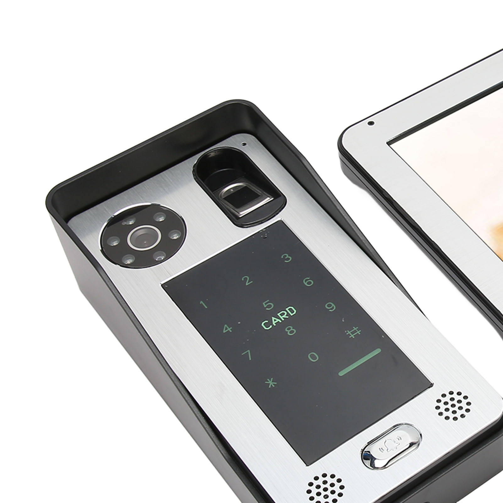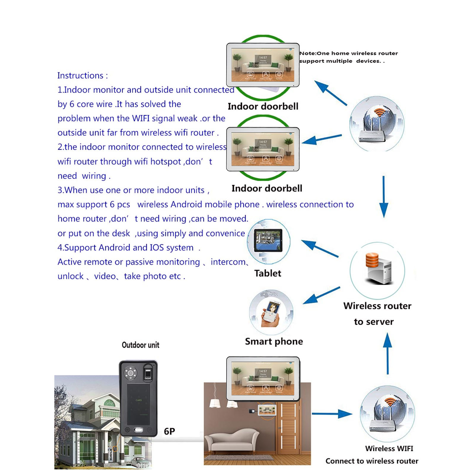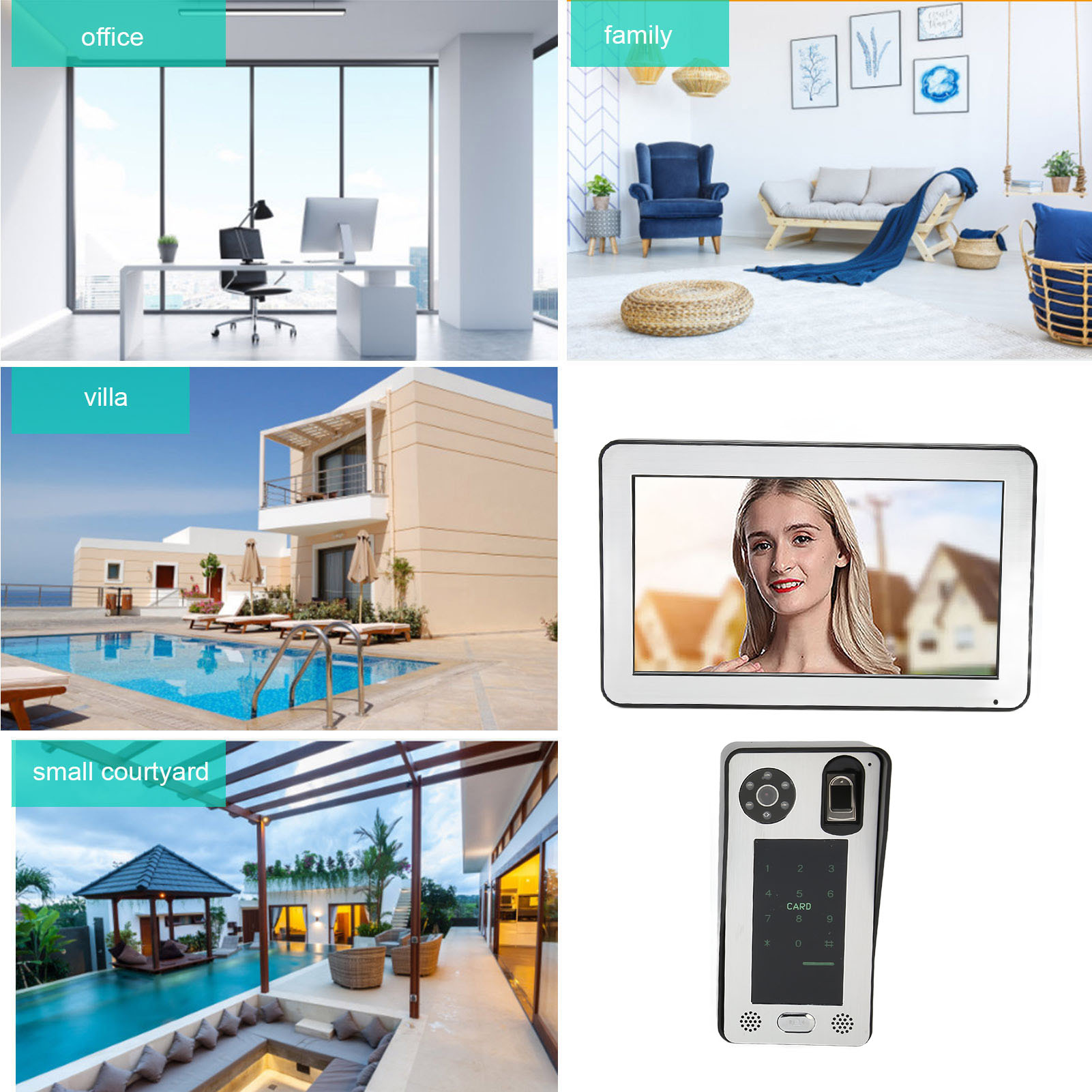 1、10 INCH TOUCH SCREEN: The indoor monitor adopts a multi point capacitive touch screen, support for Android system, 10 inch LCD display screen, with taking photos, visitor records, and calendar functions. 2、INDOOR DISPLAY FUNCTION: The indoor monitor supports manual or automatic shot, support up to 32GB small memory card(not included), the indoor monitor has intercom, unlocking, hands free, and no disturbance functions. 3、MULTI DEVICE CONNECTION: The indoor monitor can support connecting 8 mobile app users, support for IOS and for Android mobile system, with good compatibility, can also be viewed and unlocked through the phone. 4、UNLOCKING METHODS: Supports 500 fingerprints, 1000 IC card unlocking, password unlocking, and 99 remote control unlocking to meet more usage requirements. 5、CAMERA FUNCTION: The indoor monitor supports AHD 720P camera input, supports 2CH AHD doorbell and 2CH AHD security camera, with high definition image display. 6、ALUMINIUM ALLOY PANEL: The intercom doorbell panel is made of aluminum alloy material, wear and oxidation resistance, with a weatherproof cover, and supports wall mount installation.