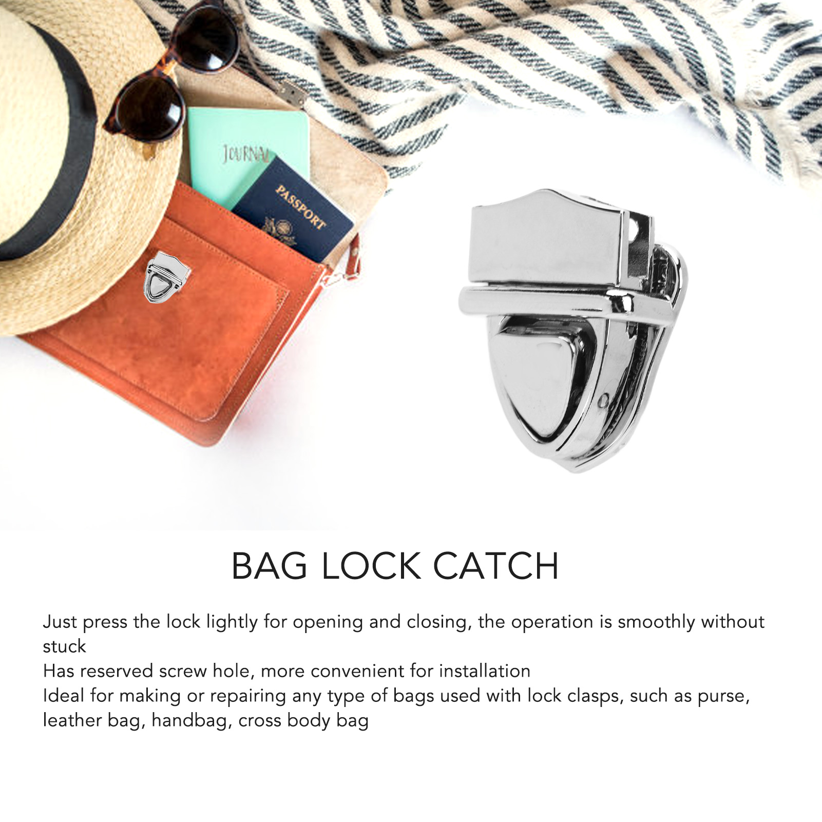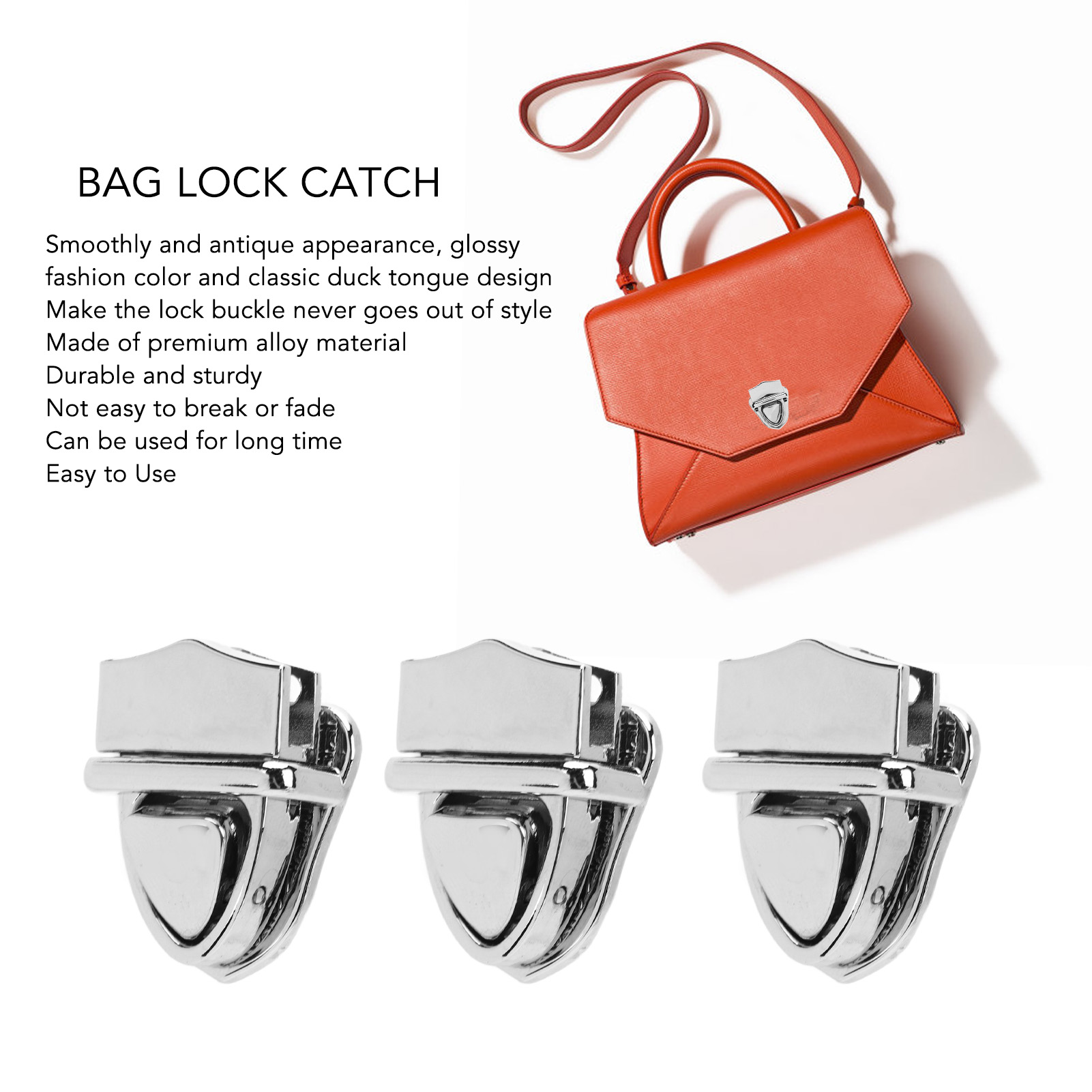1、Classic Design: Smoothly and antique appearance, glossy fashion color and classic duck tongue design makes the lock never goes out of style. 2、Premium Alloy Made: Made of premium alloy material, durable and sturdy, not easy to break or fade, can be used for long time. 3、Easy to Use: Just press the lock lightly for opening and closing, the operation is smoothly without stuck. 4、Simple Installation: The lock buckle has reserved screw hole, which is more convenient for installation. 5、Multi Purpose: Ideal for making or repairing any type of bags used with lock clasps, such as purse, leather bag, handbag, cross body bag.